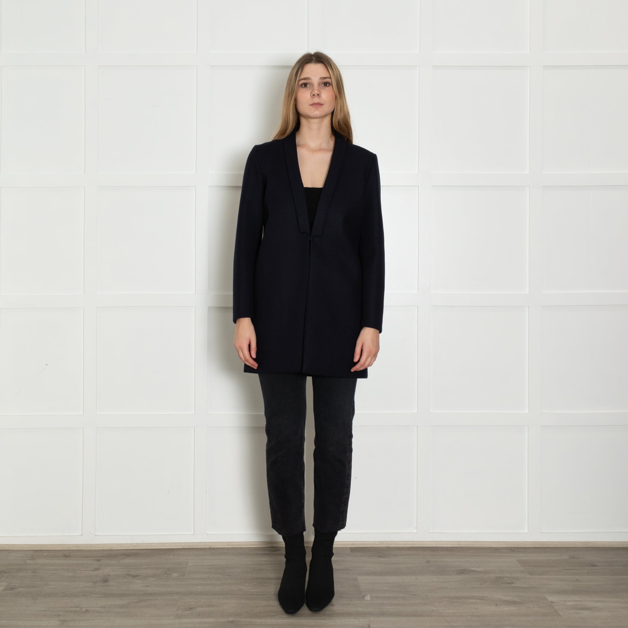 Brunello Cucinelli long-sleeve navy neoprene blazer, featuring a stunning long folded collar, with a button-up front deisgn and embroidered hem lines.