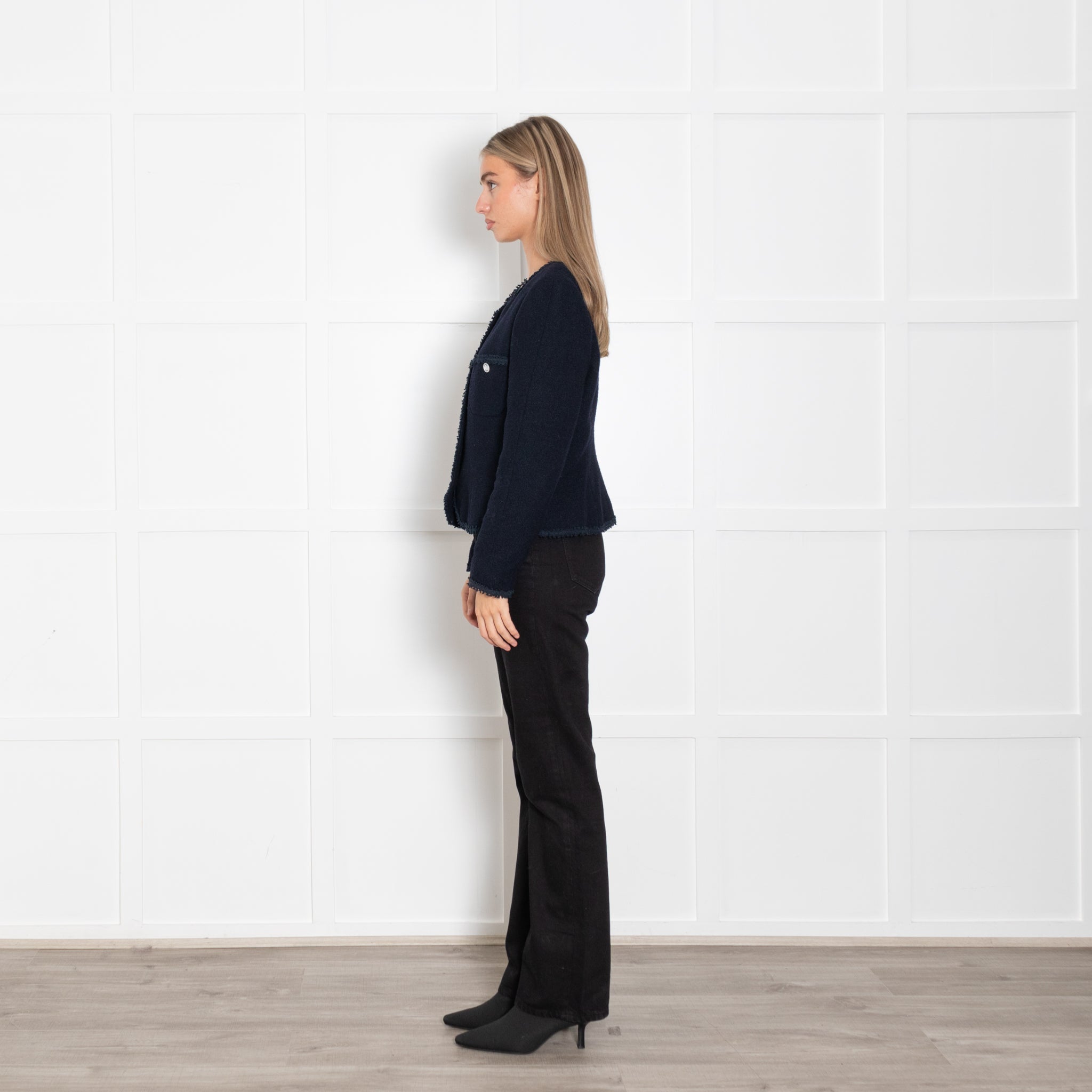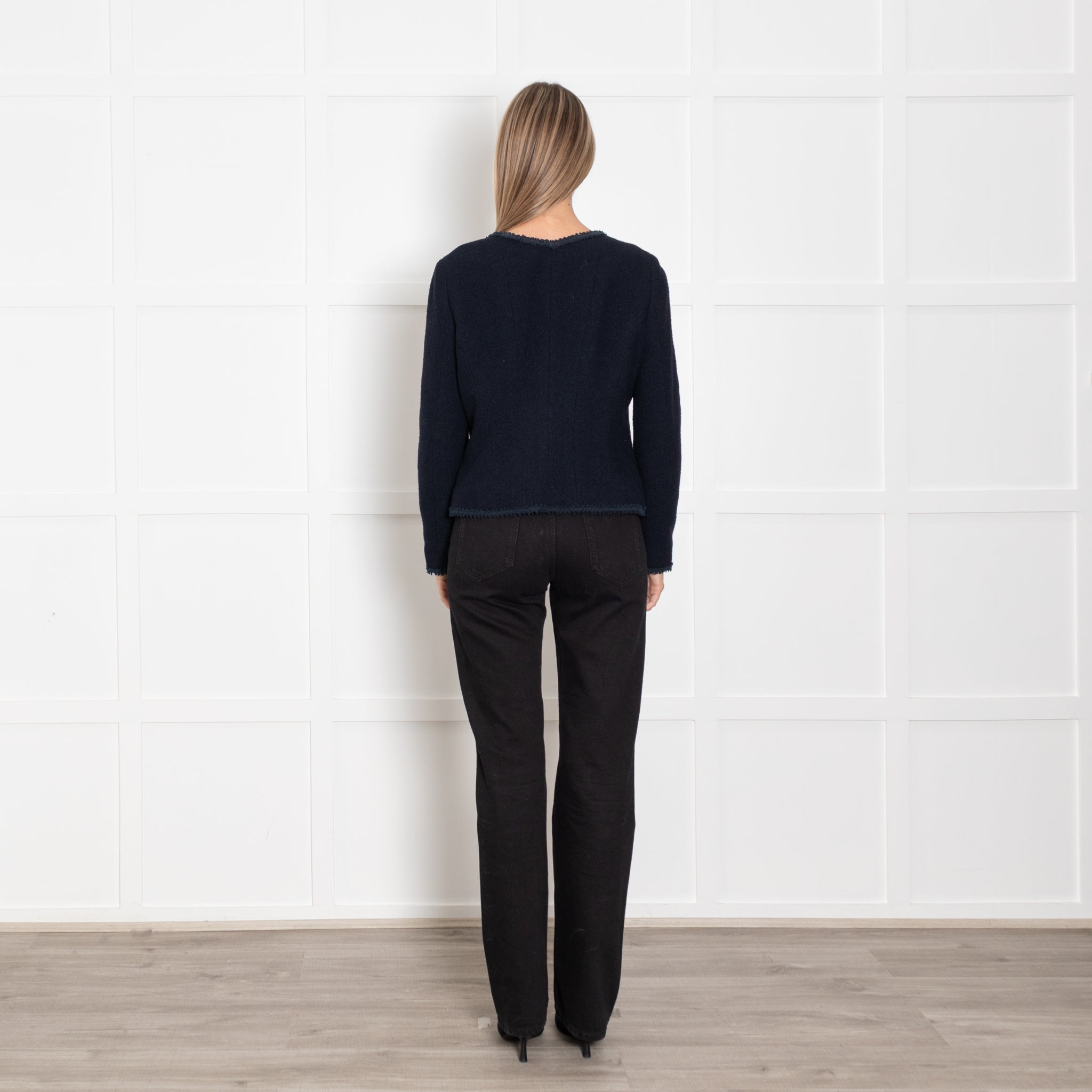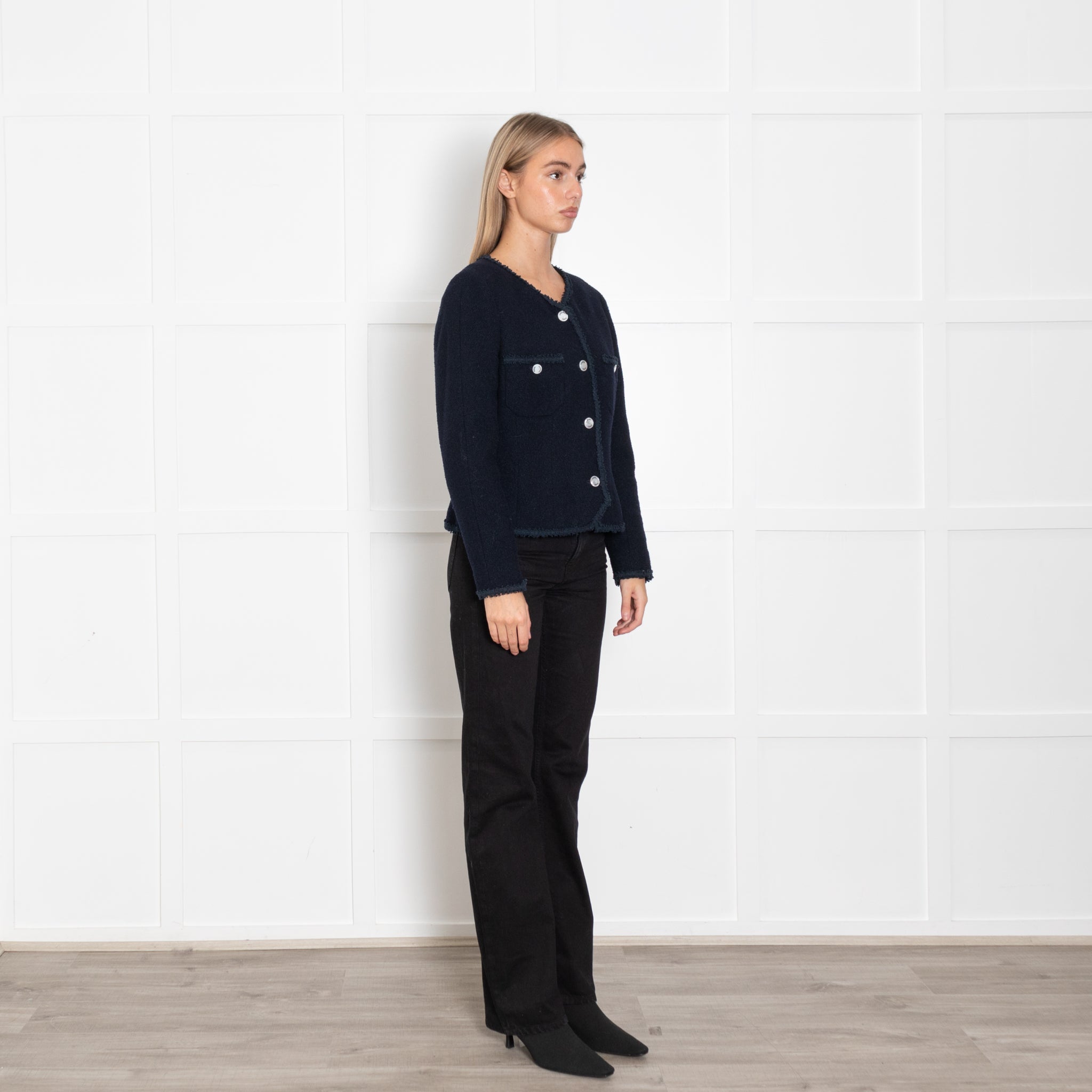 Chanel (1997) vintage navy long-sleeve elegant jacket, crafted with gorgoues cotton exterior, a silk interior lining, featuring a woven knit deisgn with a rounded frayed neckline, two rounded chest pockets, with white Chanel buttons as well as two white front button-up closures.