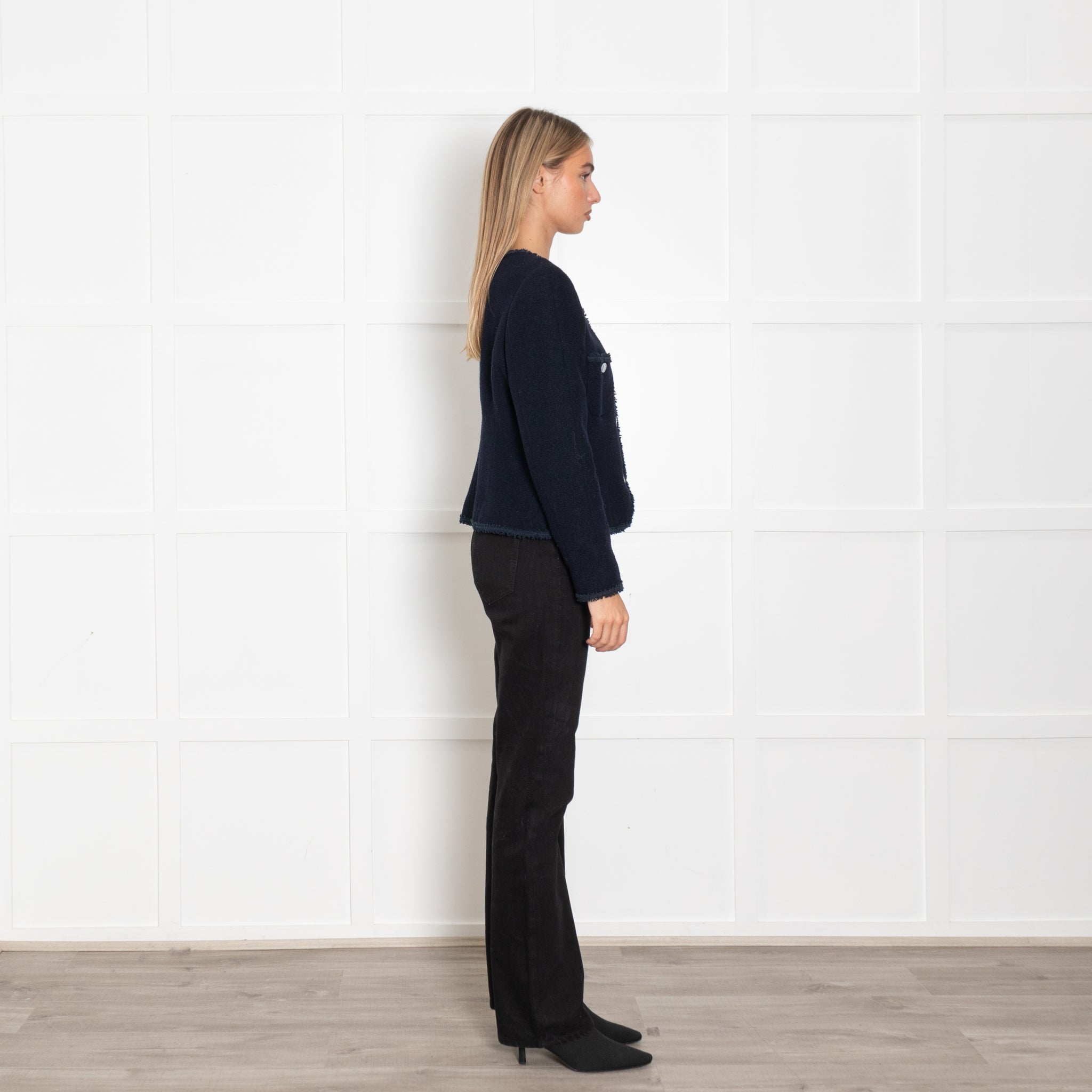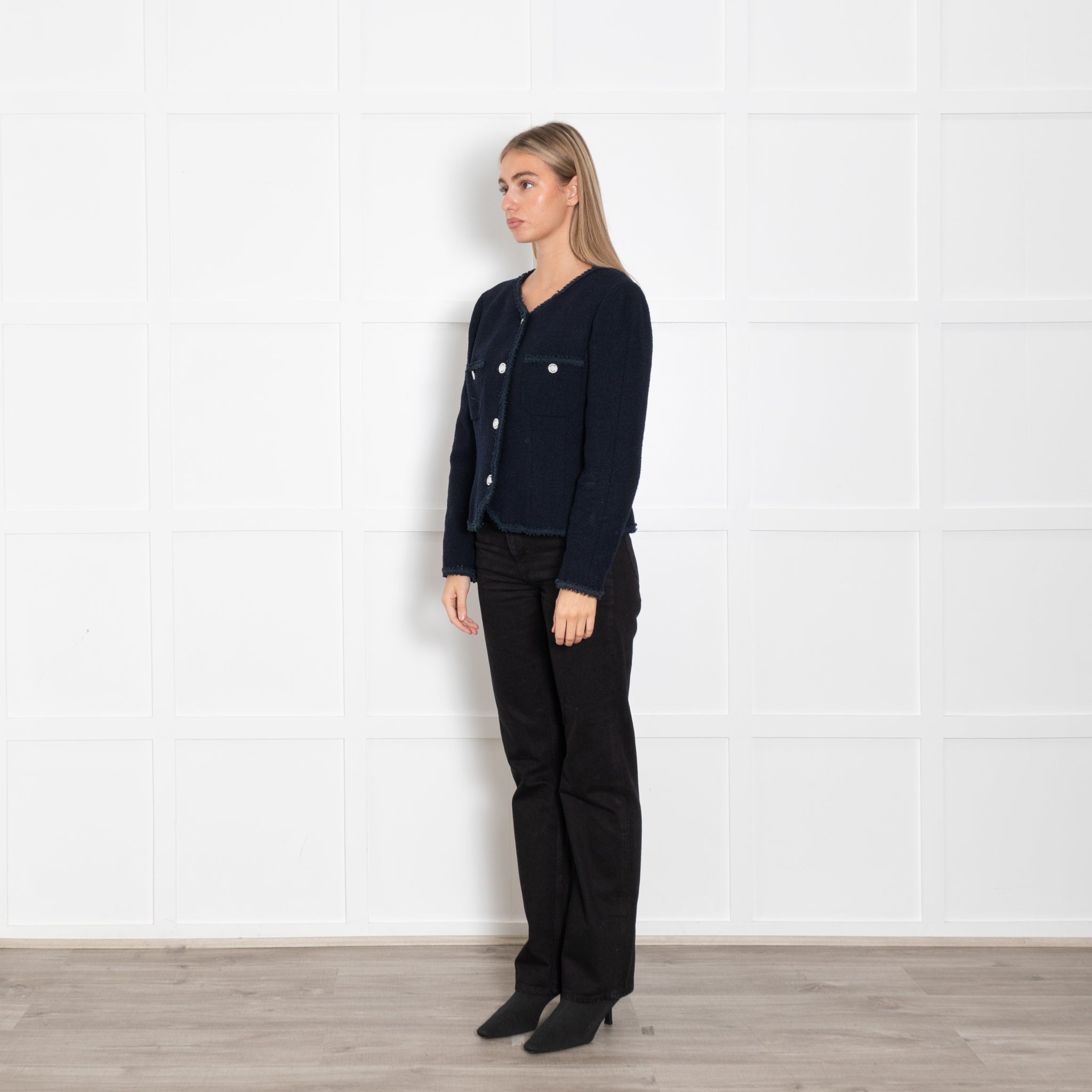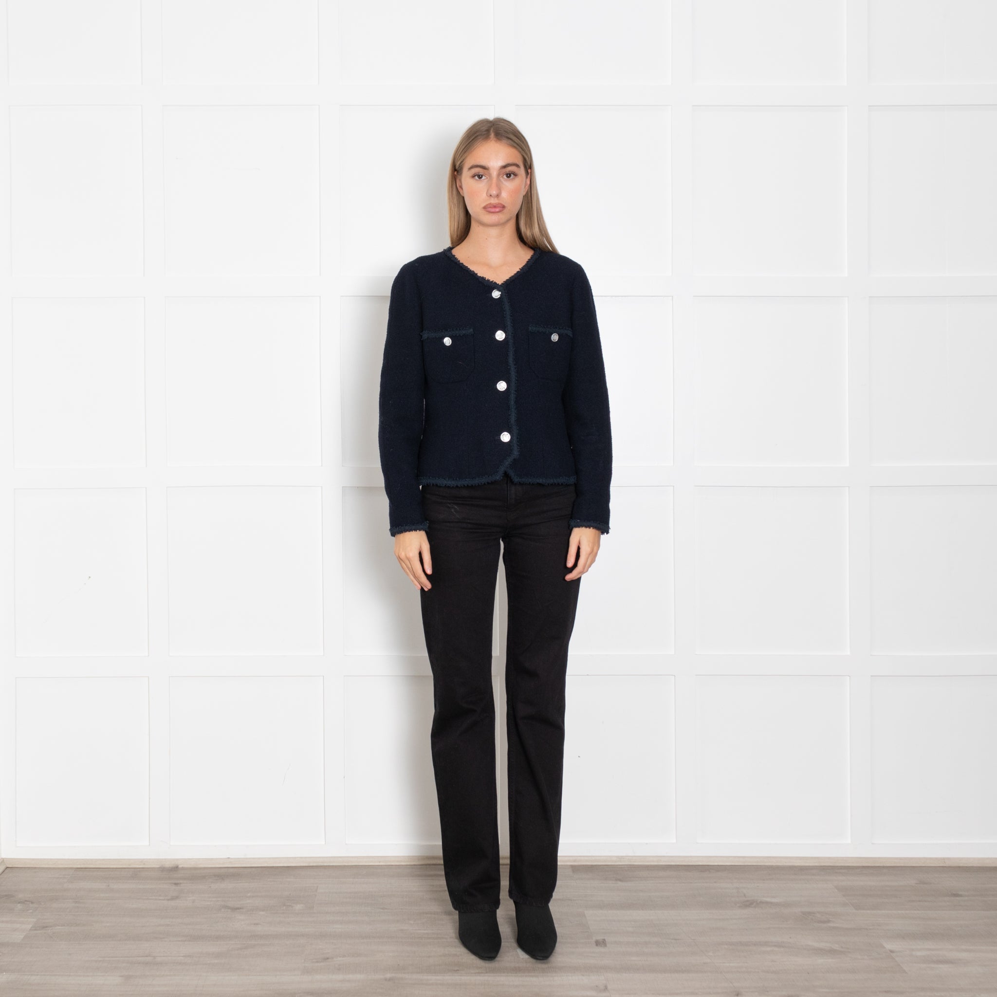 Chanel (1997) vintage navy long-sleeve elegant jacket, crafted with gorgoues cotton exterior, a silk interior lining, featuring a woven knit deisgn with a rounded frayed neckline, two rounded chest pockets, with white Chanel buttons as well as two white front button-up closures.