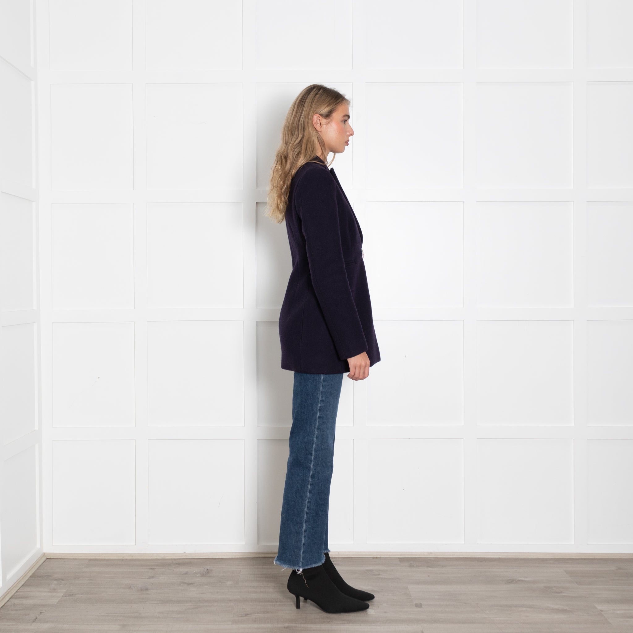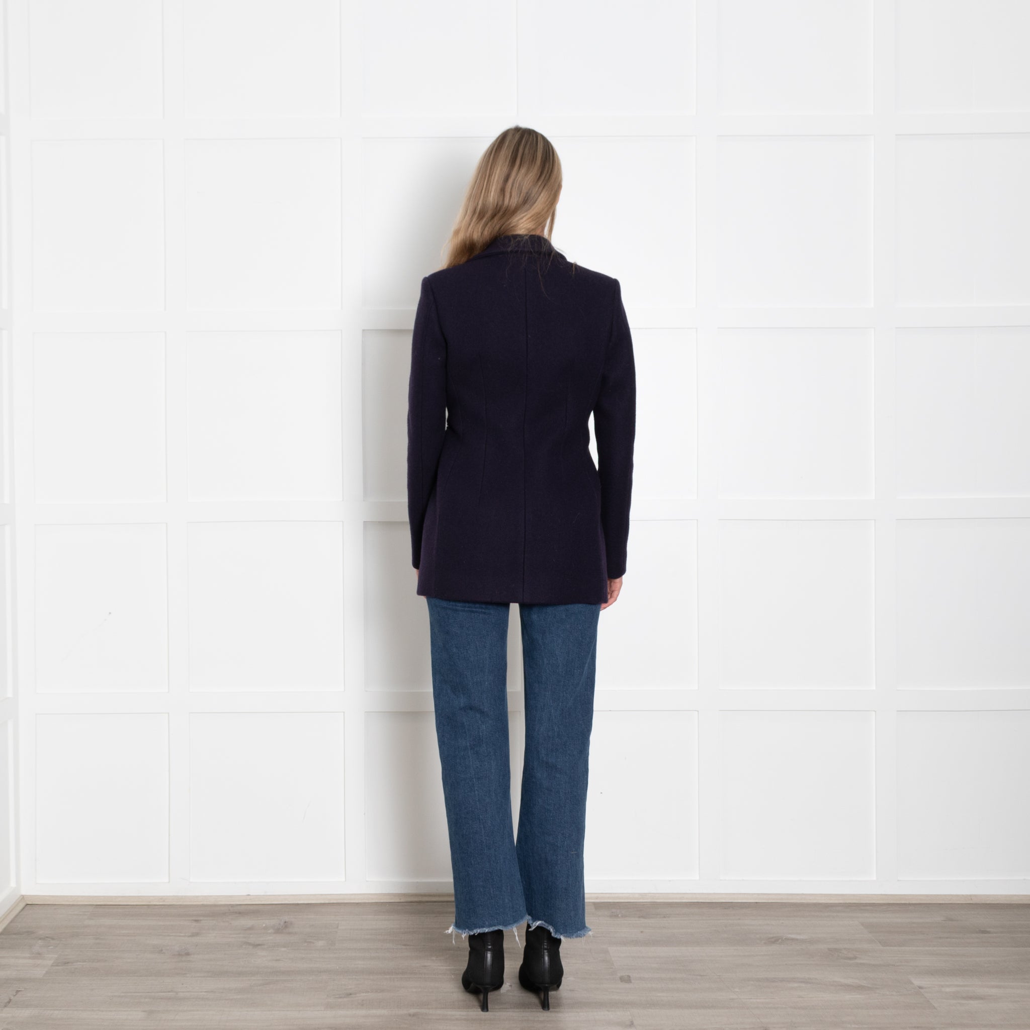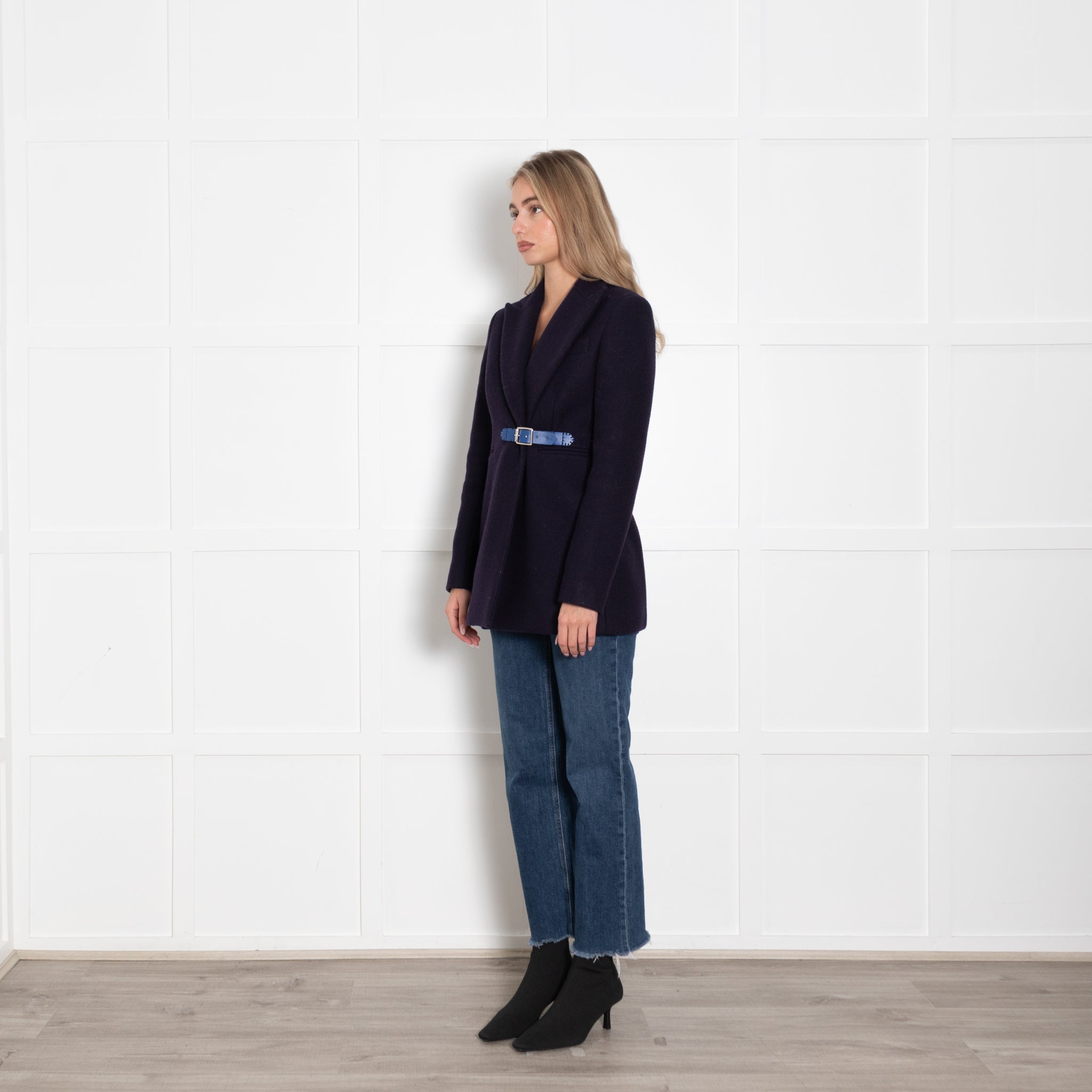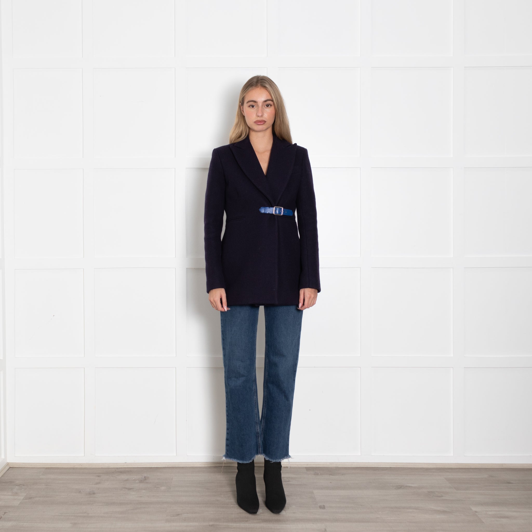 Christopher Kane navy wool jacket with cobalt blue leather buckle detailing to fasten.