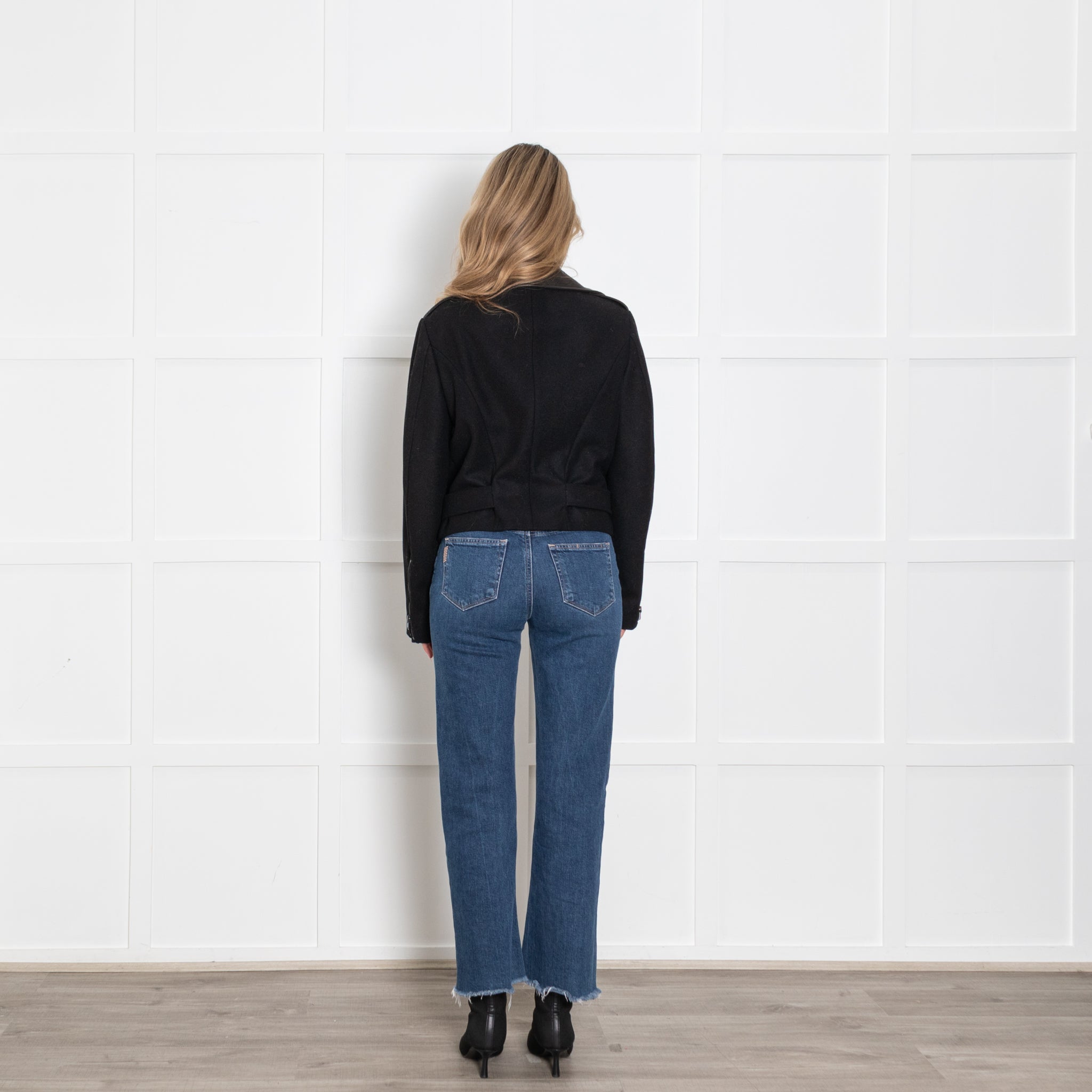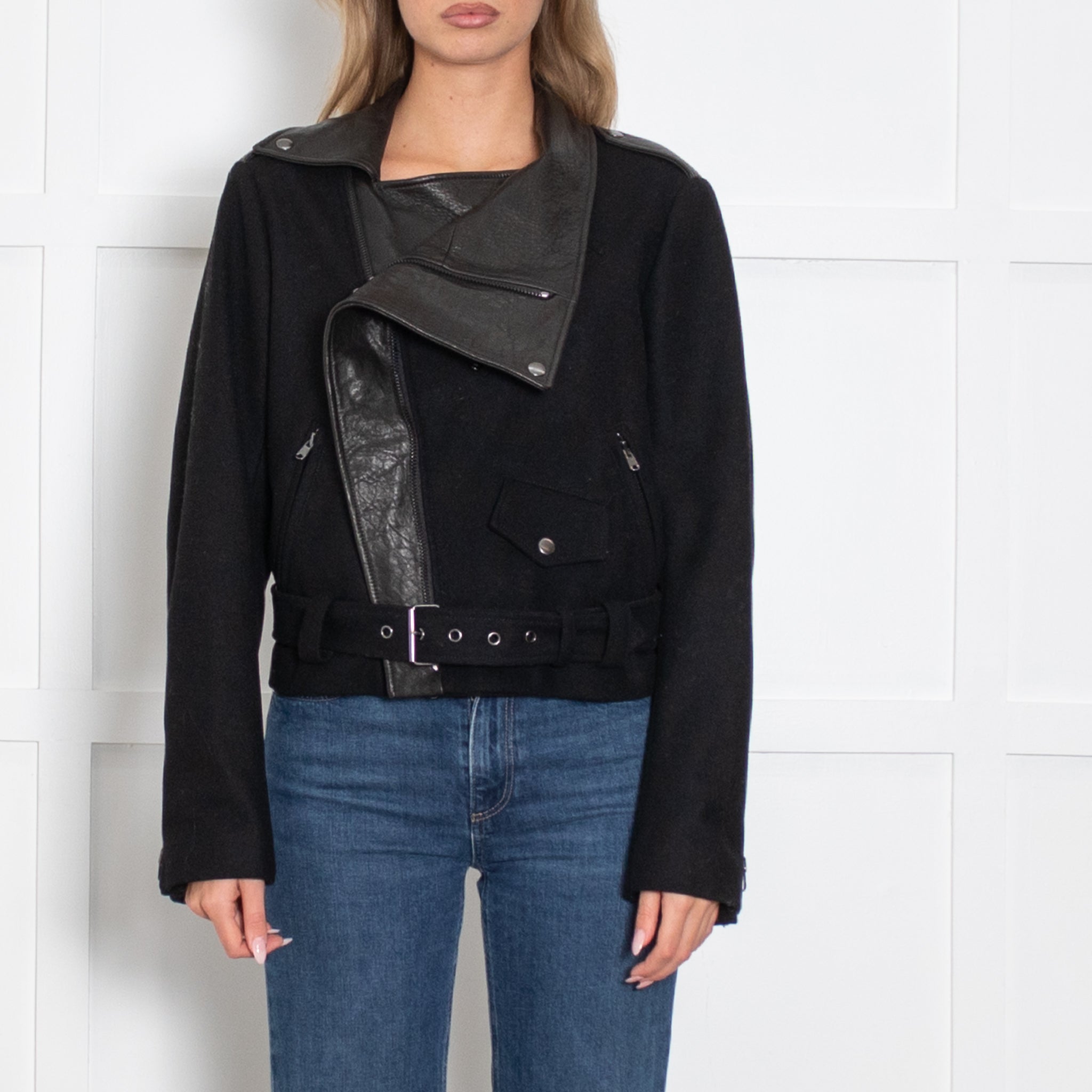 Donna Karan biker jacket, crafted with a stunning wool and leather material, featuring two long sleeves, two front zipped pockets, a single silver zipped front closure, and a classic leather collar, with button accent pieces as well as a matching belt.
