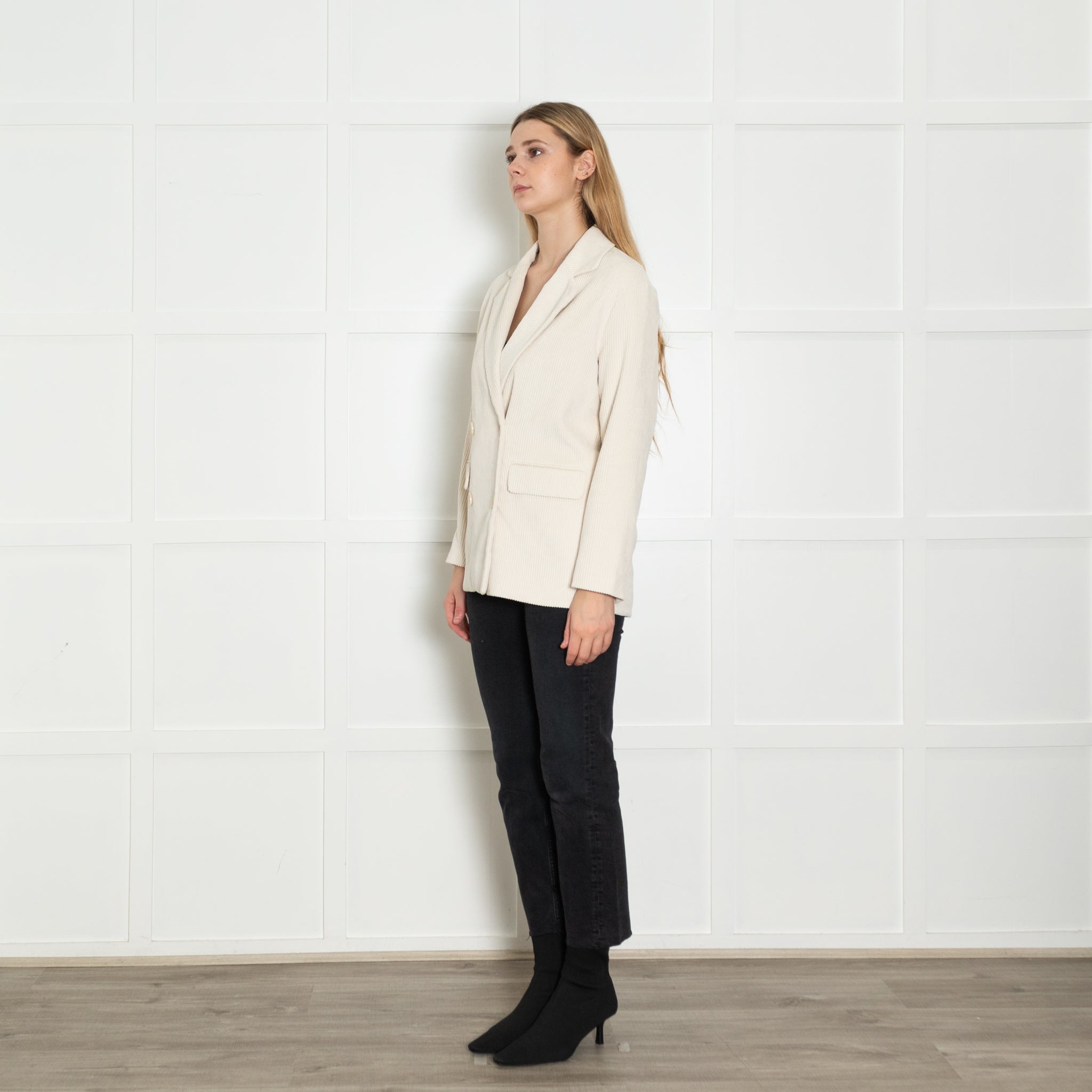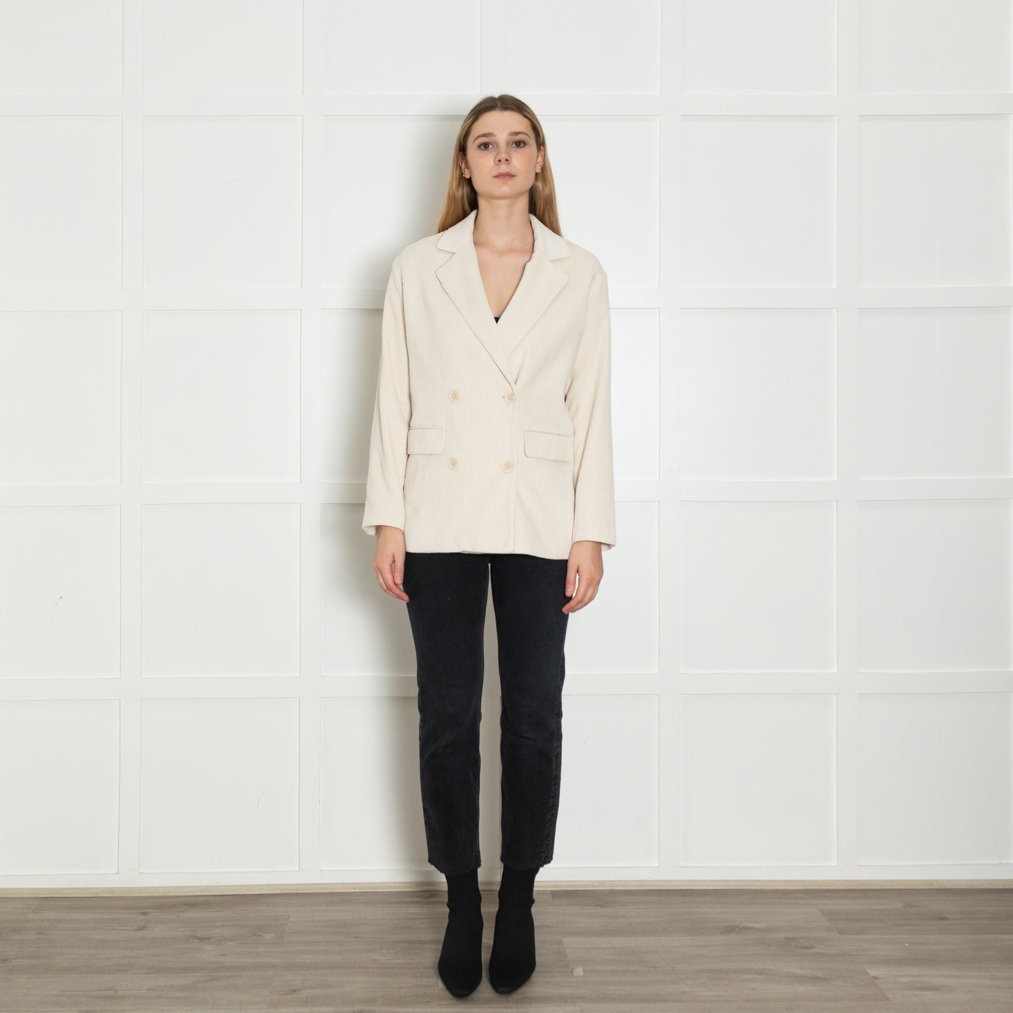 Essentiel Antwerp cream oversized corduroy blazer featuring long lapel collars, symmetrical front buttons, and flap side pockets.