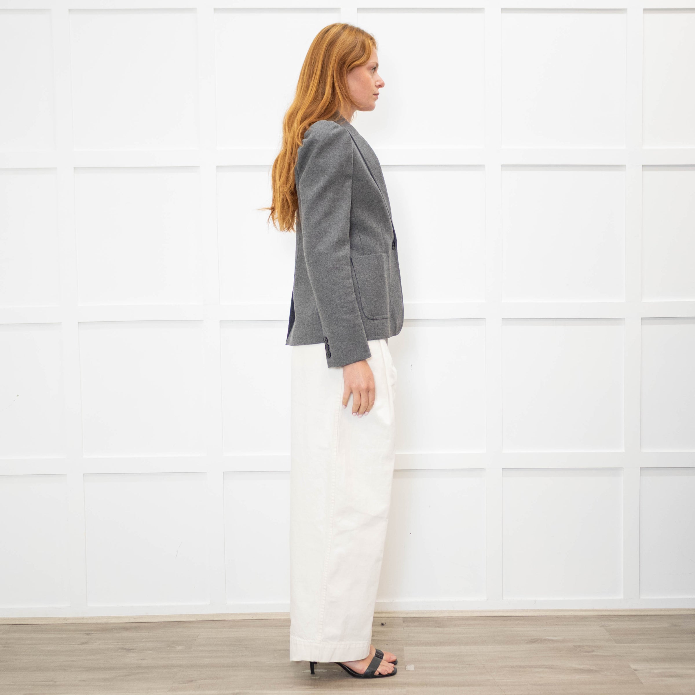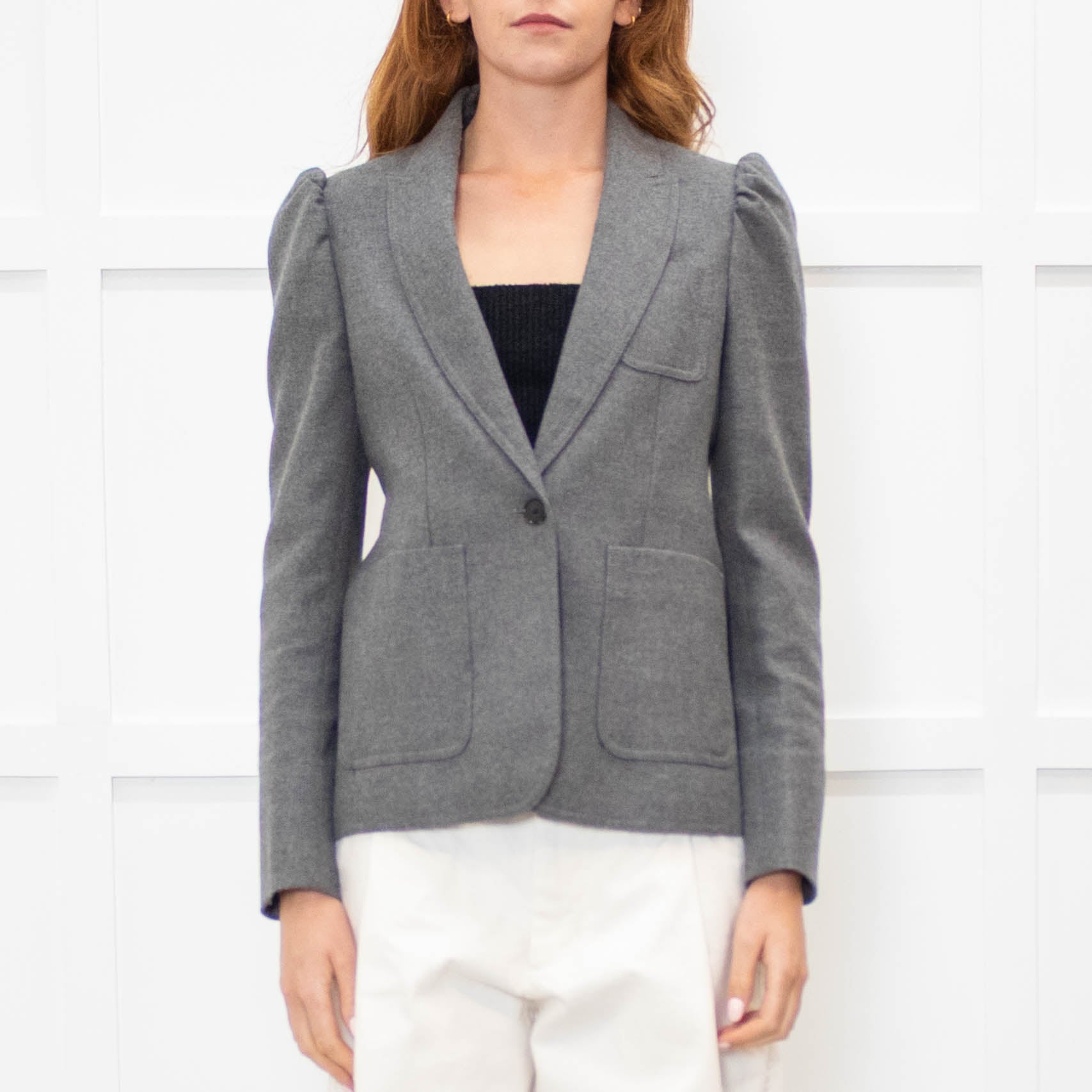 Me + Em grey gathered shoulder blazer jacket with a notch collar and lapel, long sleeves, two front patch pockets, and a single button fastener.