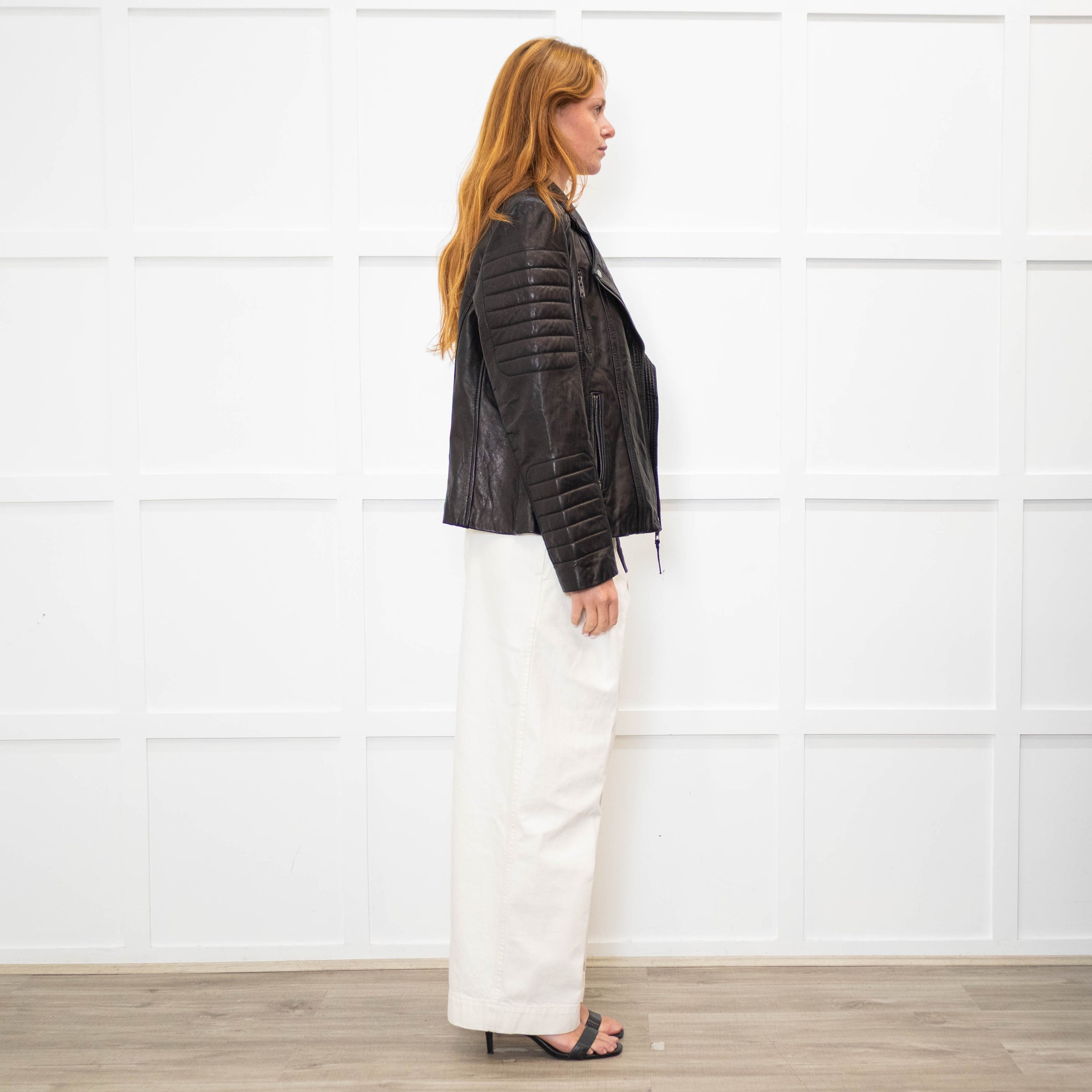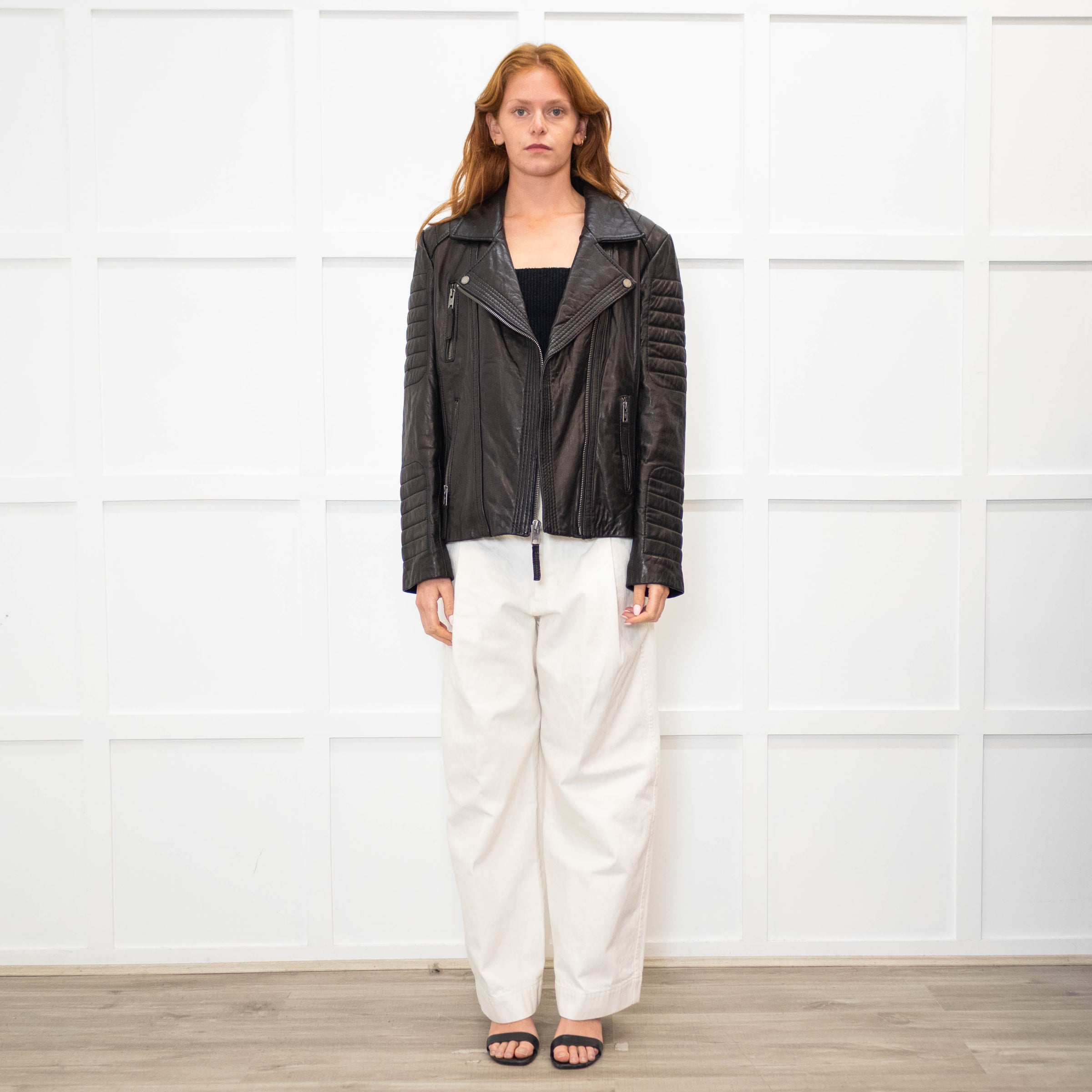 Michael By Michael Kors black leather biker jacket with quilted panels, a zip-up front, long sleeves, three front zipped pockets, and a full lining.