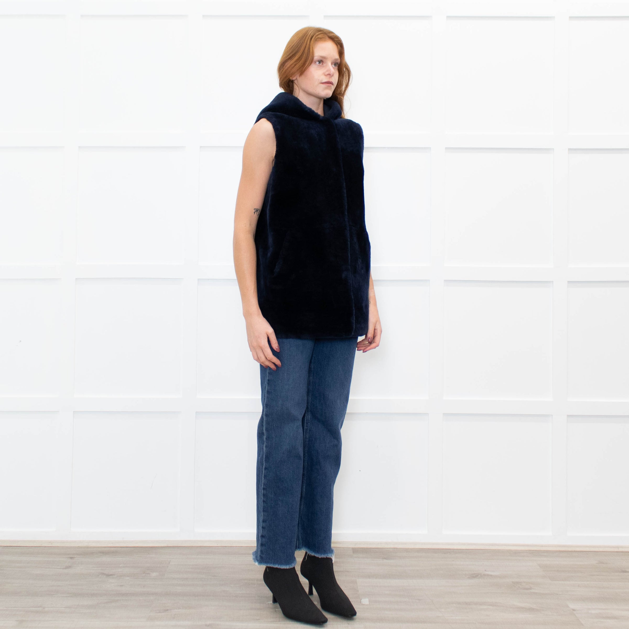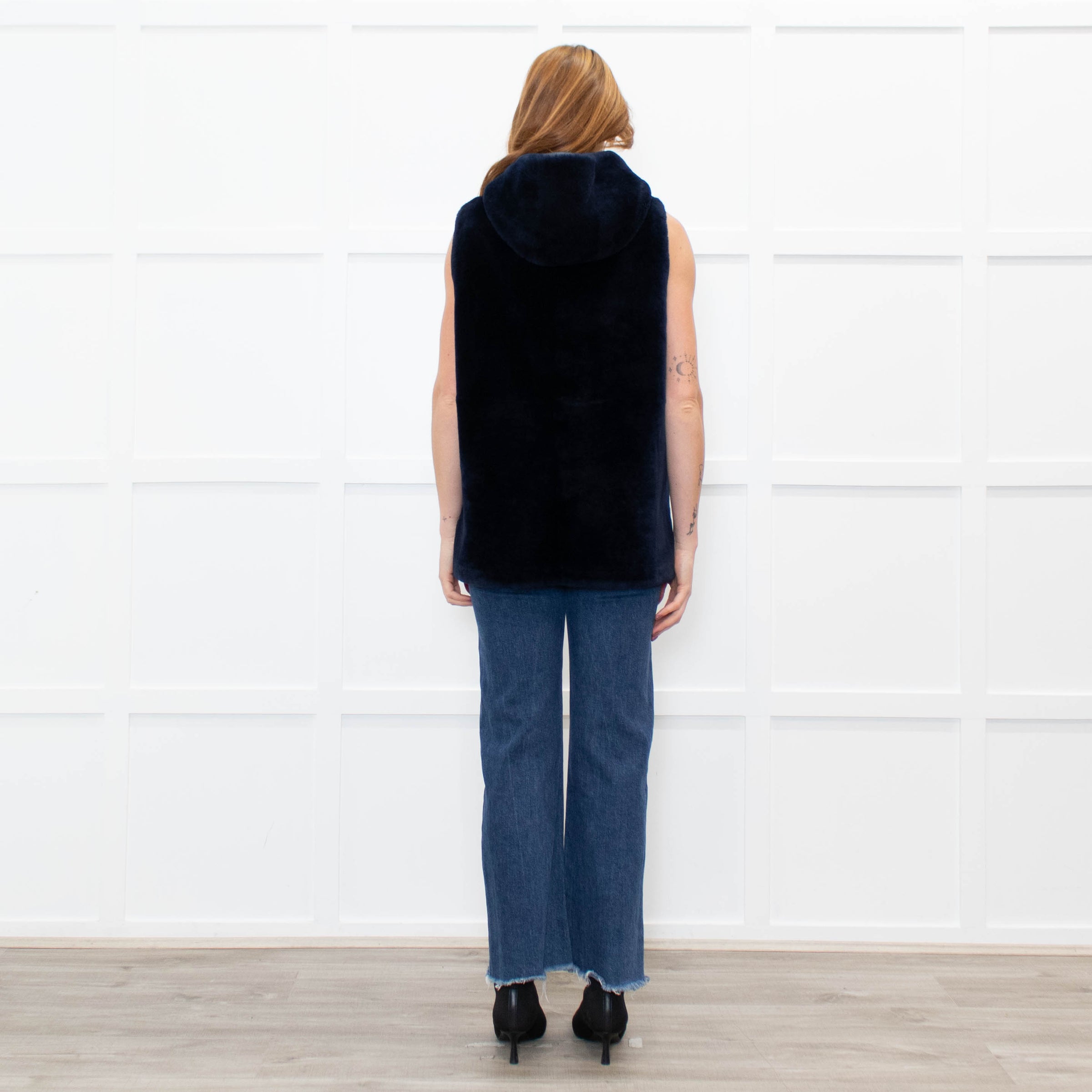 Sprung Freres navy blue reversible shearling hooded gilet with hook and eye fasteners, and side slip pockets.