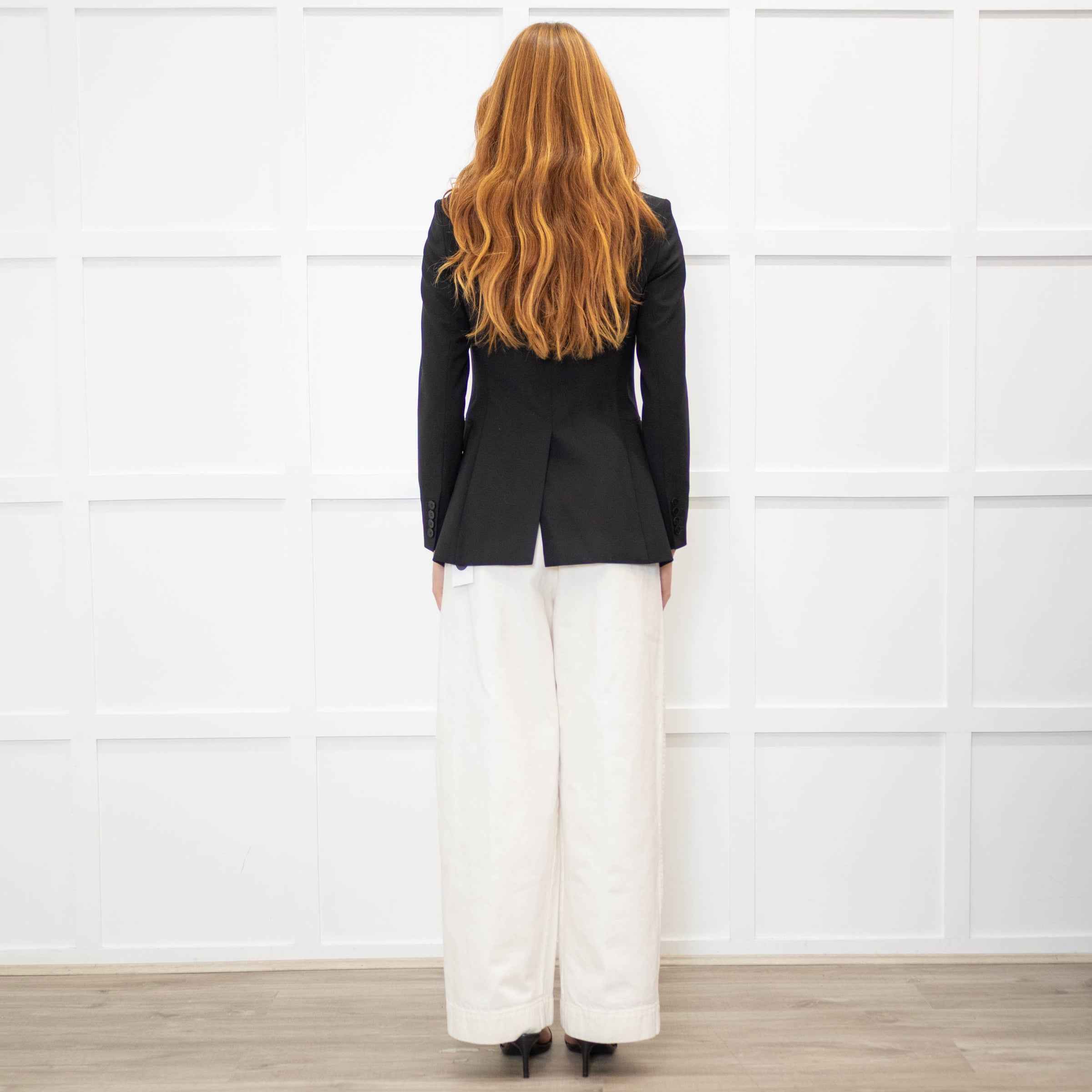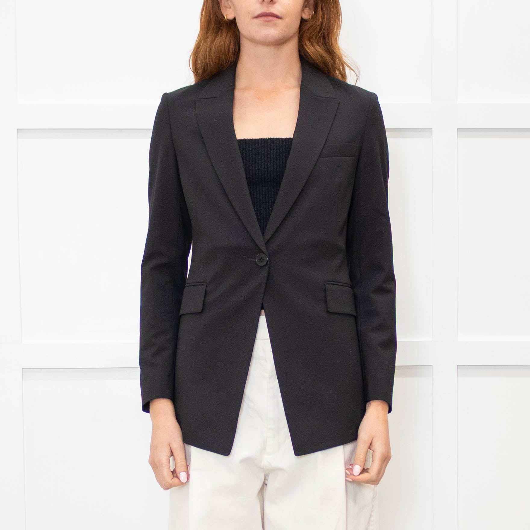 Theory black single-breasted tuxedo-style blazer jacket with a notch collar and lapel, long sleeves, buttoned cuffs, two side slip pockets, and a full lining. With the original tags RRP £440.