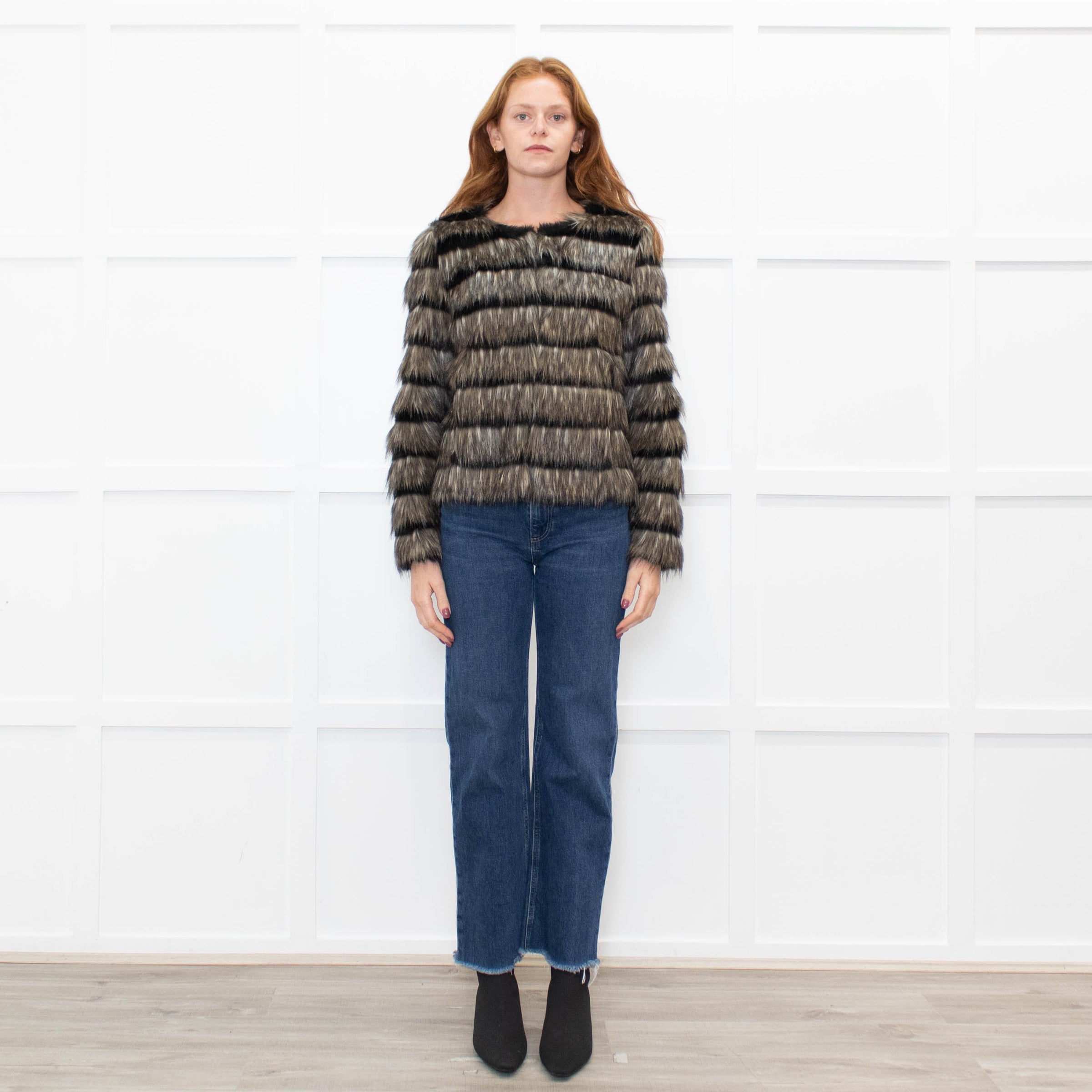 Unreal Fur black cream and khaki raccoon-style faux fur jacket in a collarless design with long sleeves, a full lining, and hook and eye closures down the front.