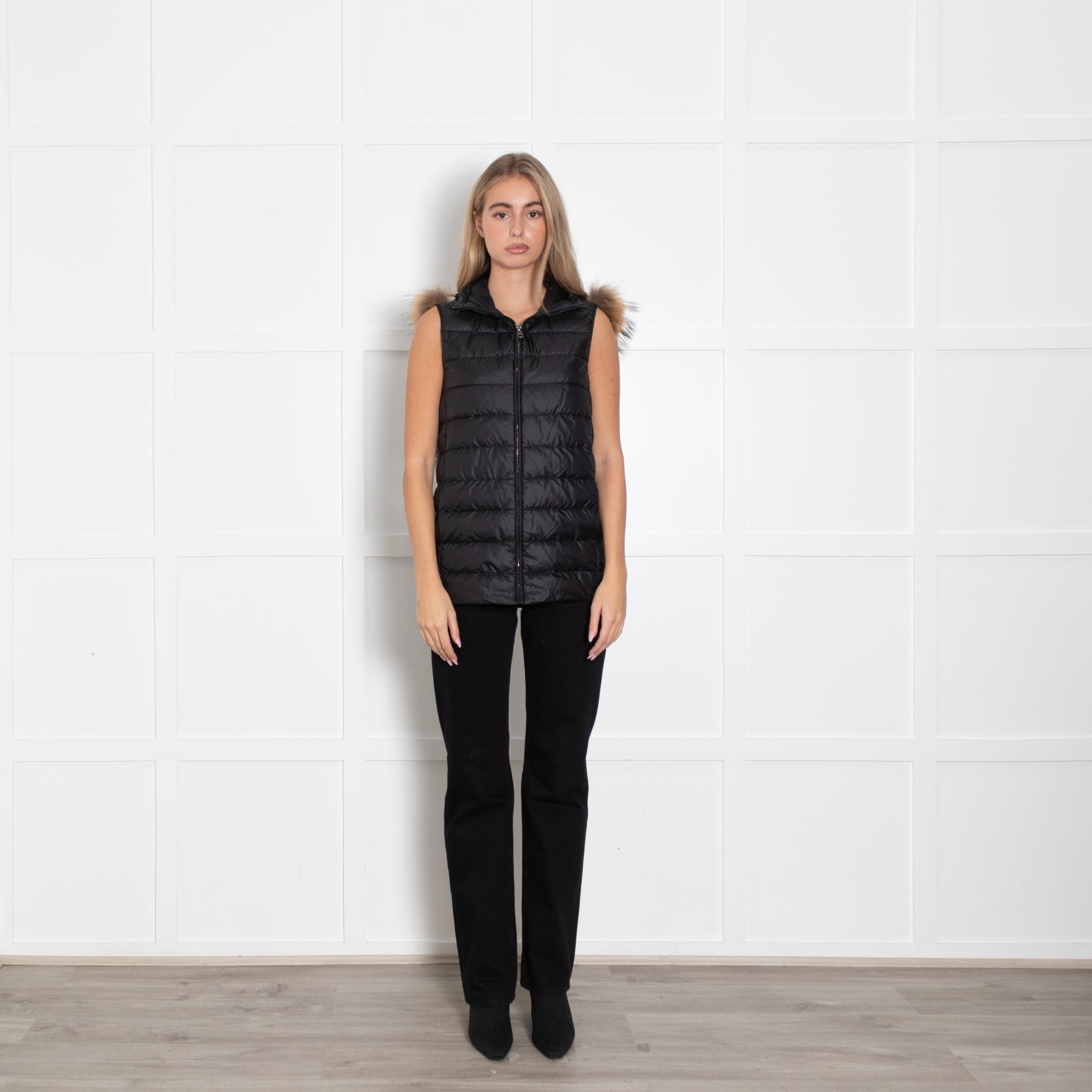 Weekend Max Mara Black Light Weight Fur Trim Hooded Gilet