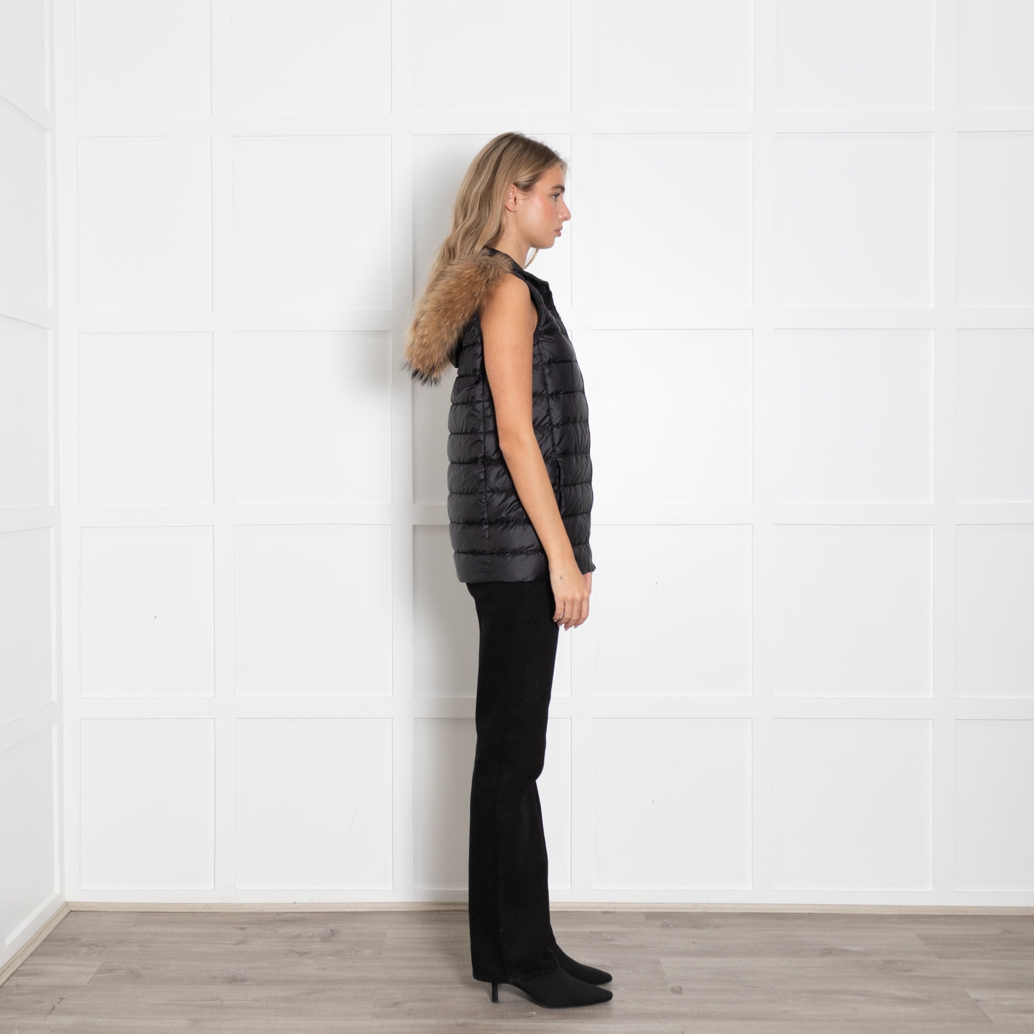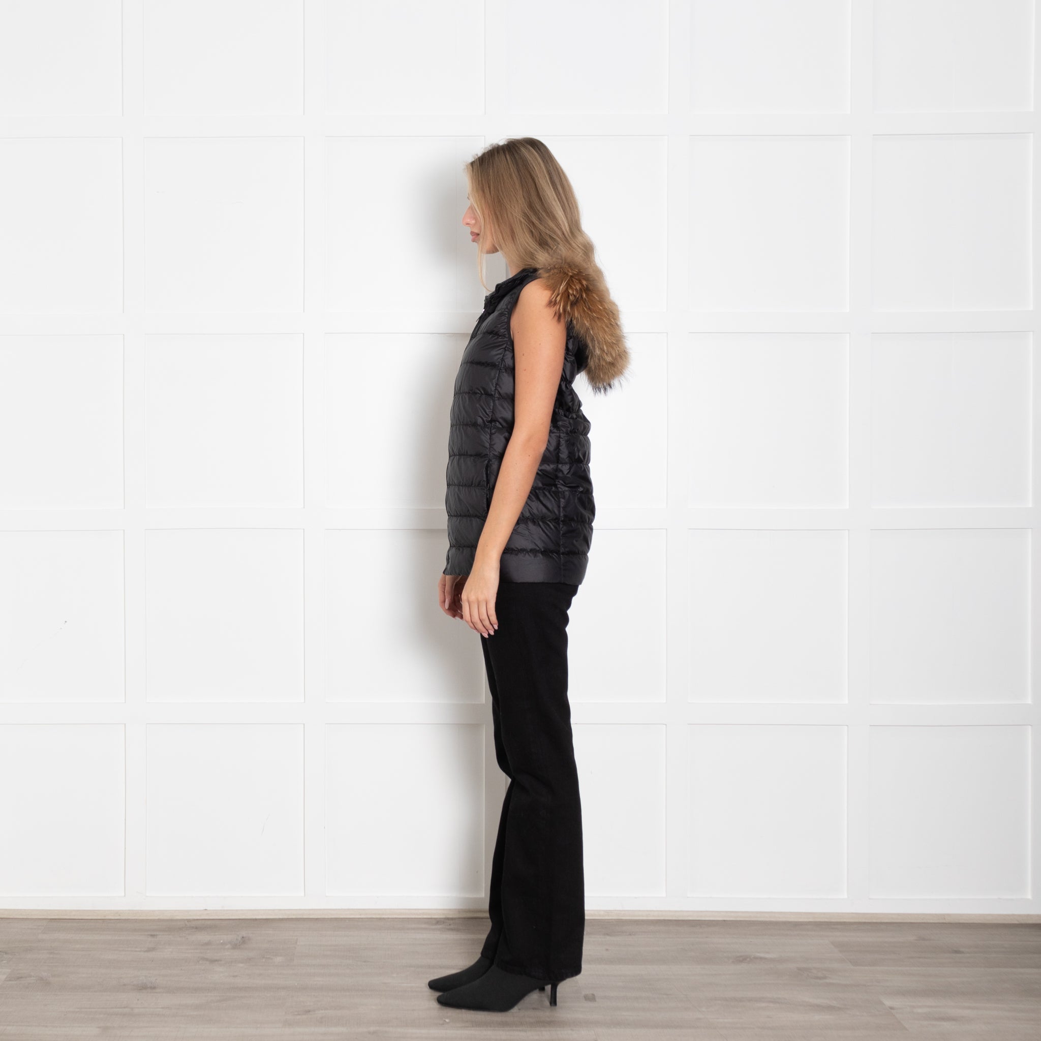 Weekend Max Mara black lightweight quilted gilet featuring a fur trim around the hood.