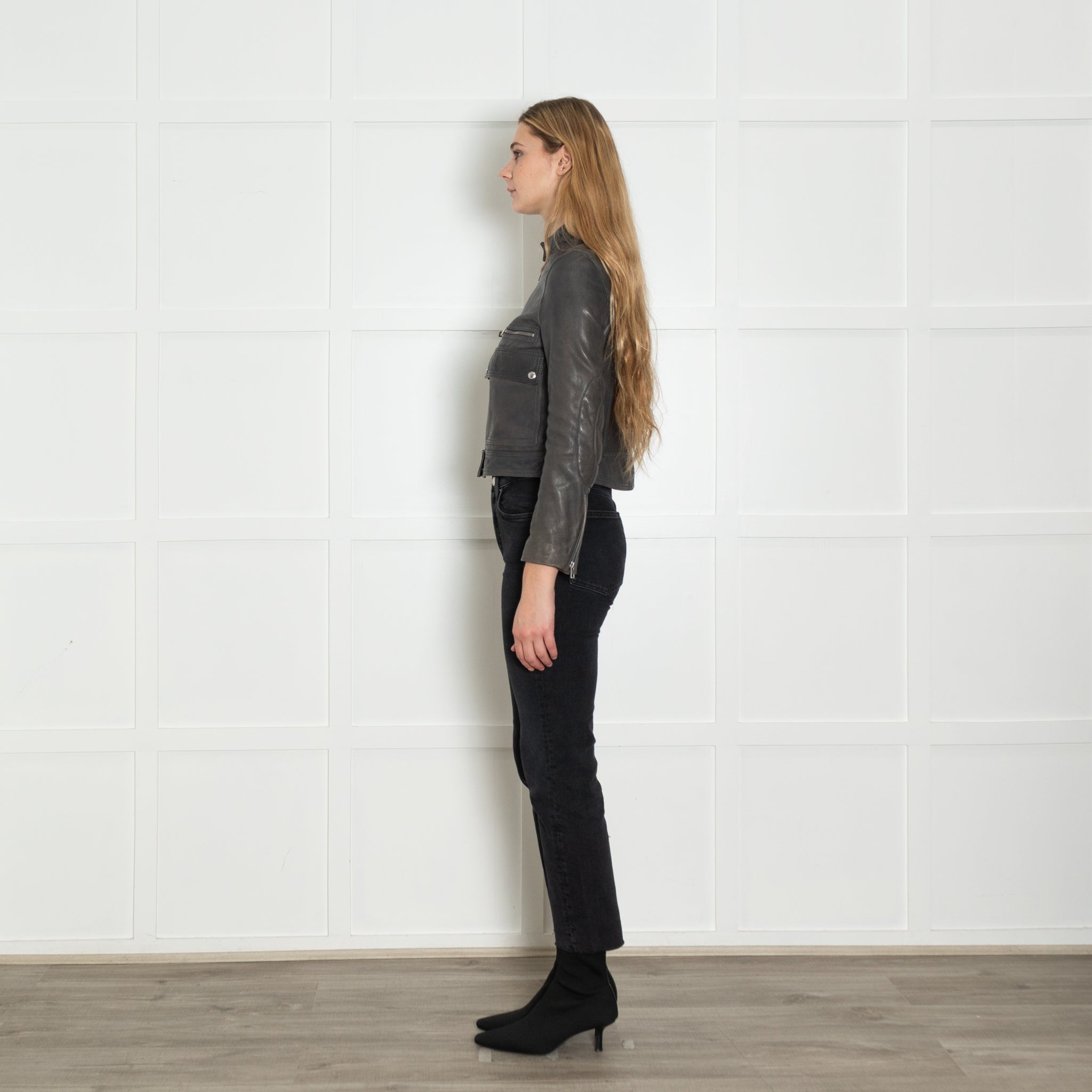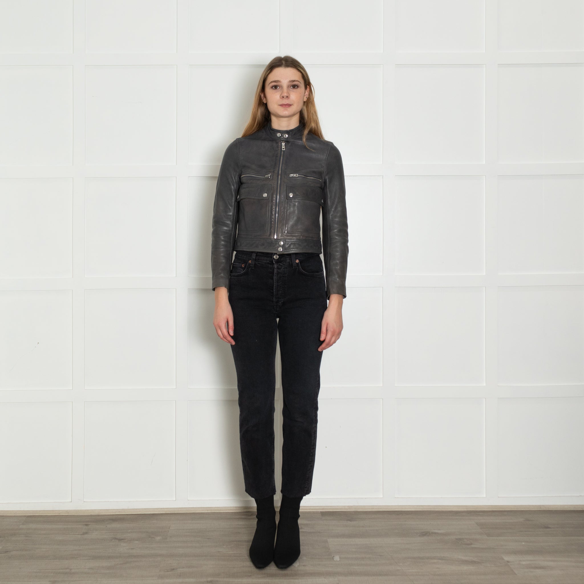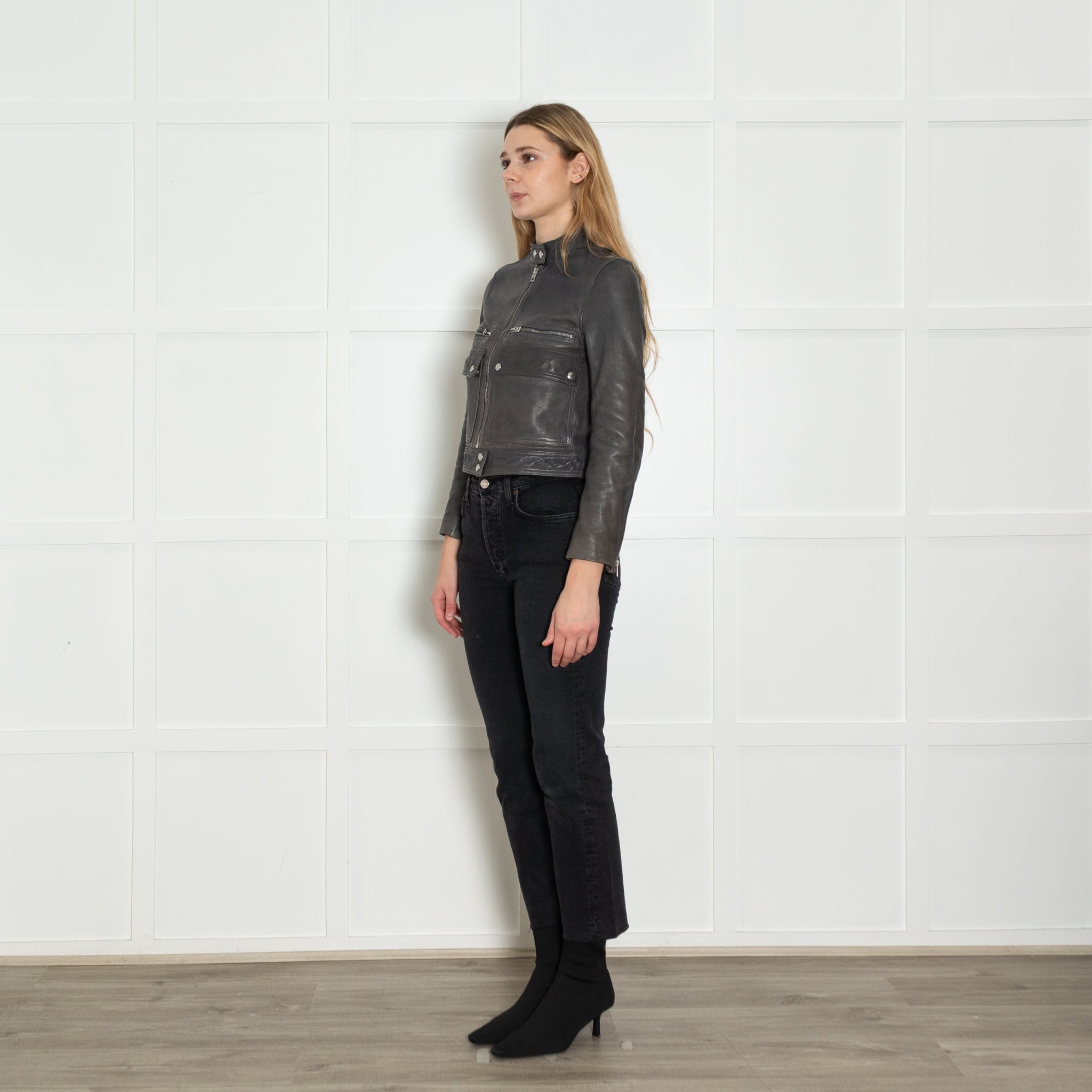 Zadig & Voltaire grey leather long-sleeve jacket, crafted with sheep leather, featuring a silver front zip-up design, with two front zipped chest pockets, and two flap pockets. This jacket has beautifully embroidered elbow designs, as well as two short sleeve zips and a buttoned neckline.