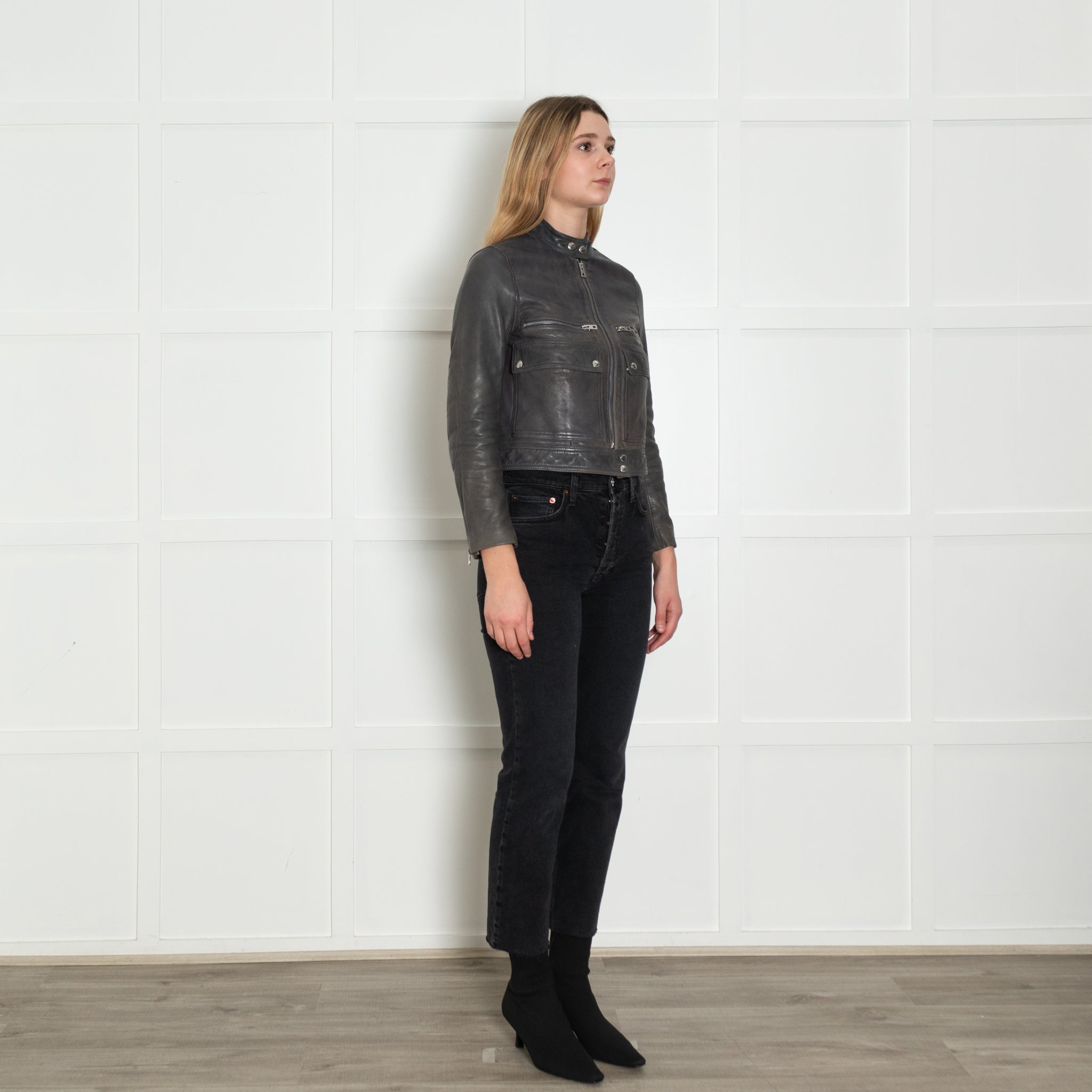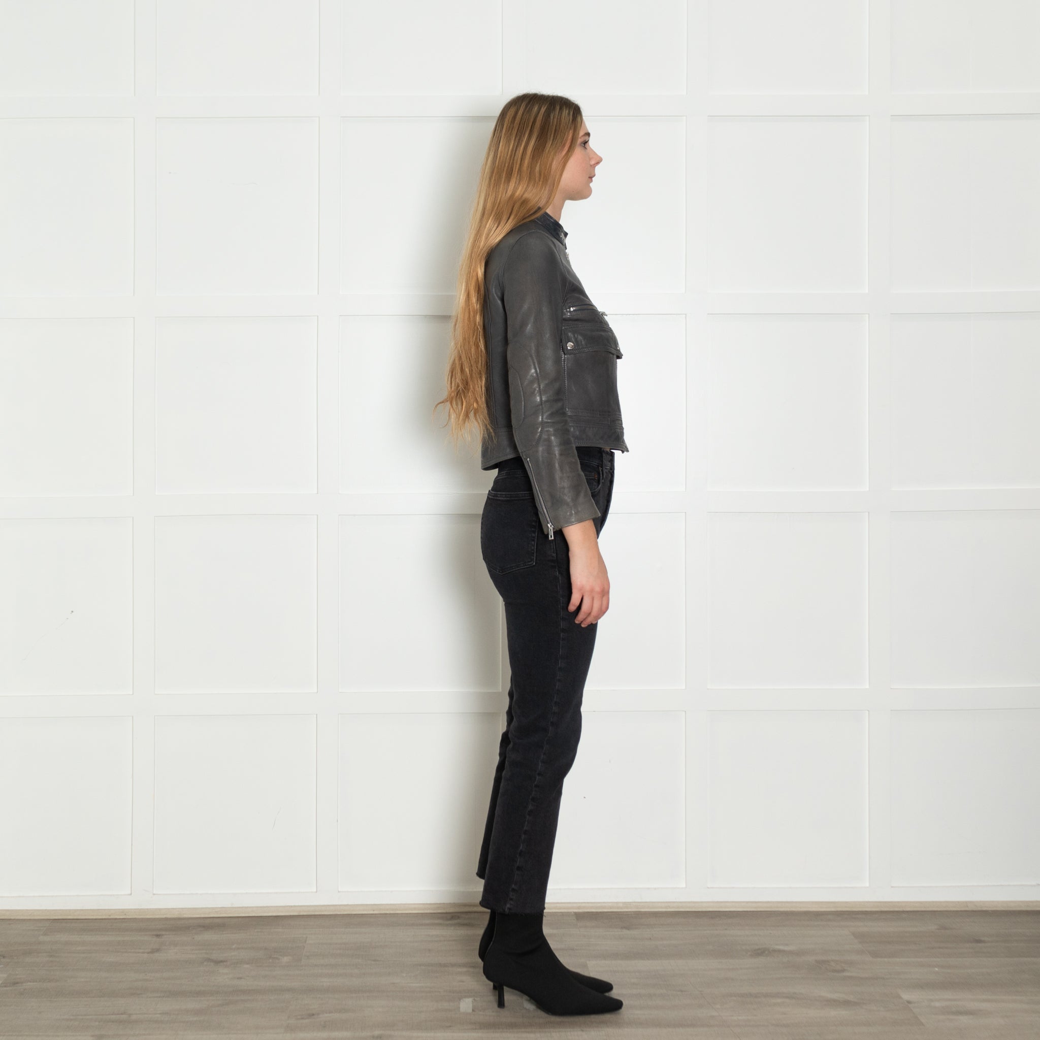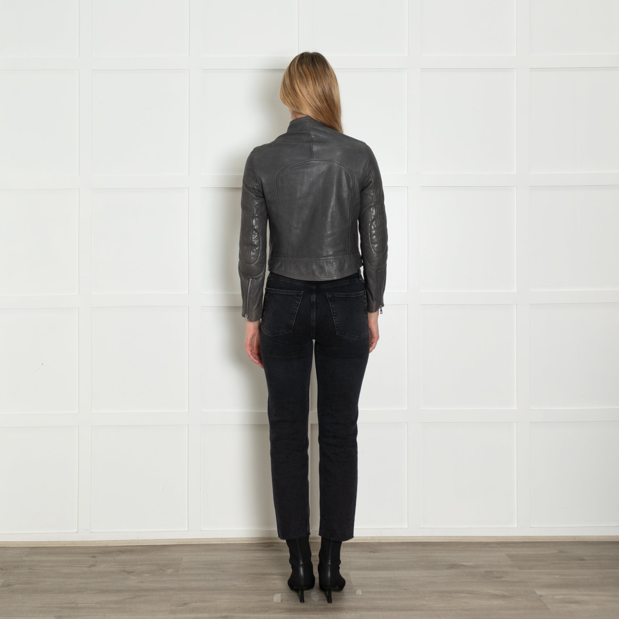 Zadig & Voltaire grey leather long-sleeve jacket, crafted with sheep leather, featuring a silver front zip-up design, with two front zipped chest pockets, and two flap pockets. This jacket has beautifully embroidered elbow designs, as well as two short sleeve zips and a buttoned neckline.