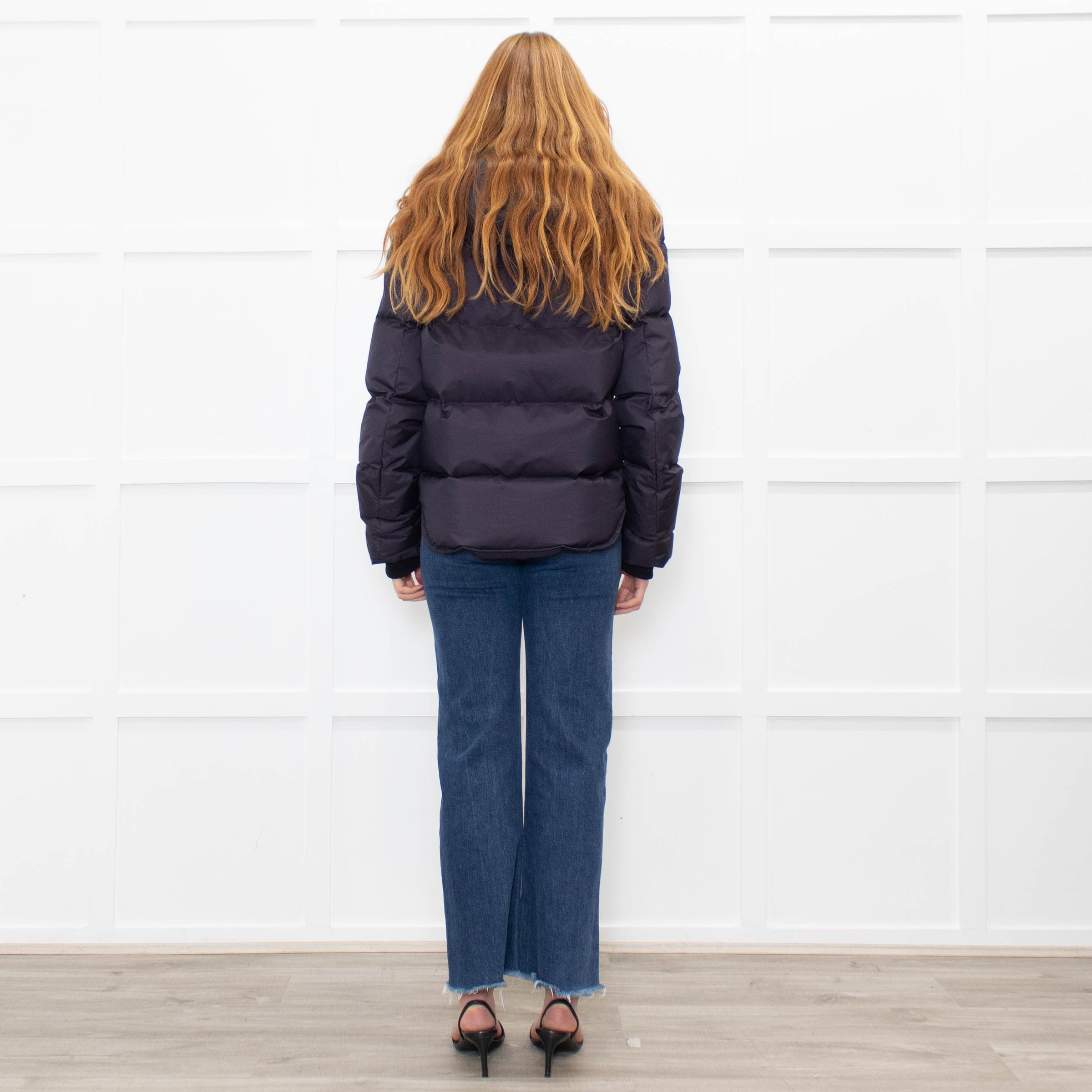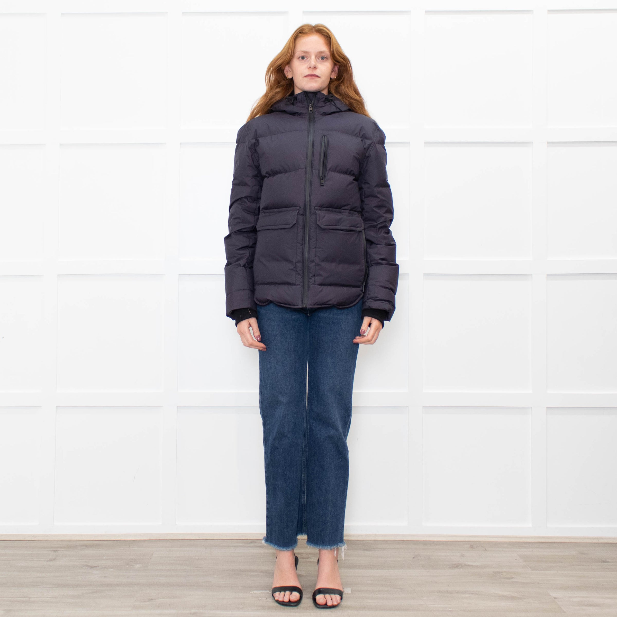 Zadig & Voltaire navy blue hooded puffer jacket with a zip up front, long sleeves, and two front patch pockets.