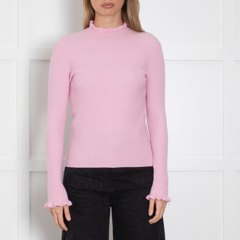 Maje Sugar Pink Ruffle Trim Ribbed Fitted Jumper