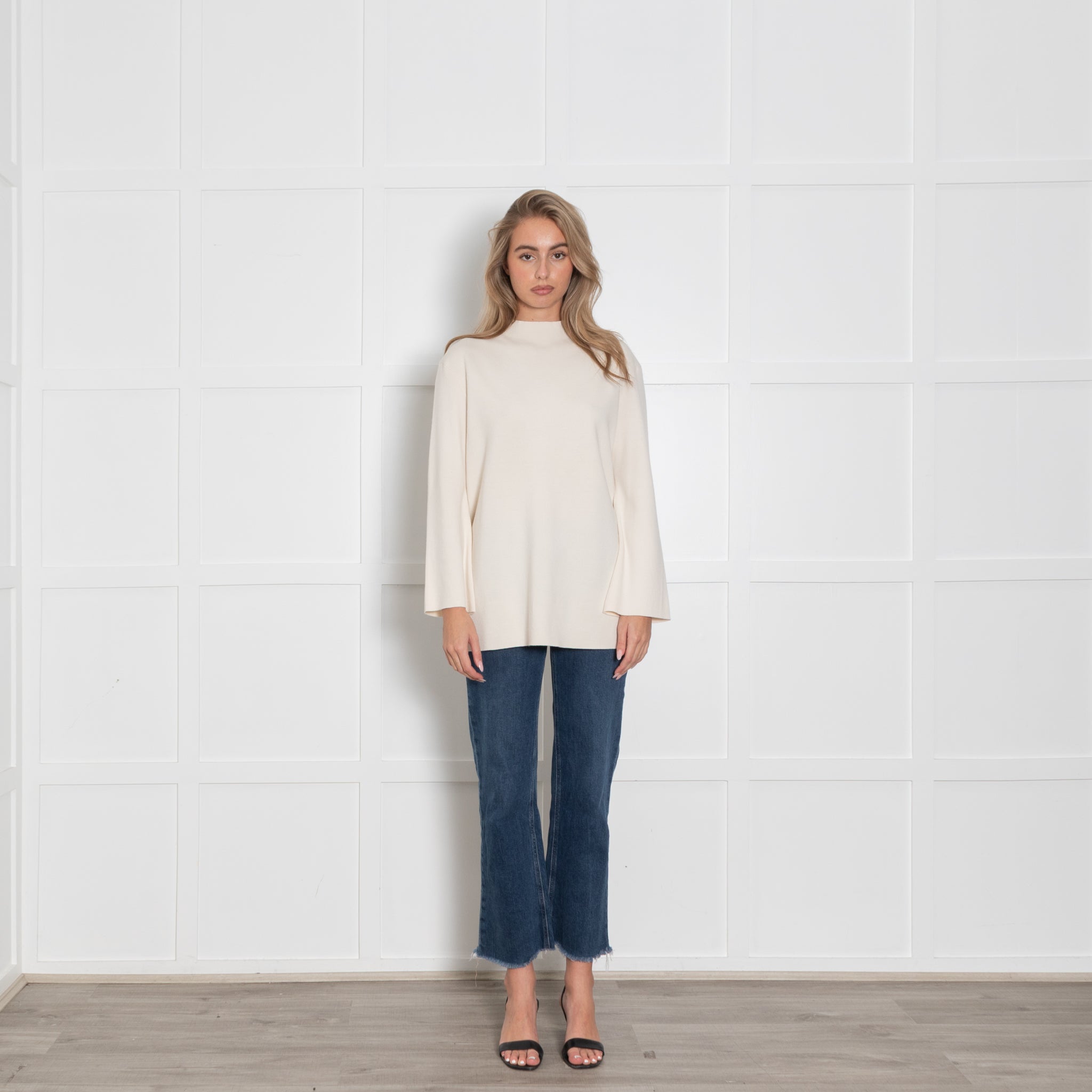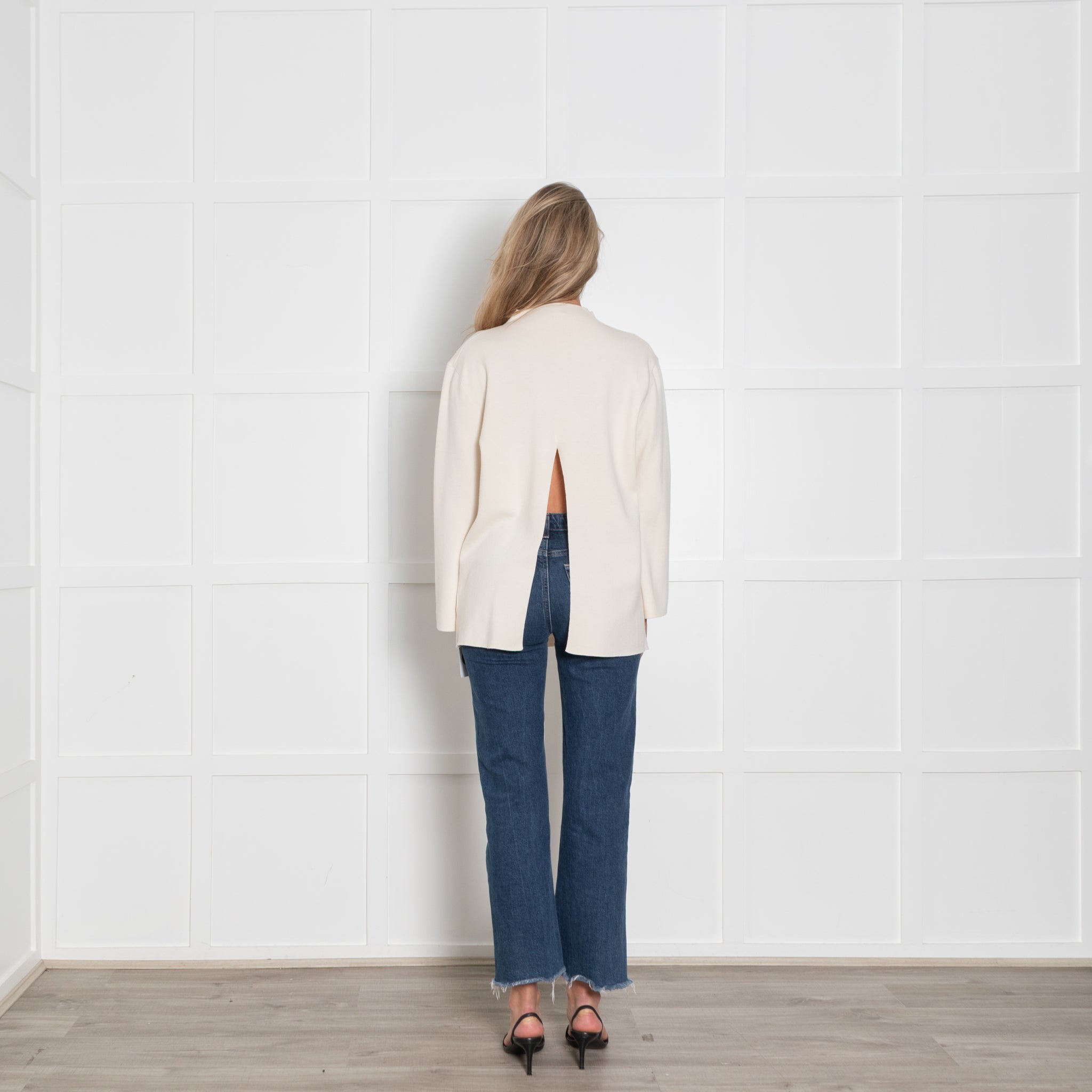 Adam Lippes long sleeve cream jumper, crafted with a soft woollen fabric, featuring an open back deisgn, a beautifully cut and sculpted rounded neckline.