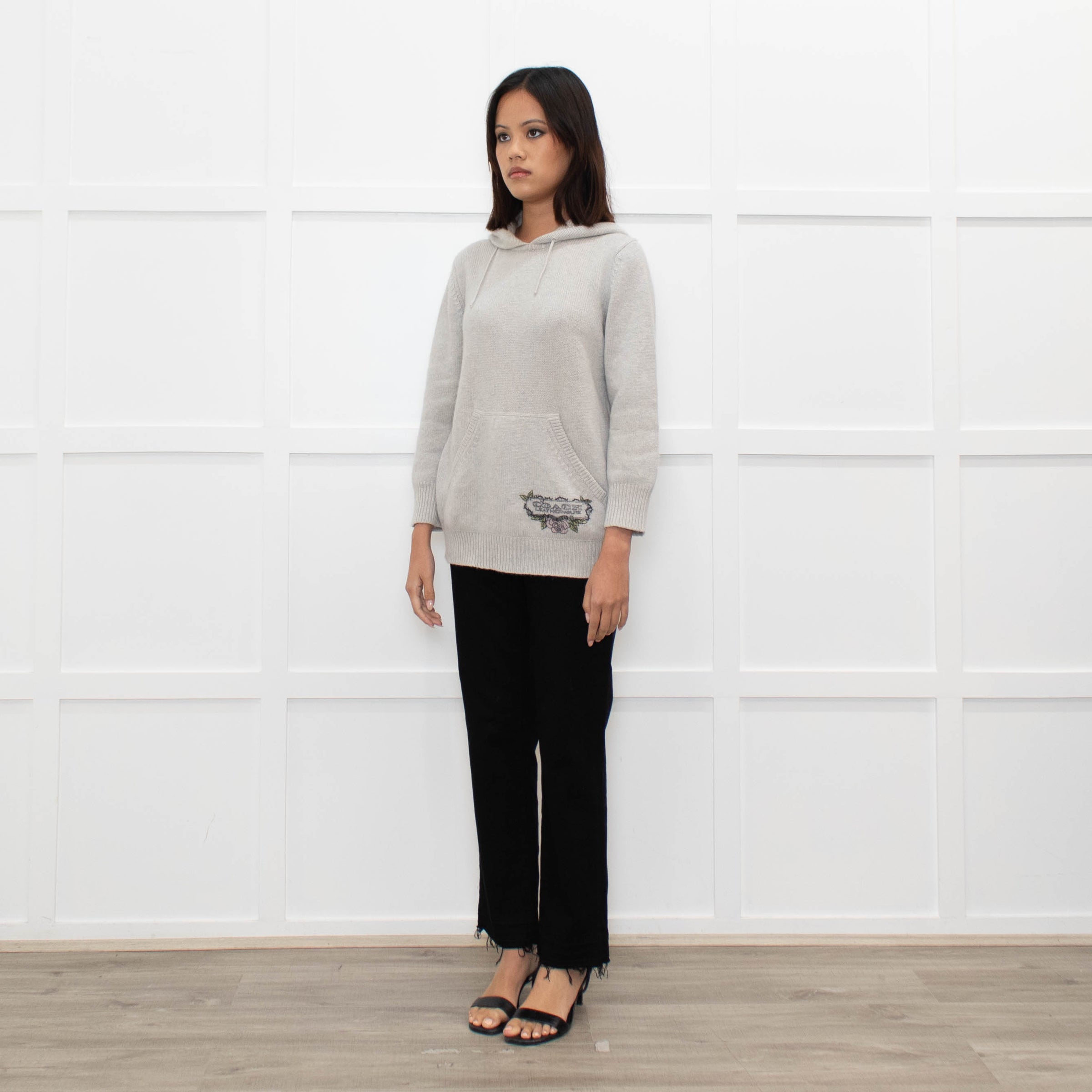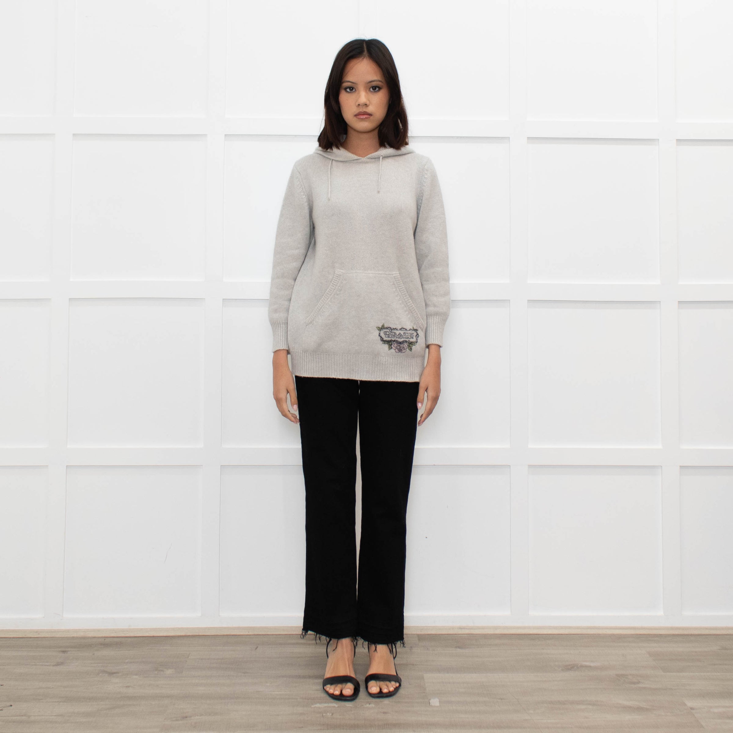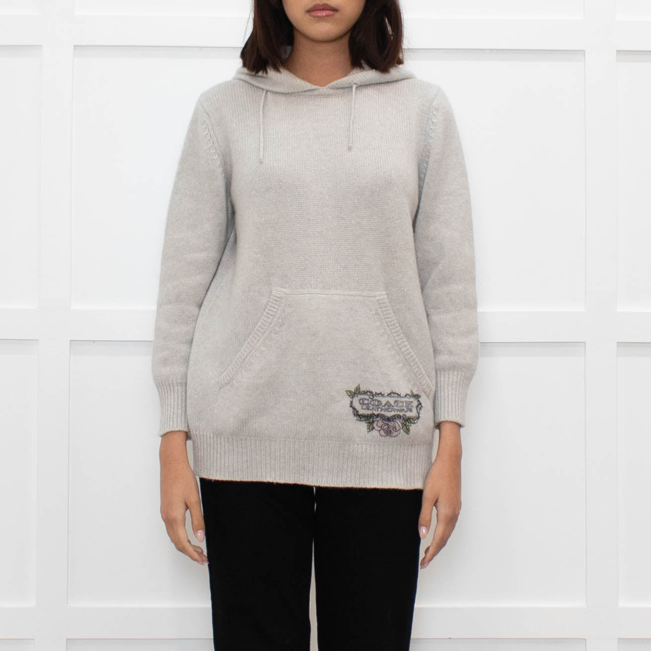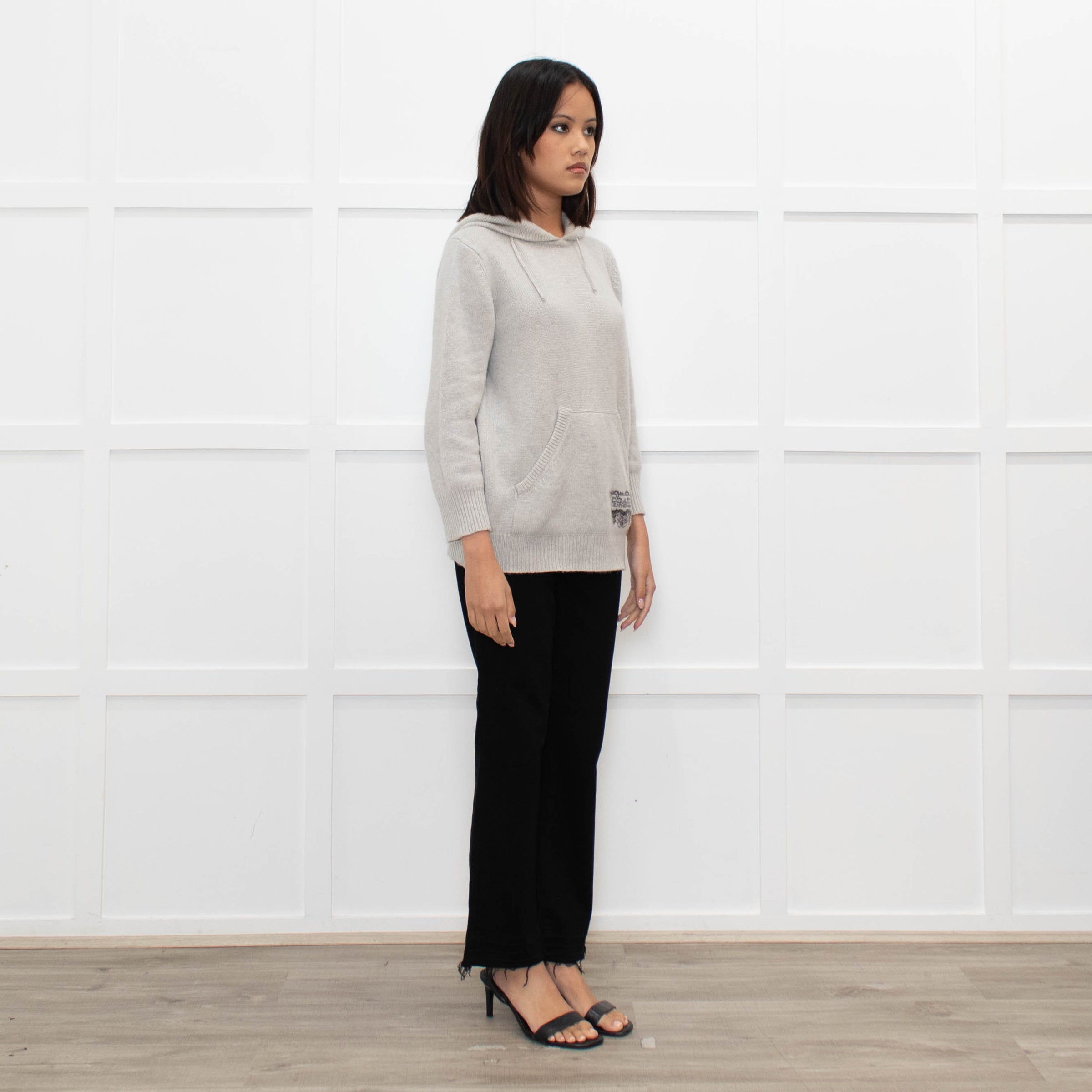 Coach light grey cashmere hooded sweater with a printed logo feature at the hem and a large front pocket.