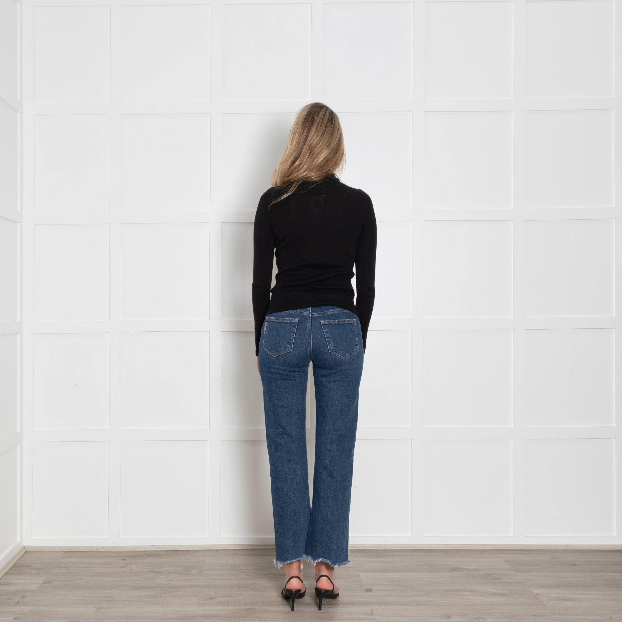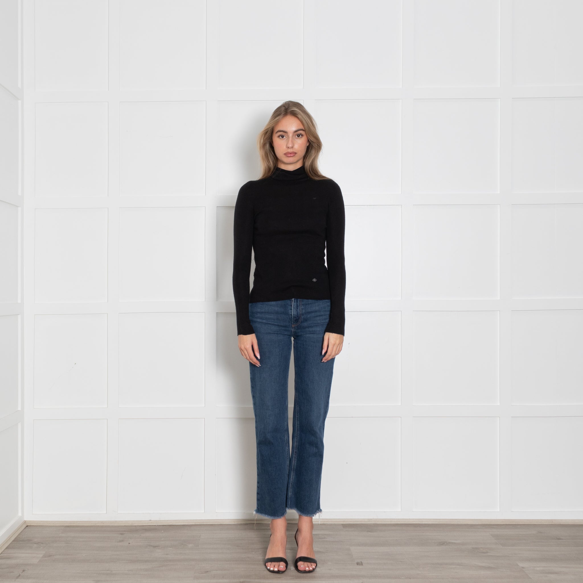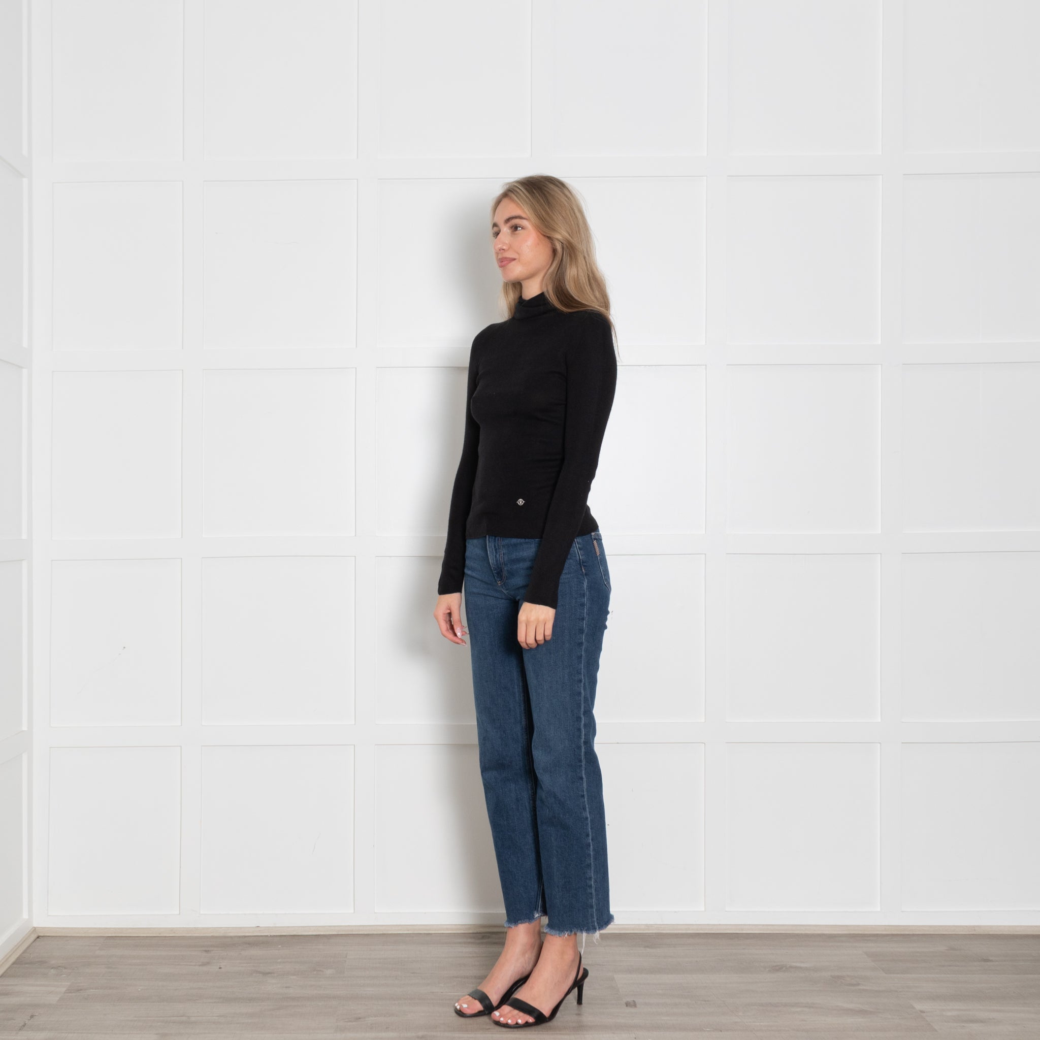 Lilysilk long-sleeve jumper, crafted with a stunning soft silk & cashmere mix fabric, featuring a black poloneck deisgn, with minimal ribbed detailing throughout the fabric.