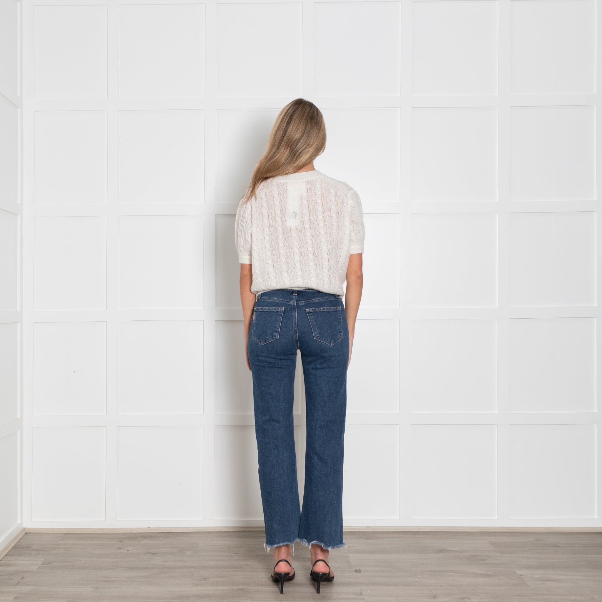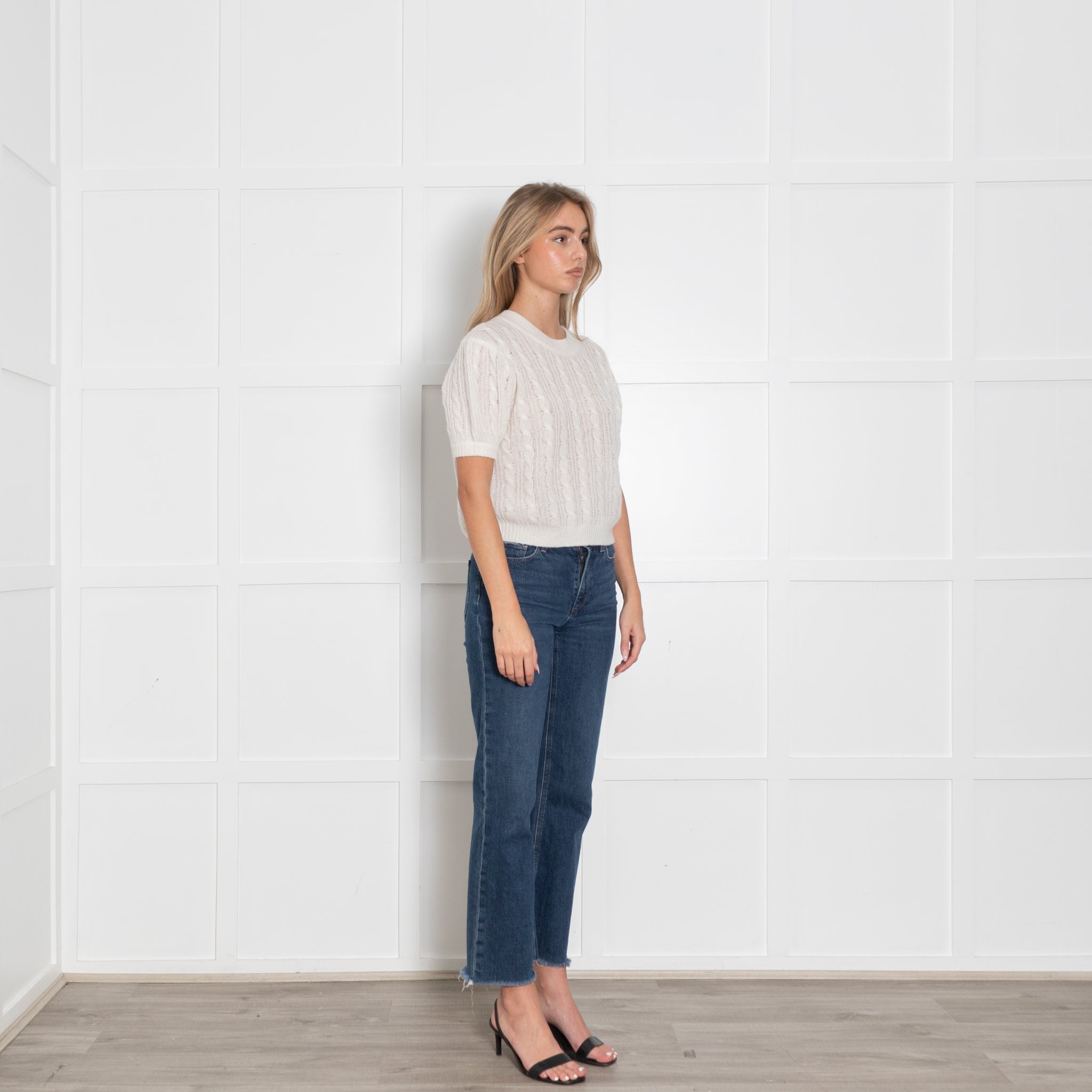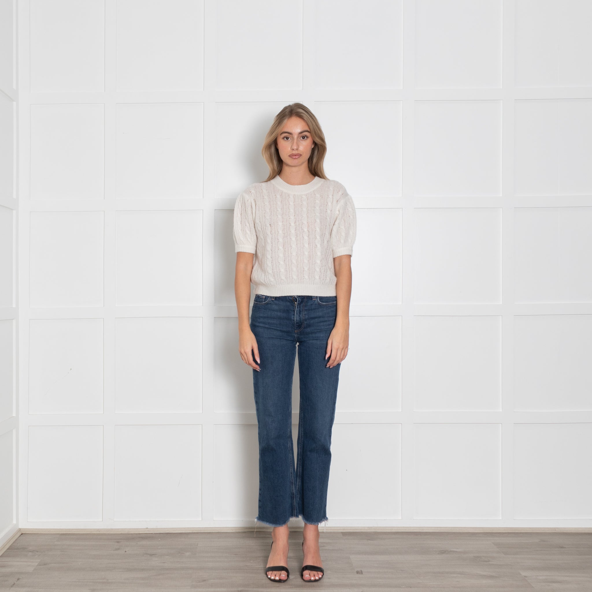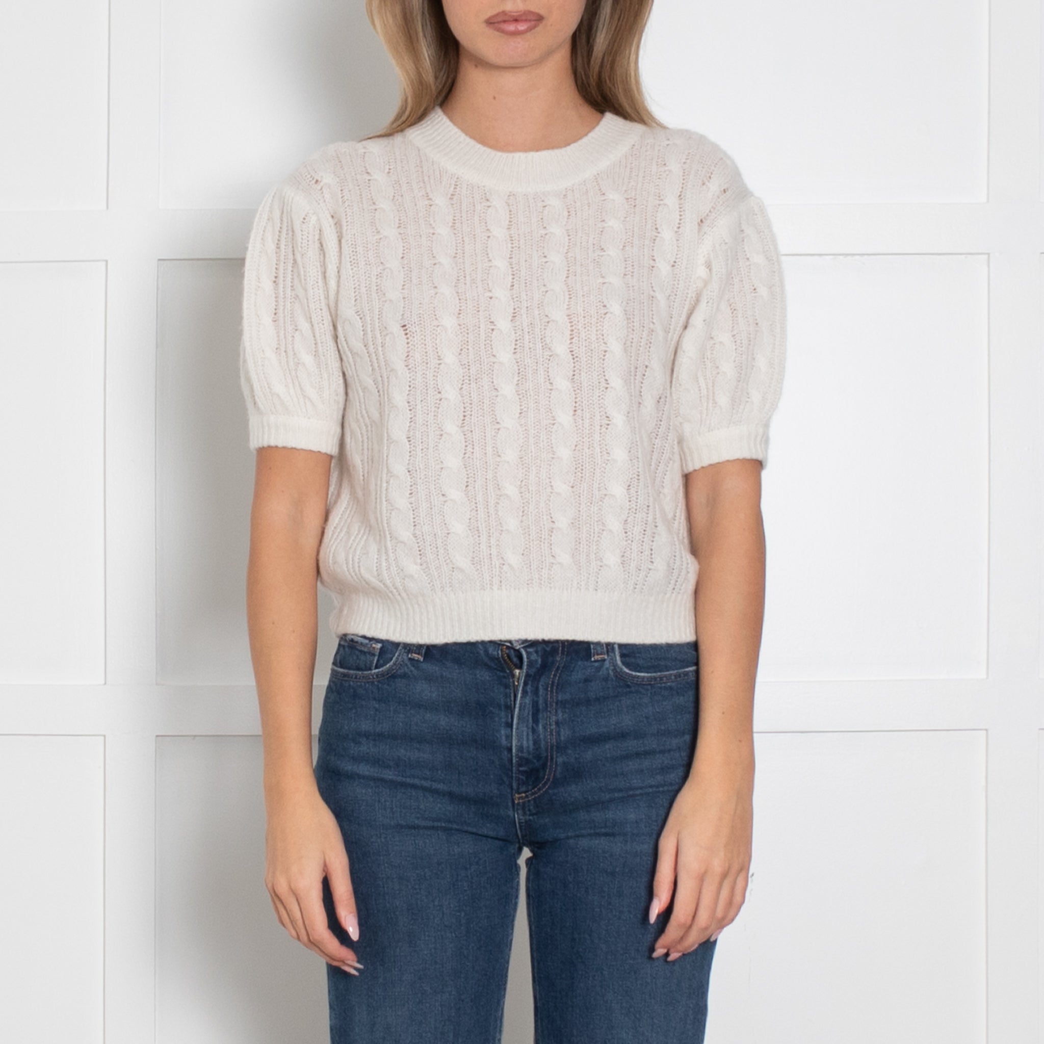 Lisa Yang short-sleeve cream jumper, crafted with a soft cashmere & silk blend fabric, featuring a short puff sleeve deisgn, with a classic rounded neckline and beautifully embroidered fabric.