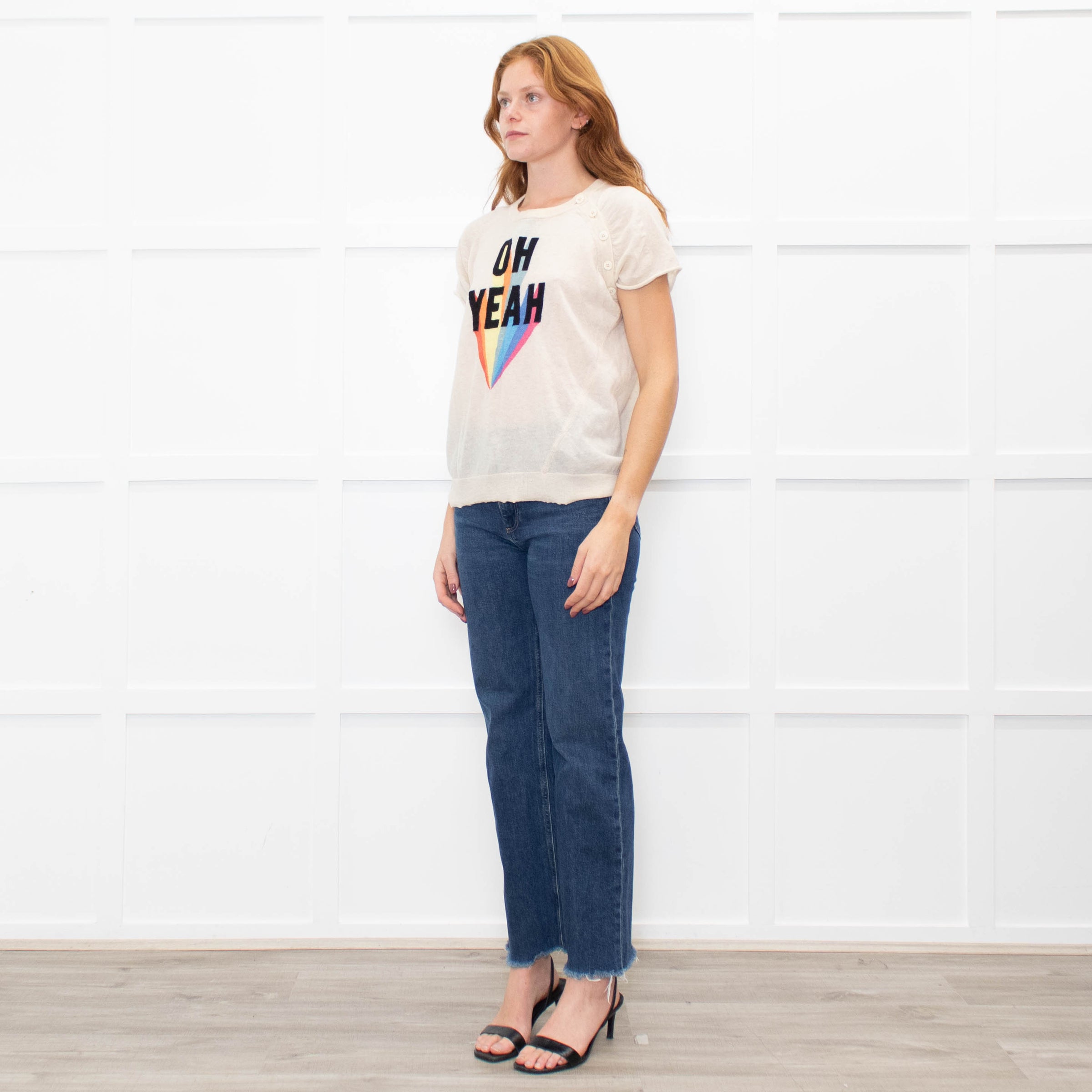 Zadig & Voltaire beige slogan short-sleeved cashmere top with buttons across one shoulder and 'OH YEAH' rainbow text in the intarsia knit pattern.