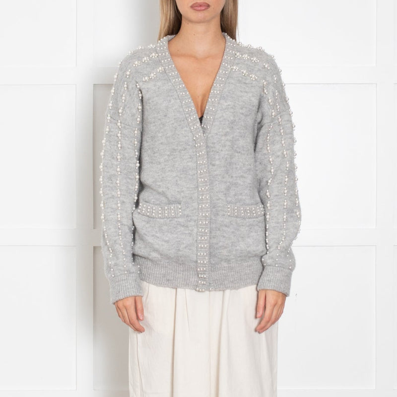 Maje Grey White Pearl Detail Wool Blend Cardigan