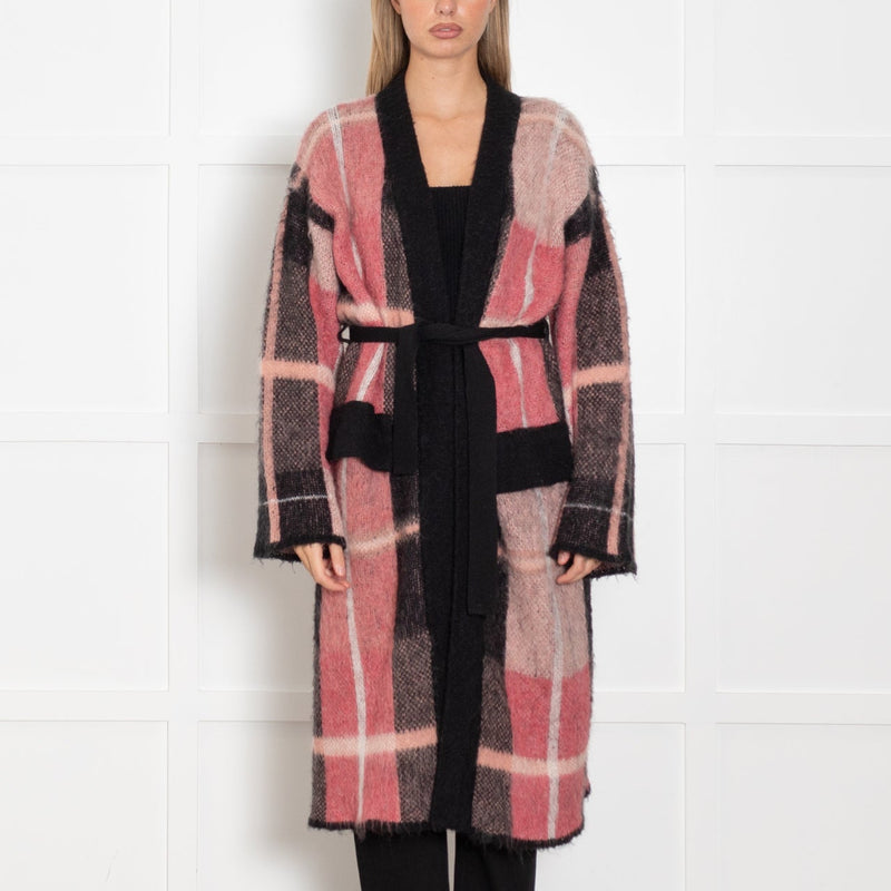 Beatrice B Pink And Grey Plaid Long Belted Cardigan