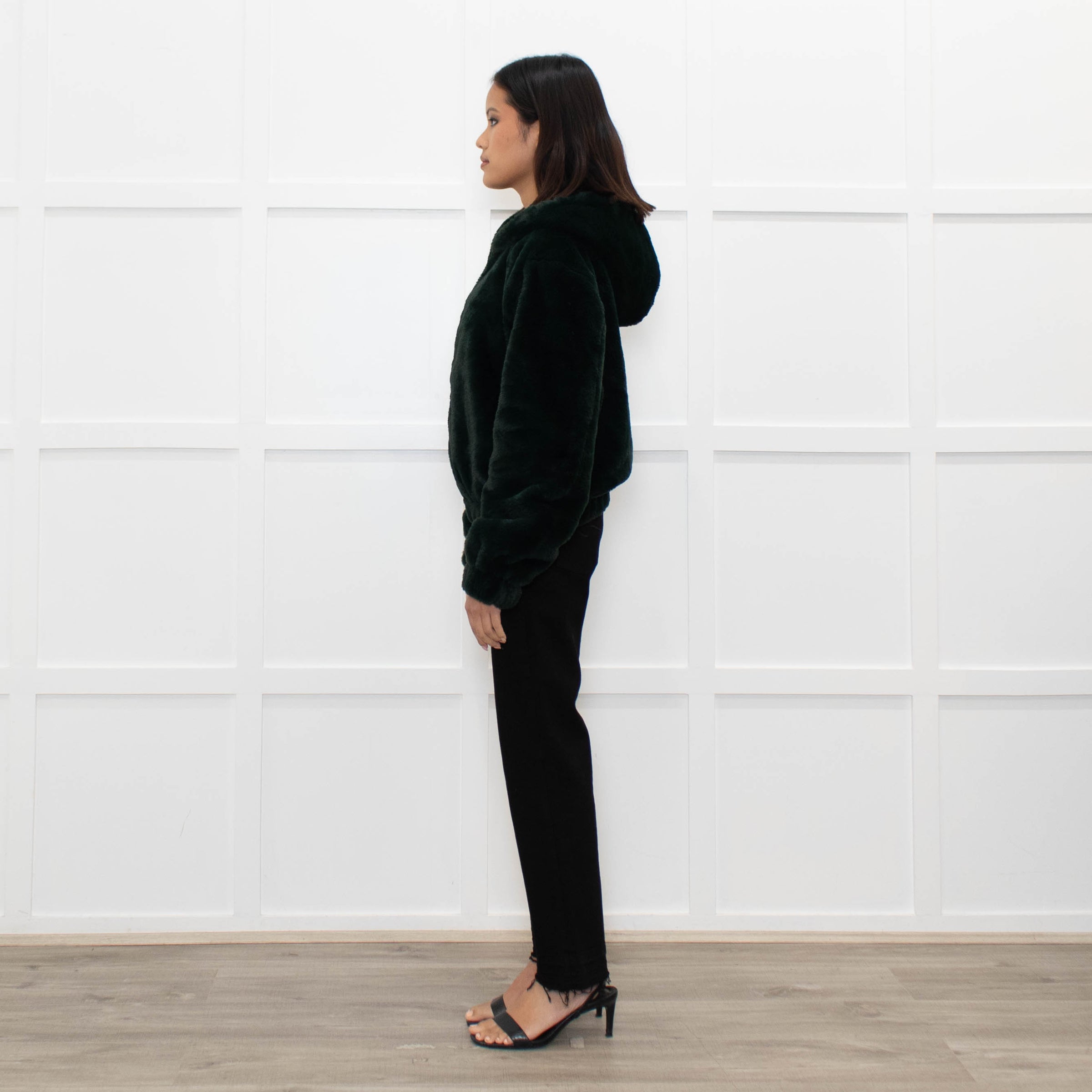7 For All Mankind green faux fur hooded jacket with front zip closure, and two side slip pockets.