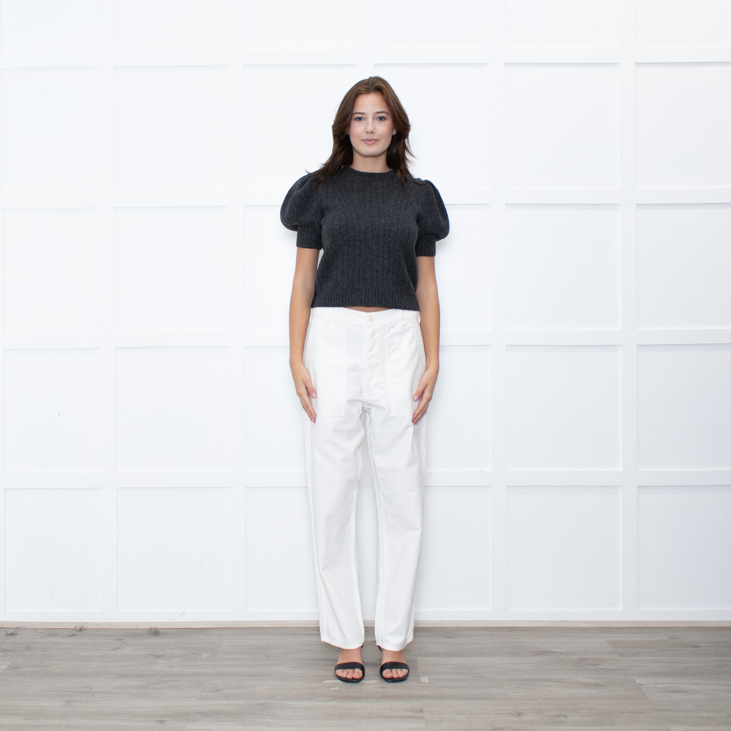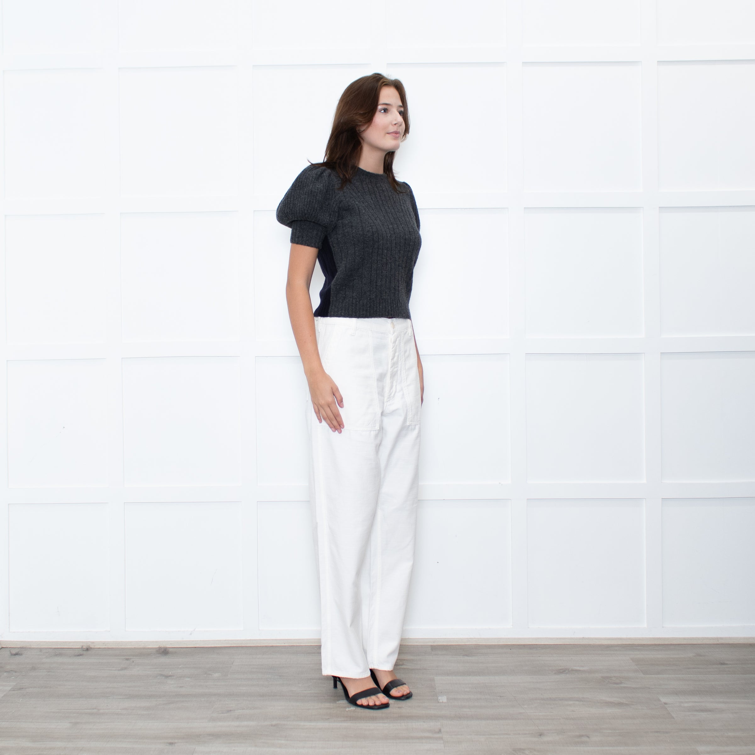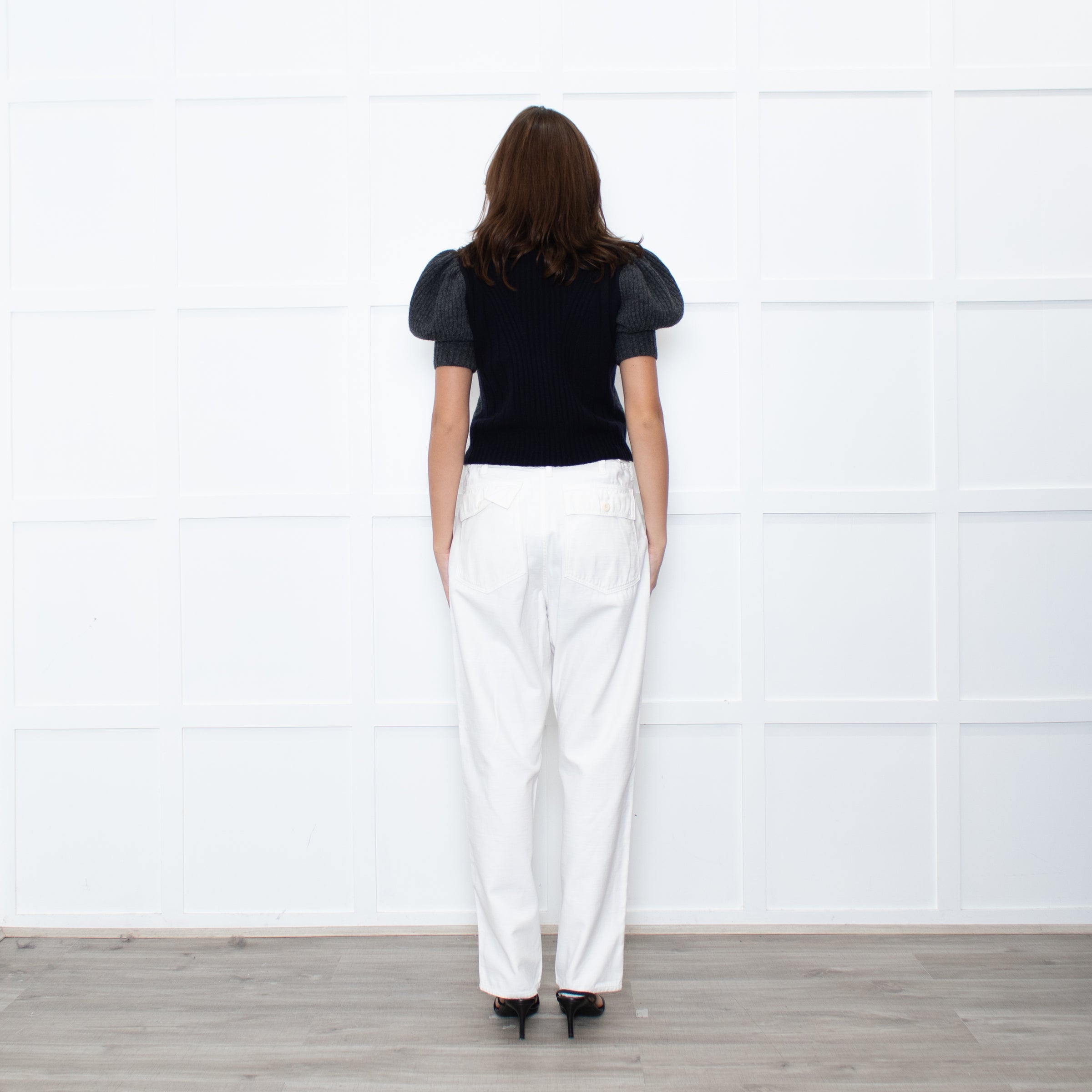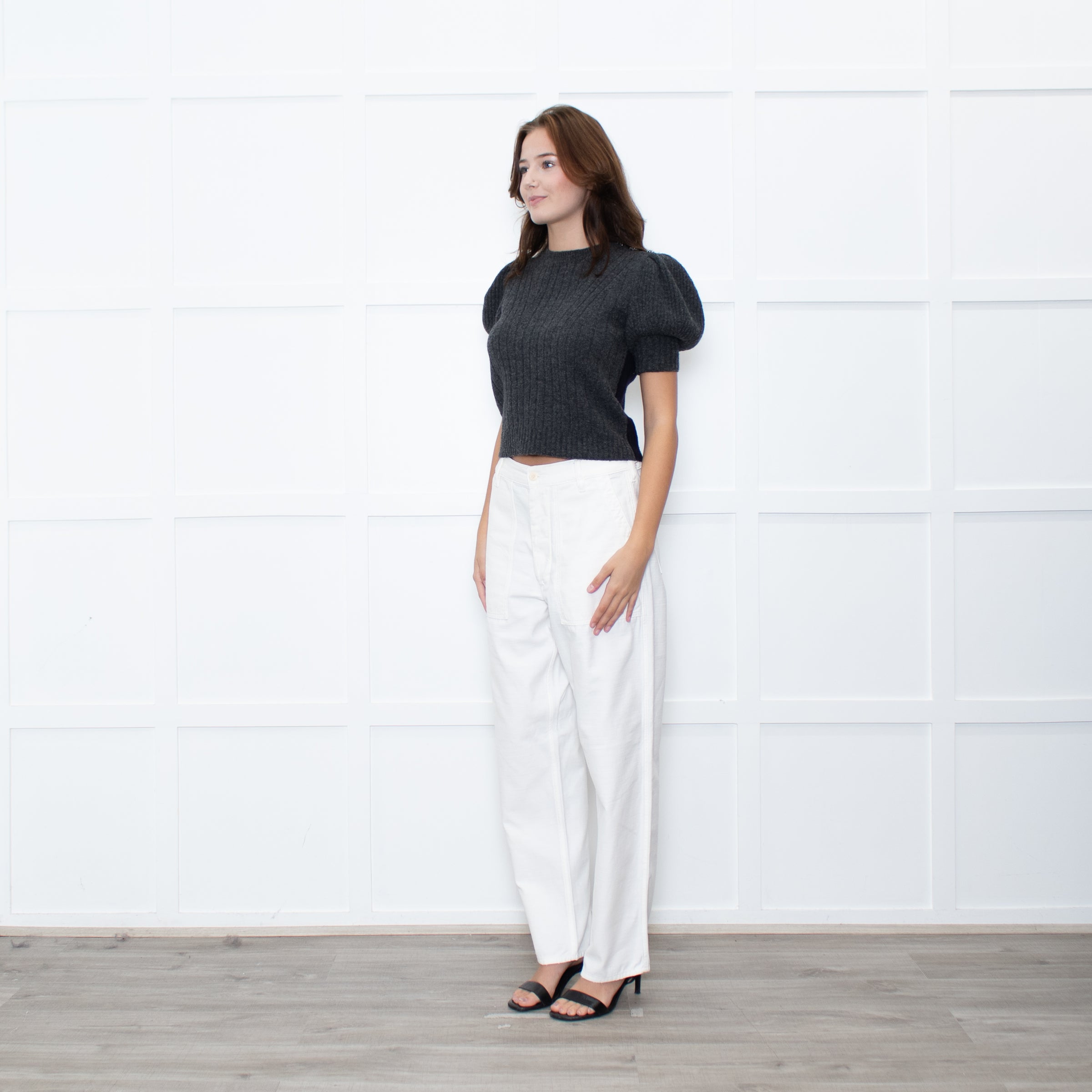 Alexander McQueen grey and navy contrast knit with puff sleeves and a round neckline. Features ribbed texture and crystal button embellishments on the shoulders.