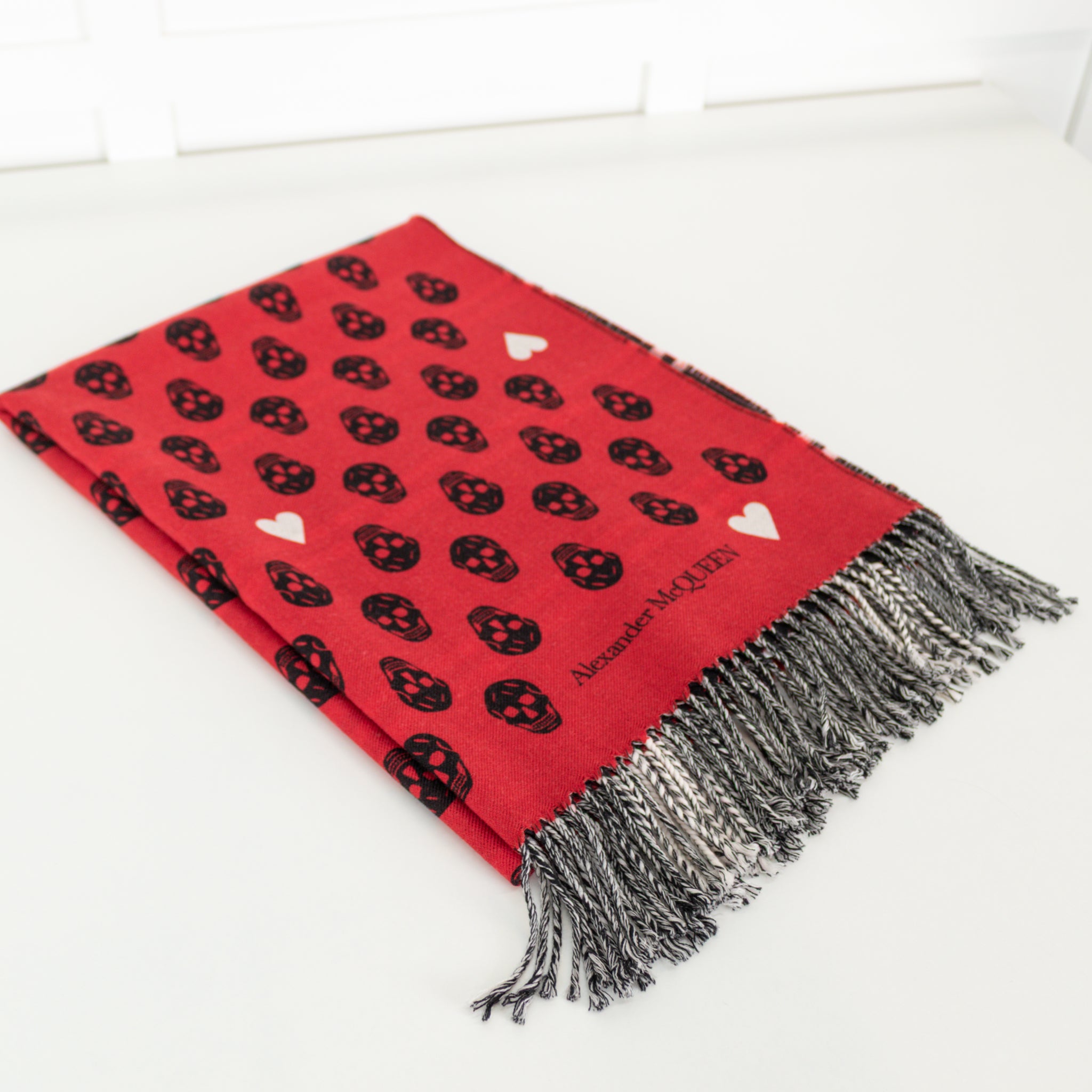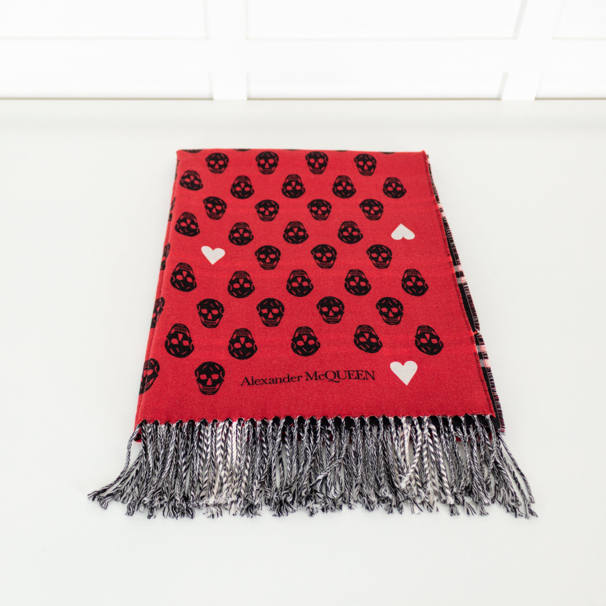 Alexander McQueen Red And Black Skull and Heart Print Scarf