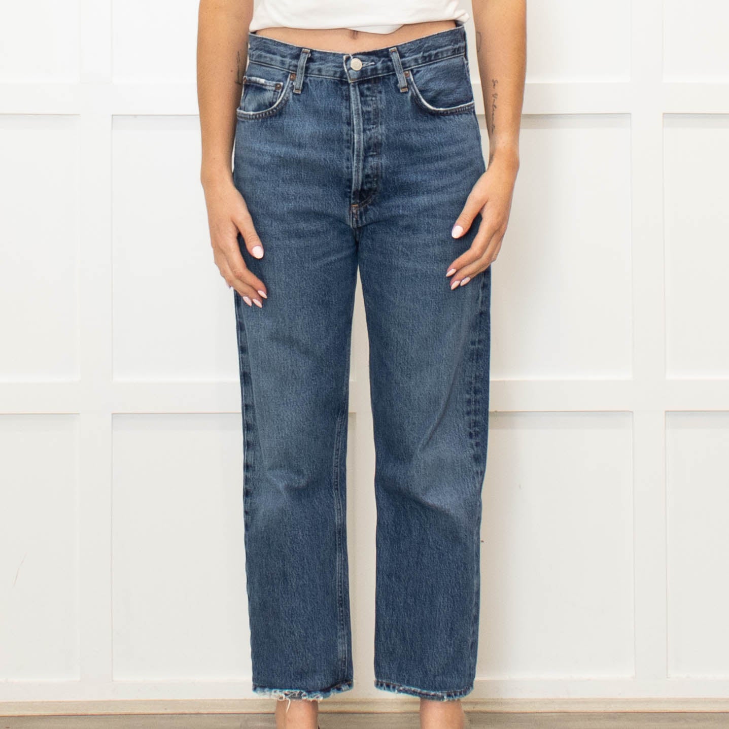 Agolde blue high-waist straight-leg jeans with concealed front button flies, five pockets and belt loops.
