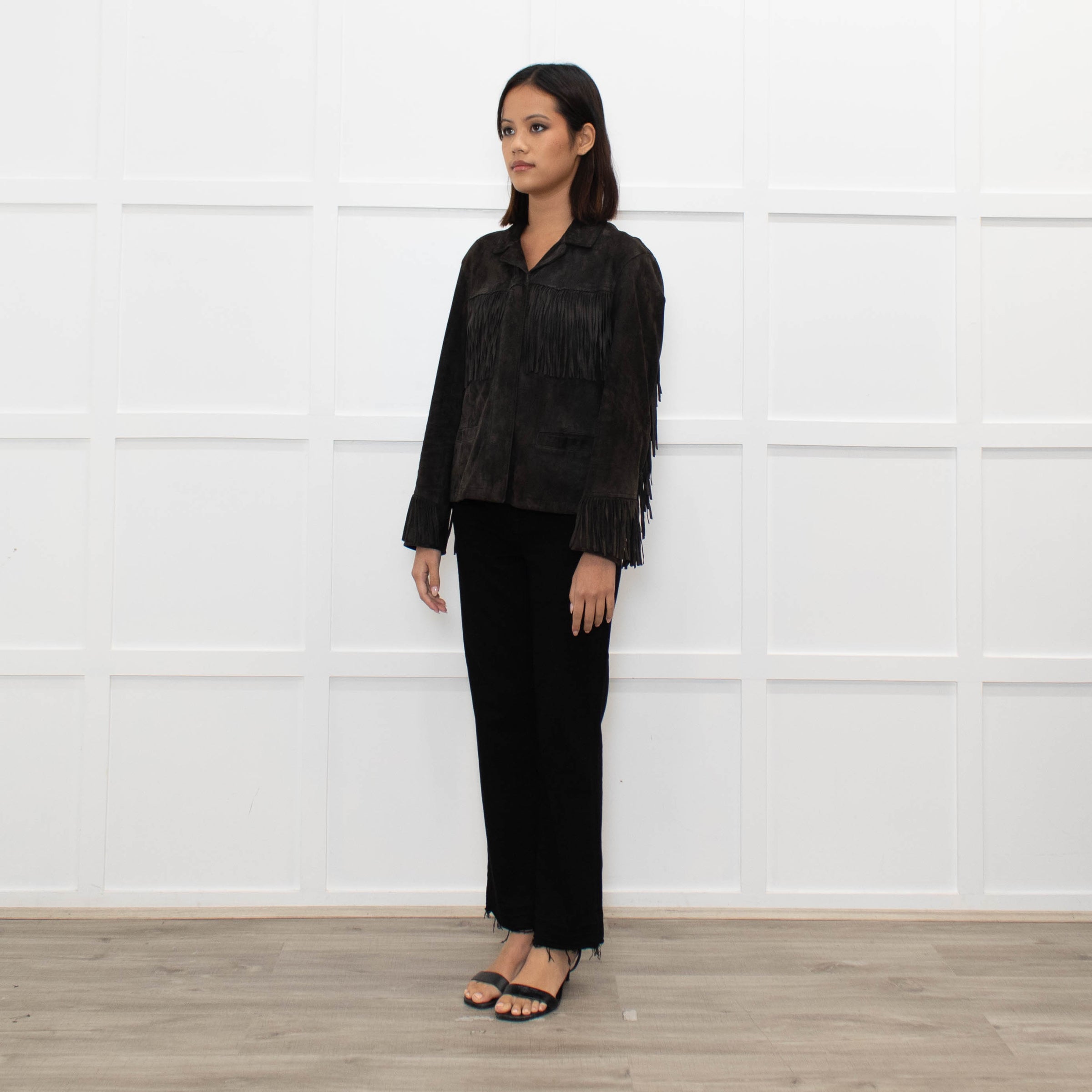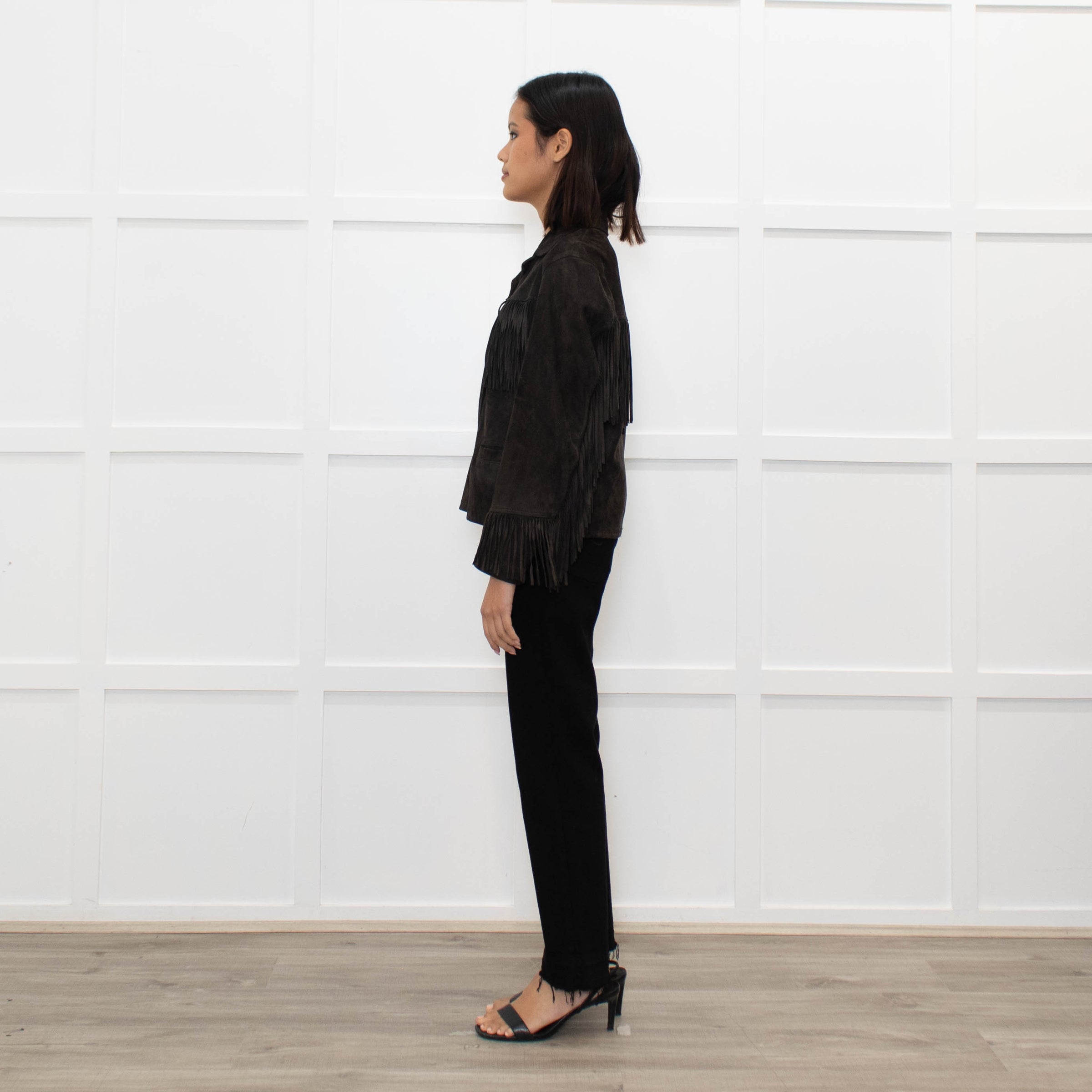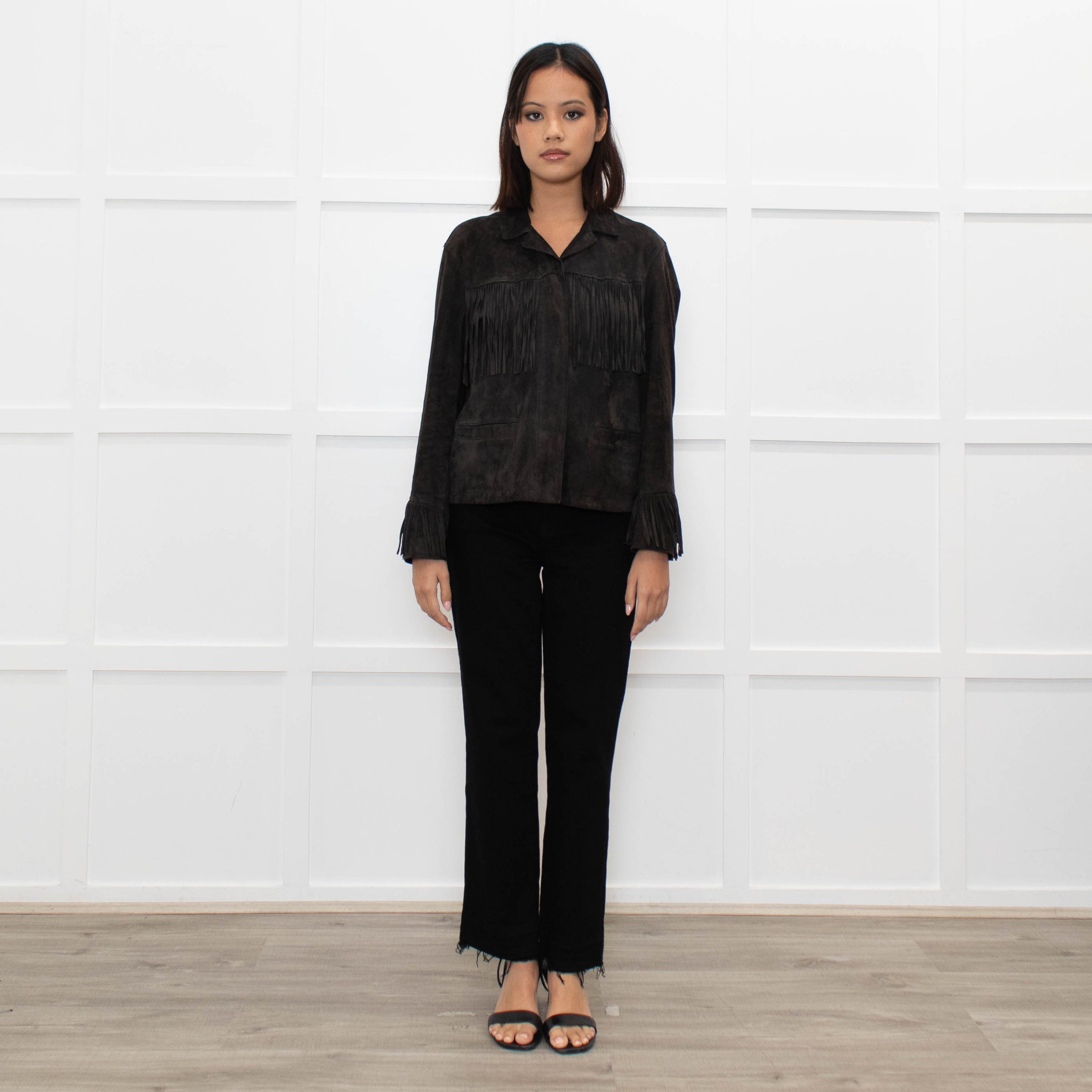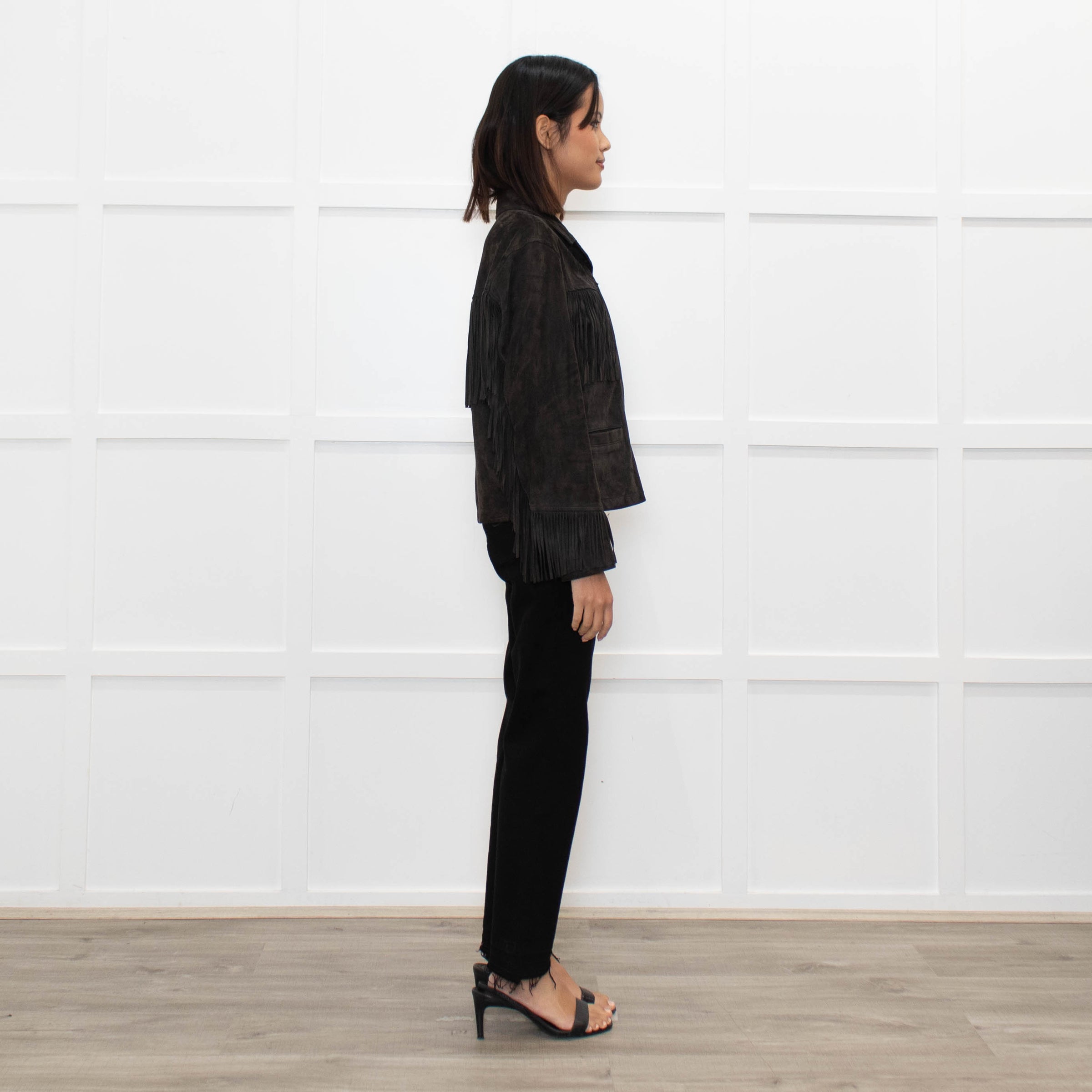 All Saints grey suede fringed zip-up jacket with two side slip pockets and a pointed collar and lapel.