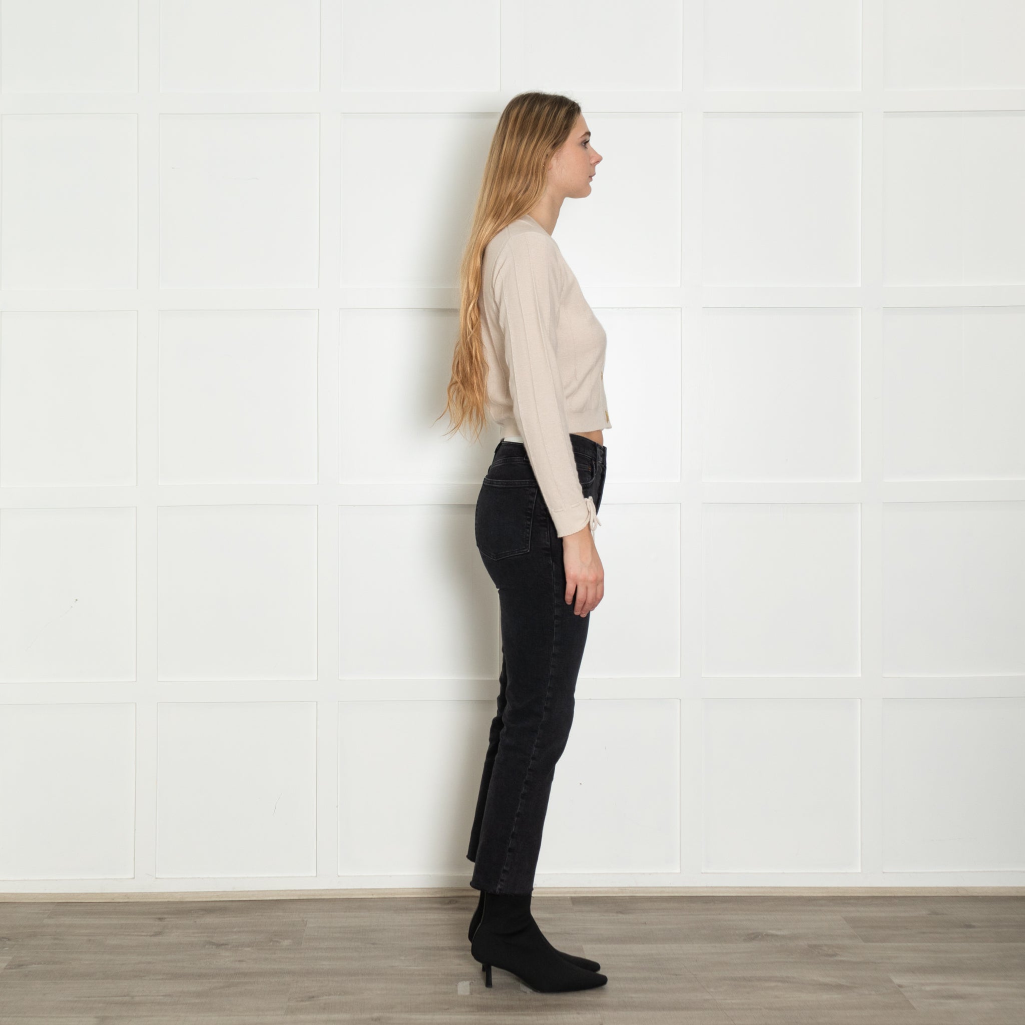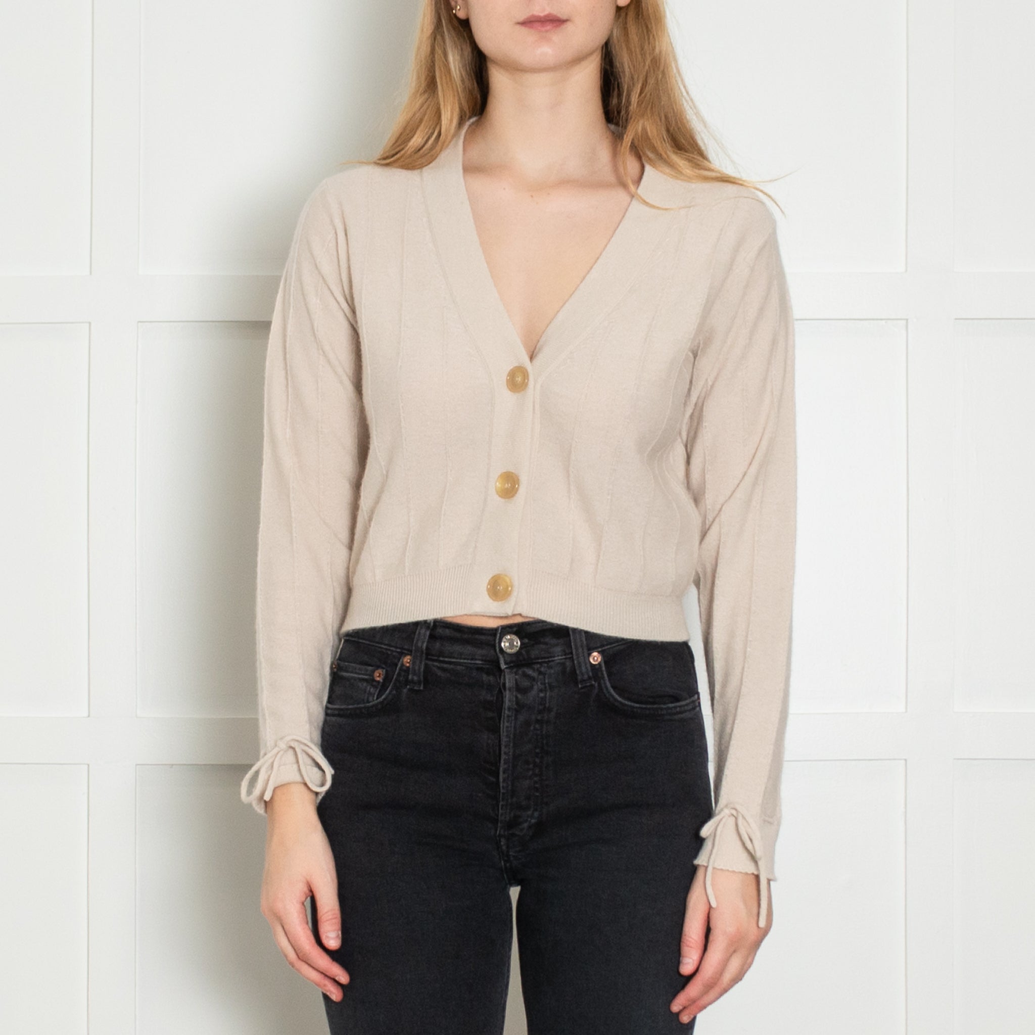 Allude beige long-sleeve cropped cardigan, crafted with soft cashmere fabric, featuring a stunning tie-up adjustable sleeve, a V-neckline, and three front buttons, with a slight ribbed design.