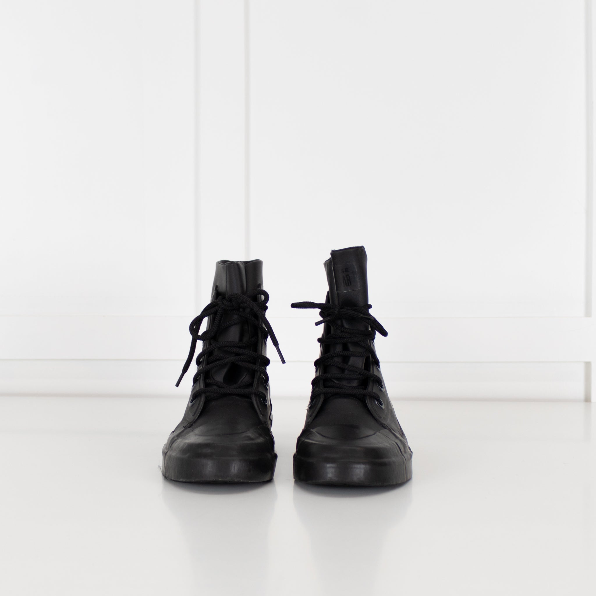Ambush x Converse all black high top trainers, featuring a rounded rubber sole, black laces, stunning symmetrical star designs on the exterior, and the iconic yellow '5 1/2 ambush' letters written on the back ankles.
