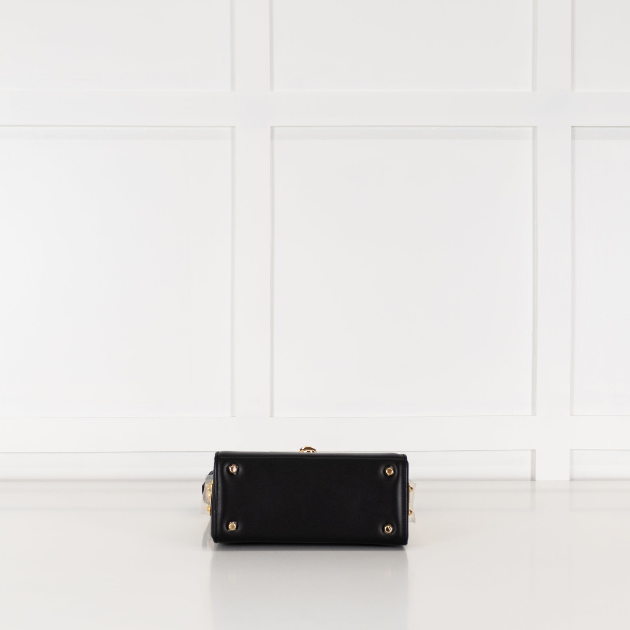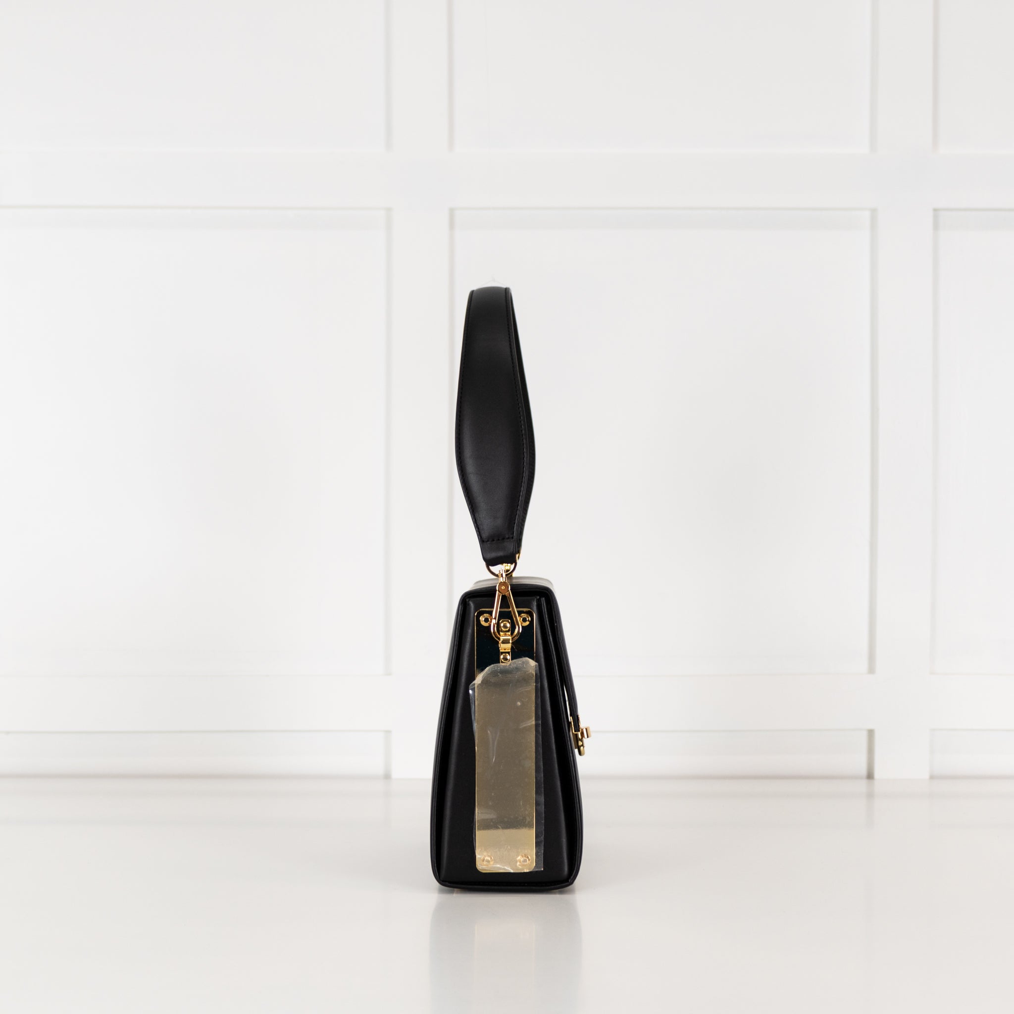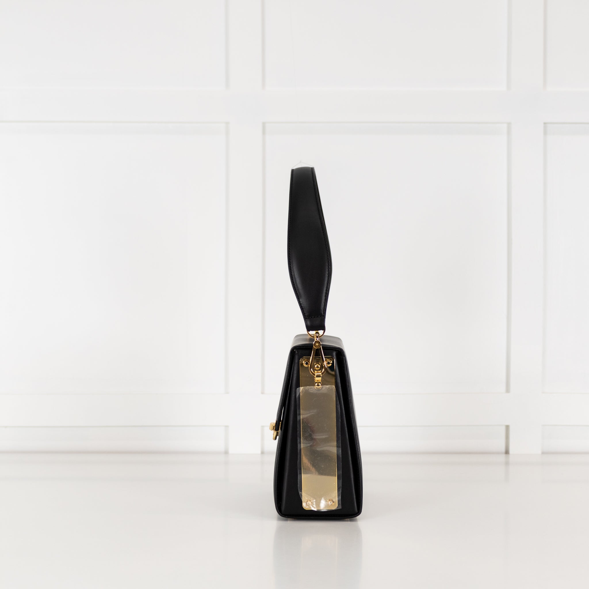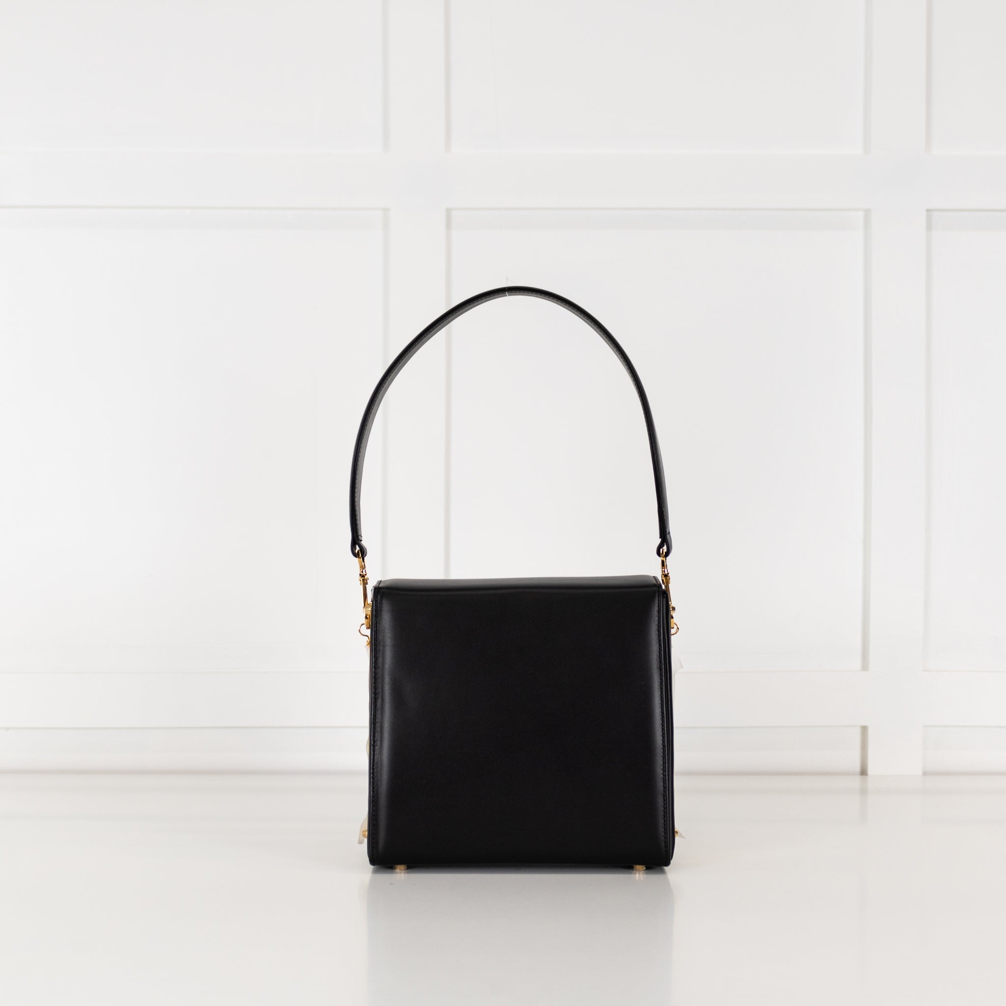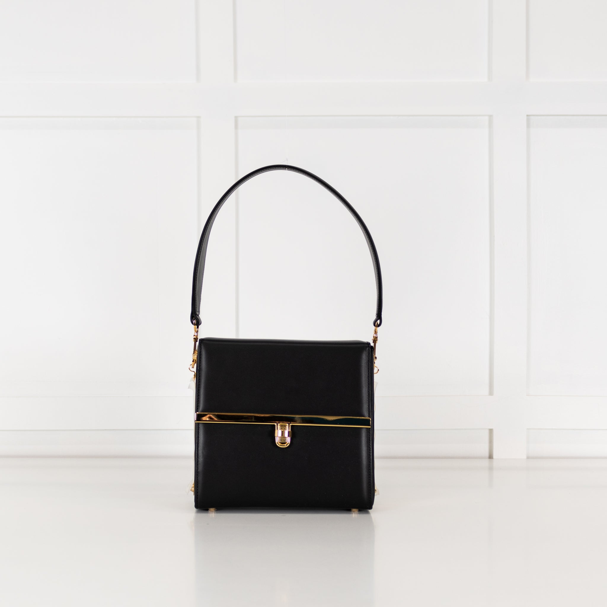 Ame Moi black leather bag with front flap and turn-lock closure and gold-tone metal trim hardware. This bag comes with a shoulder strap and a crossbody strap, and has two internal slip pockets. New with tags.