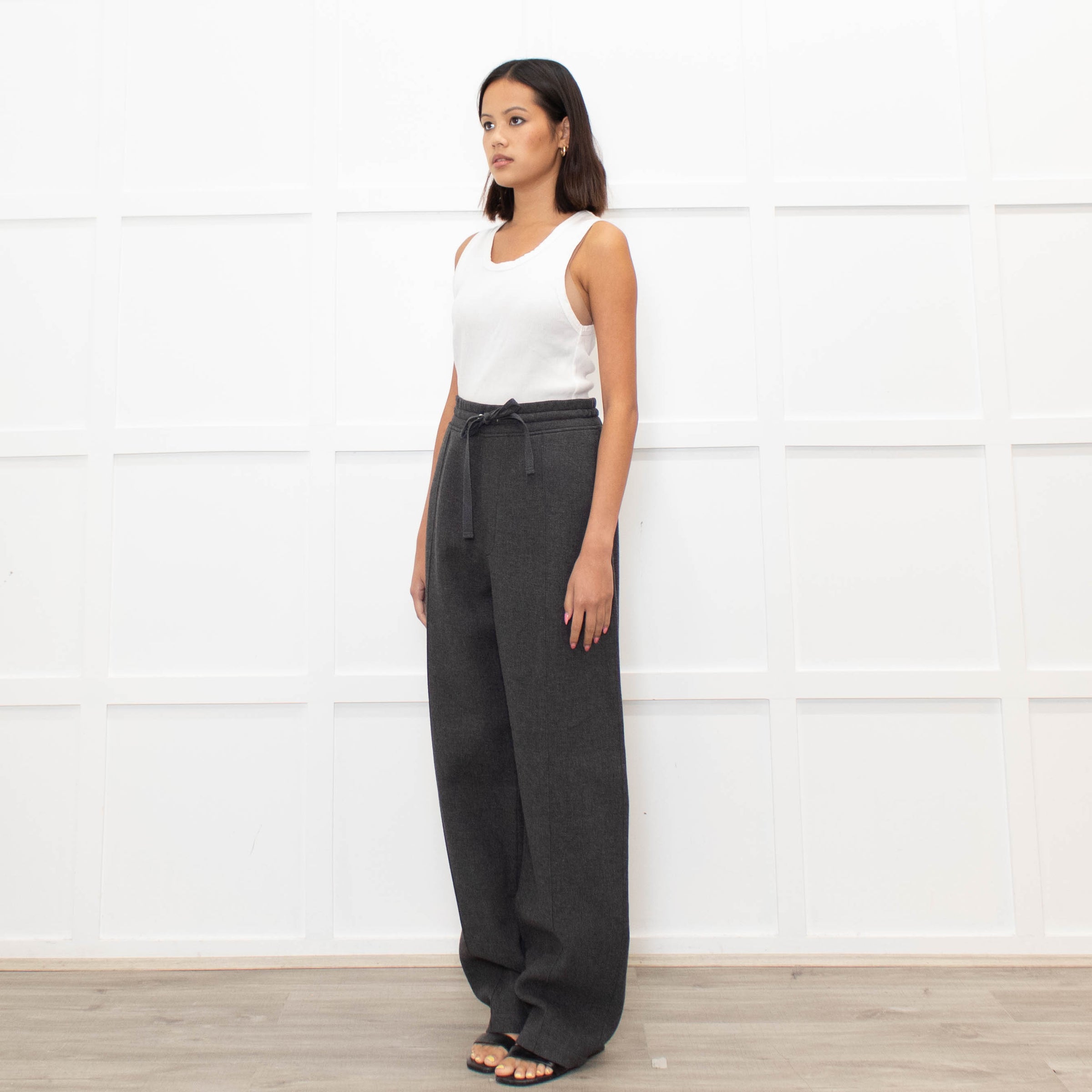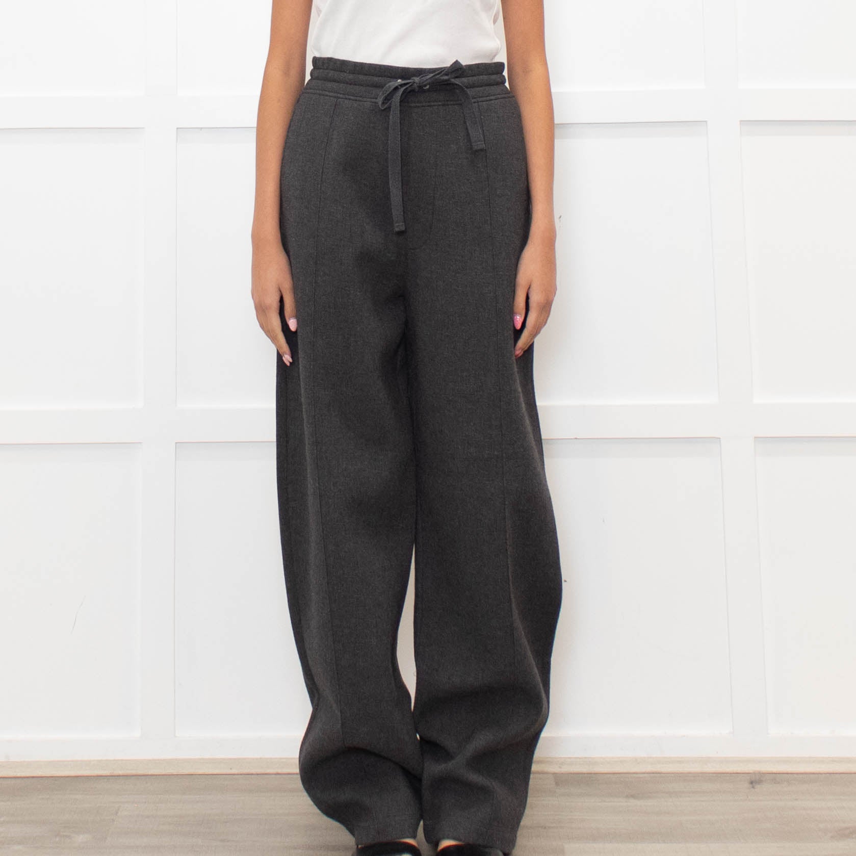 Ami Paris grey wool mix jogger style trousers with a drawstring waist, panel detailing, and three pockets.