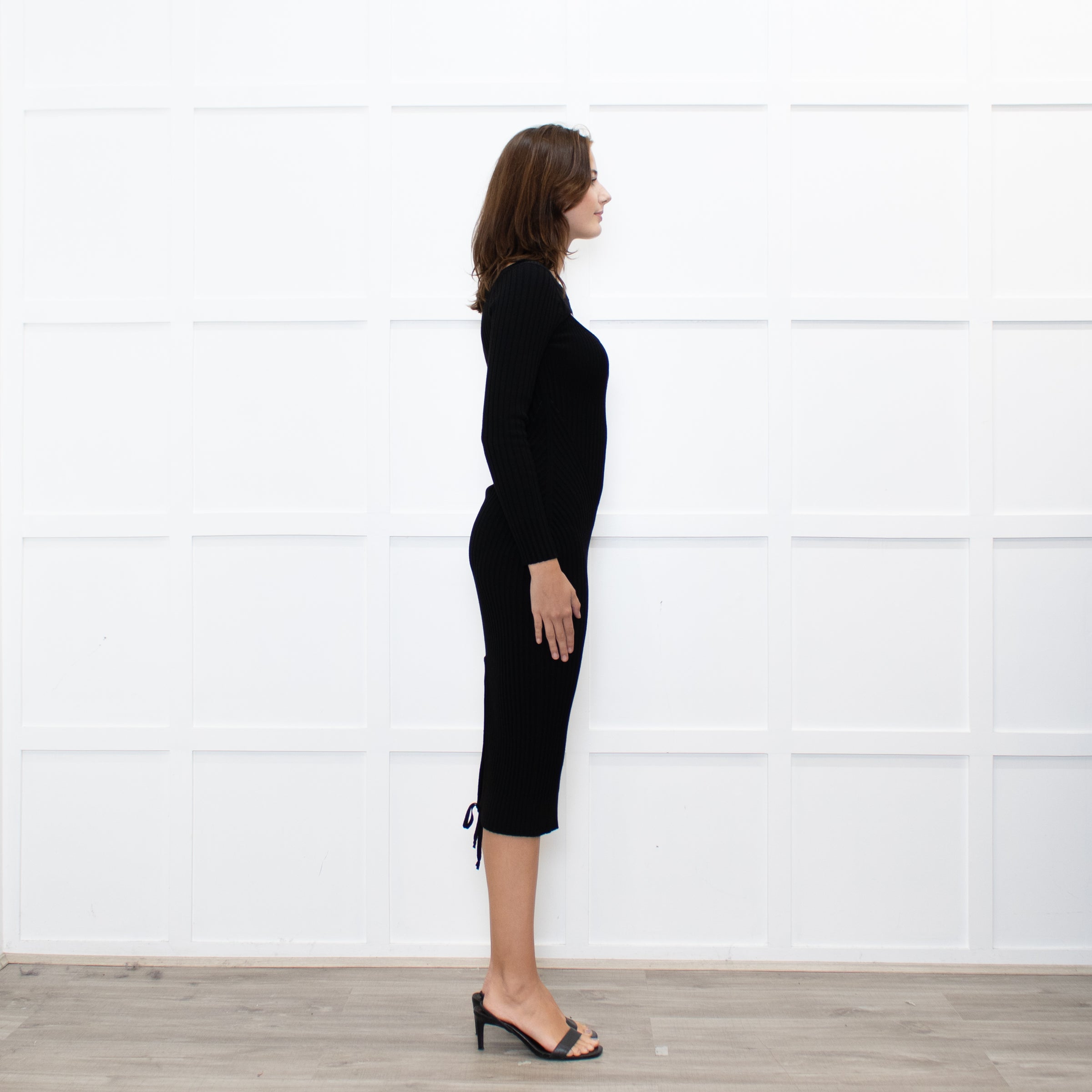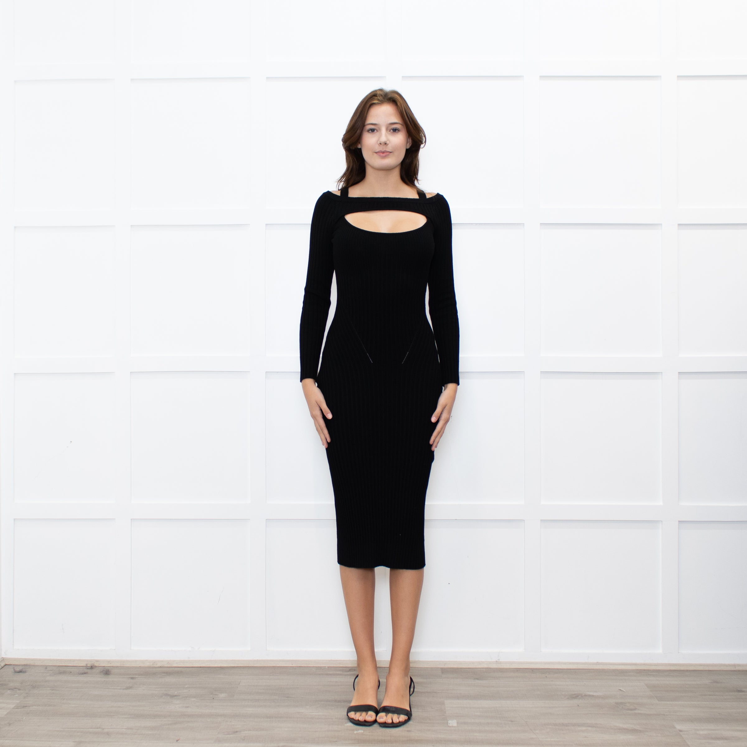 Andreadamo black rib knit midi dress with a cut-out bust and rear hem split.