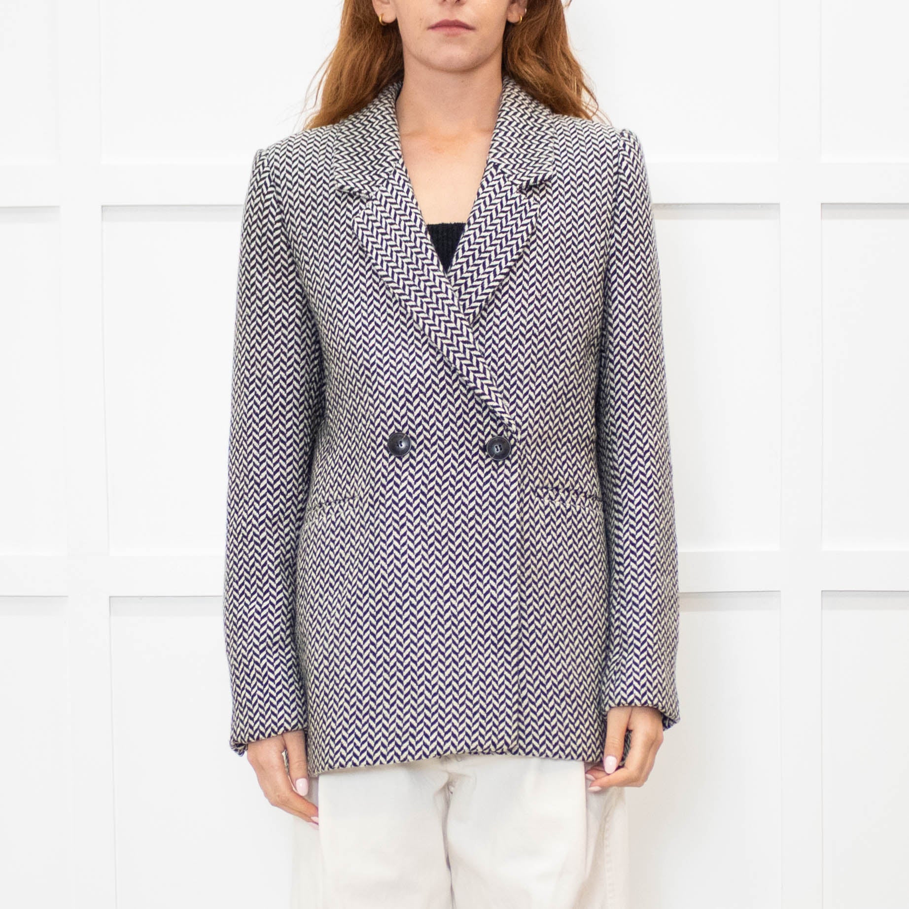 Anine Bing black and white fishbone pattern boxy double breasted blazer jacket with a notch collar and lapel, long sleeves, a full lining, and a rear hem vent.
