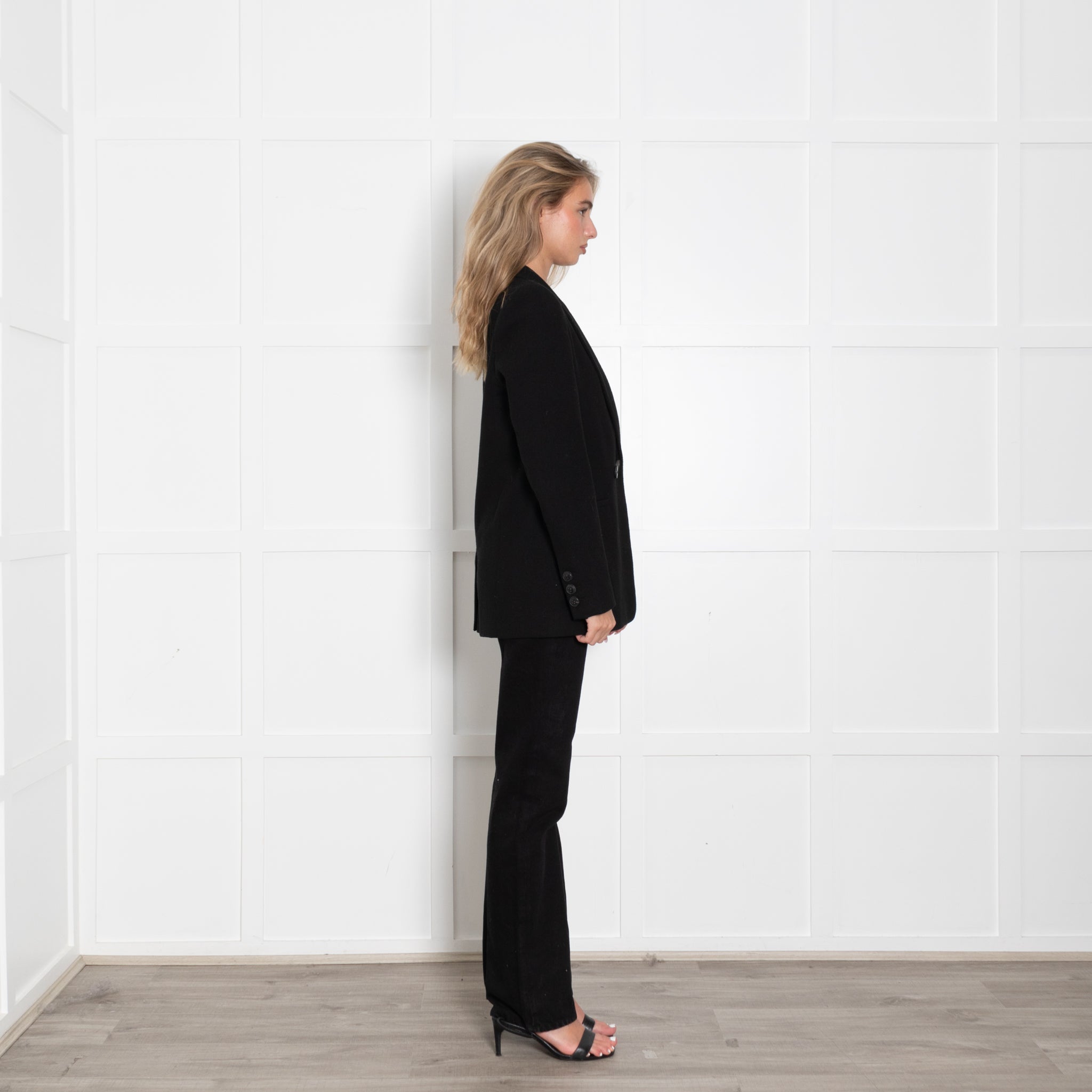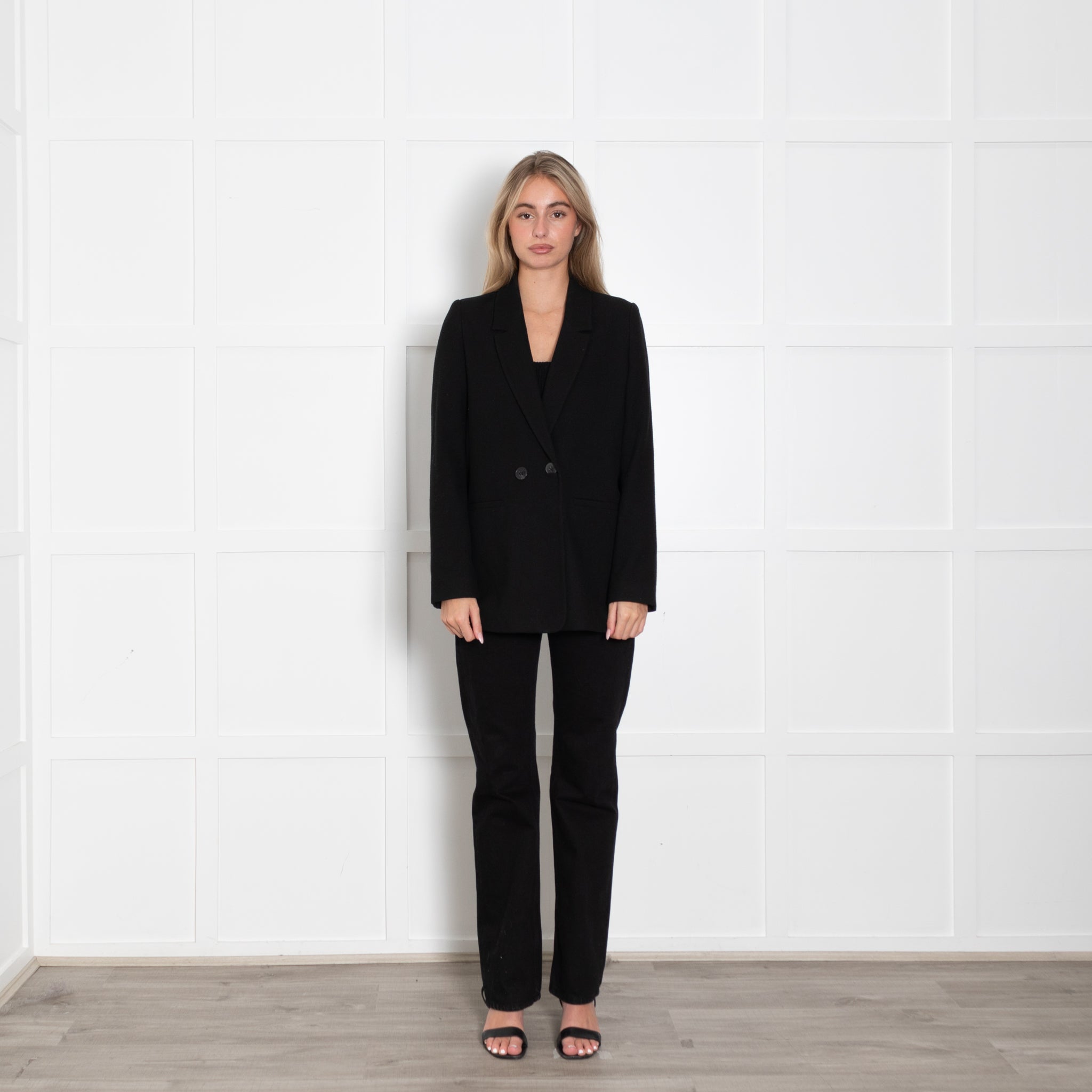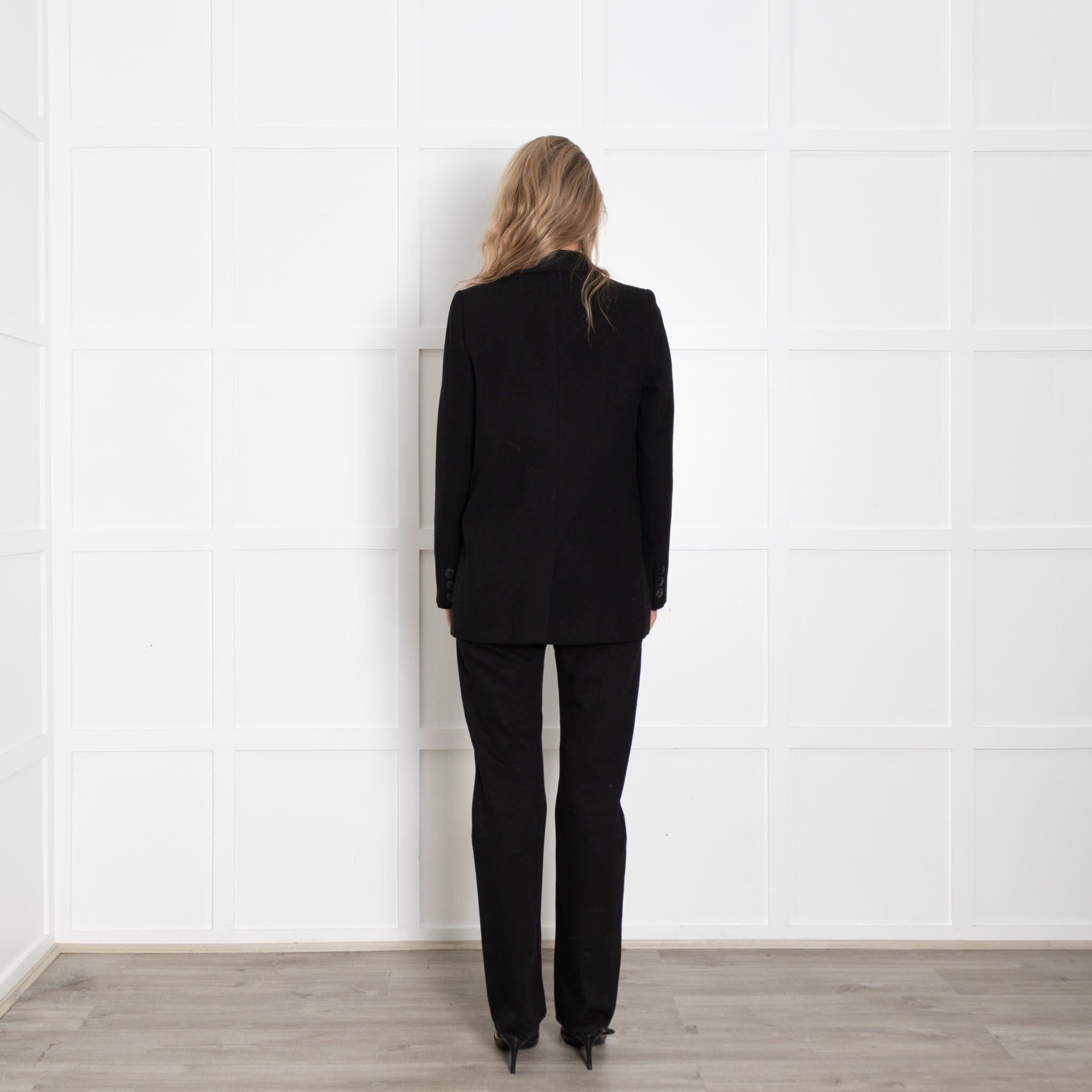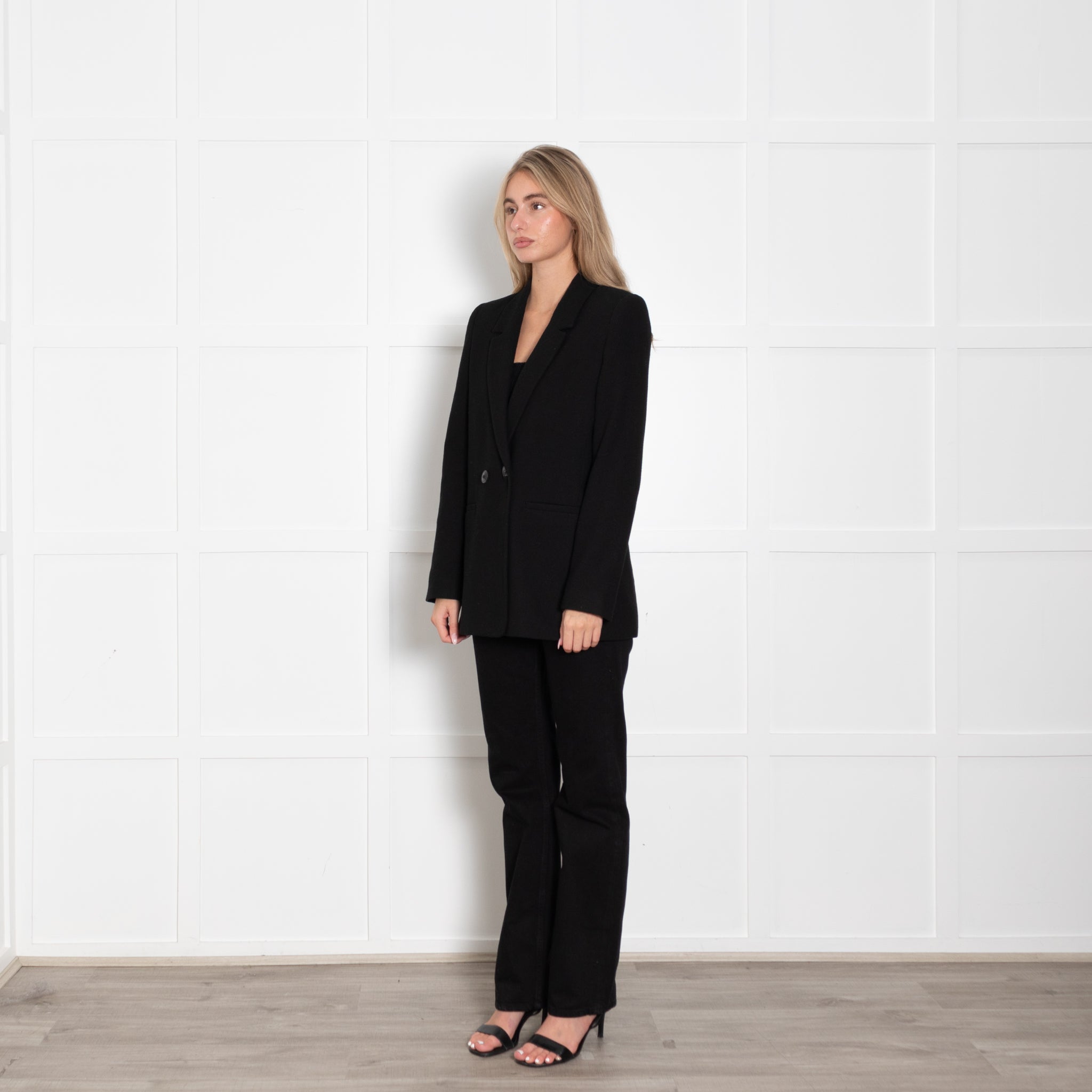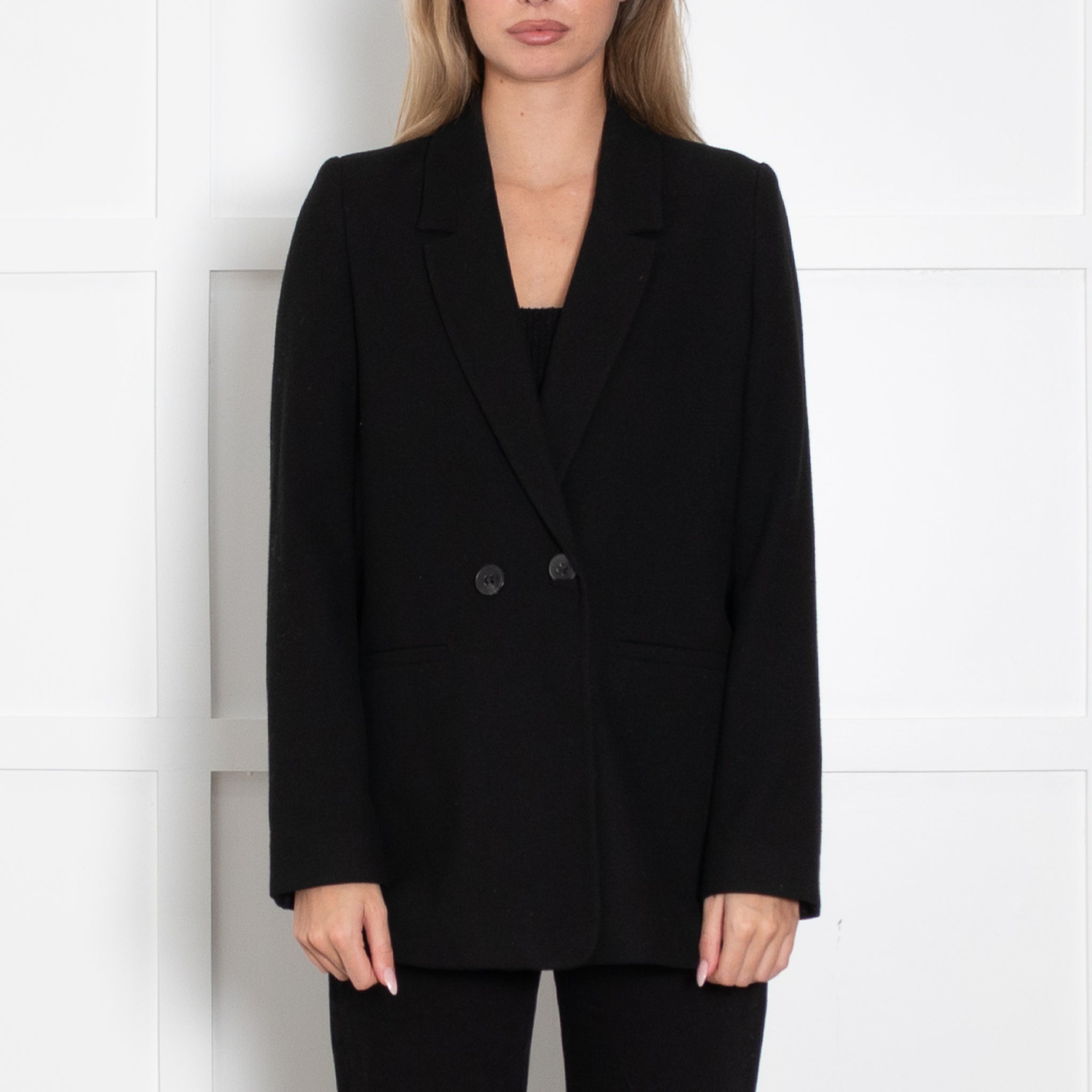 Anine Bing black wool blend jacket. Features a double-front button closure, two slip-faux pockets, and a pointed collar and lapel.