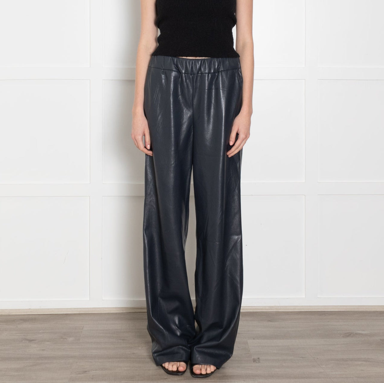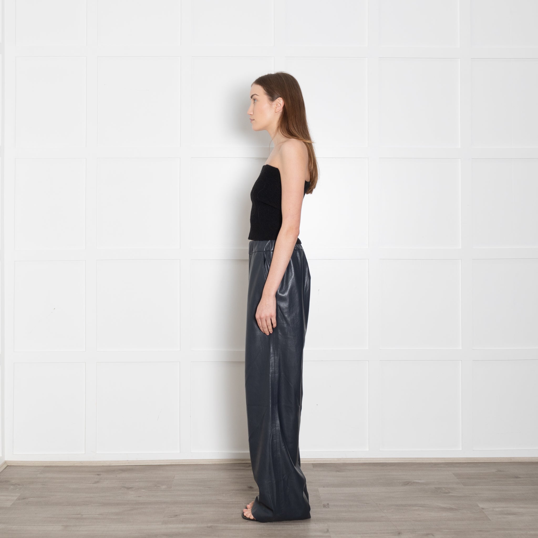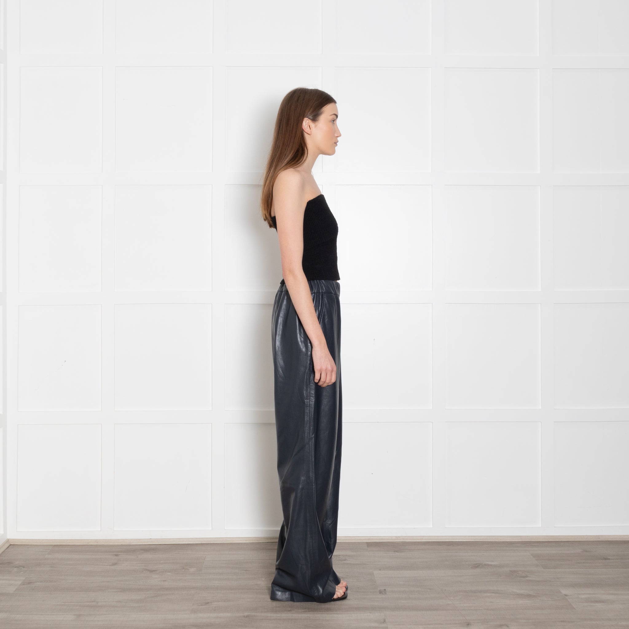 Anine Bing dark blue faux leather wide-leg trousers with an elasticated ruched waistband and two side slip pockets.