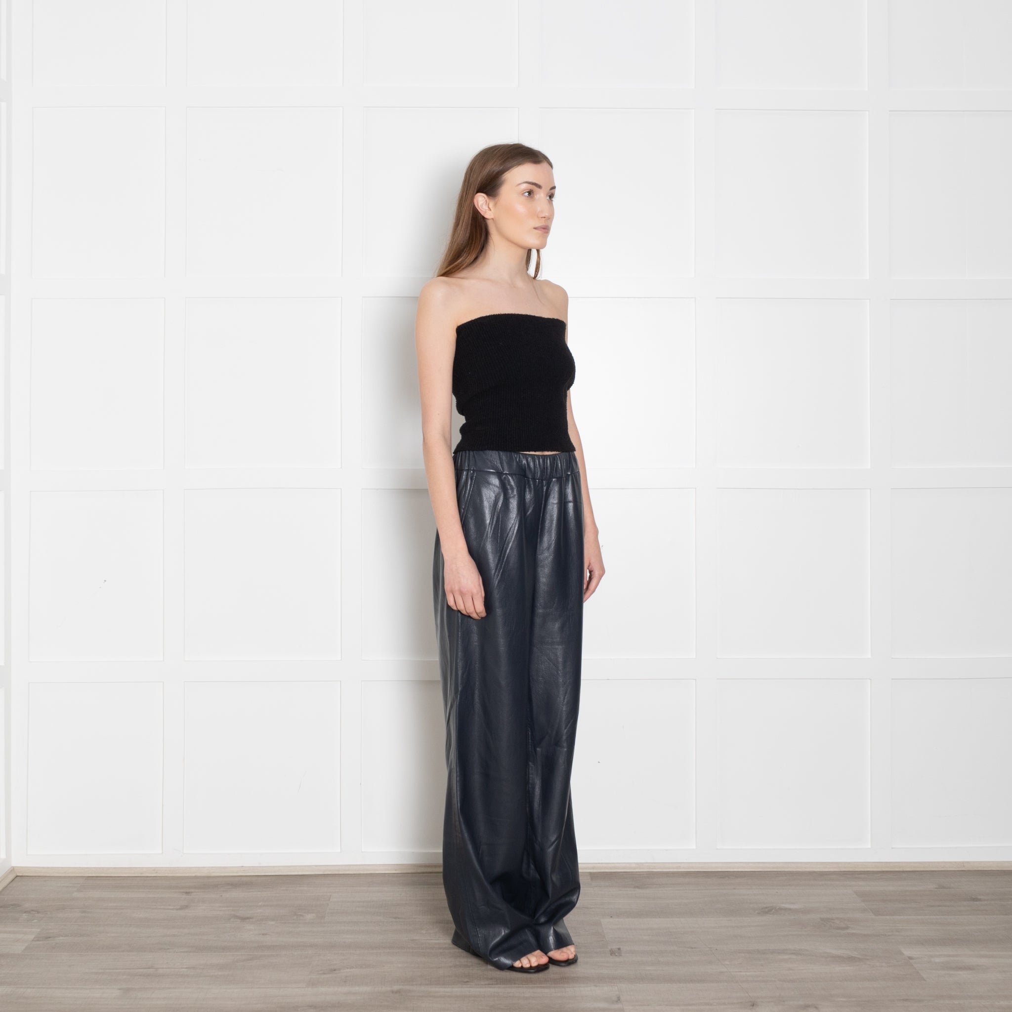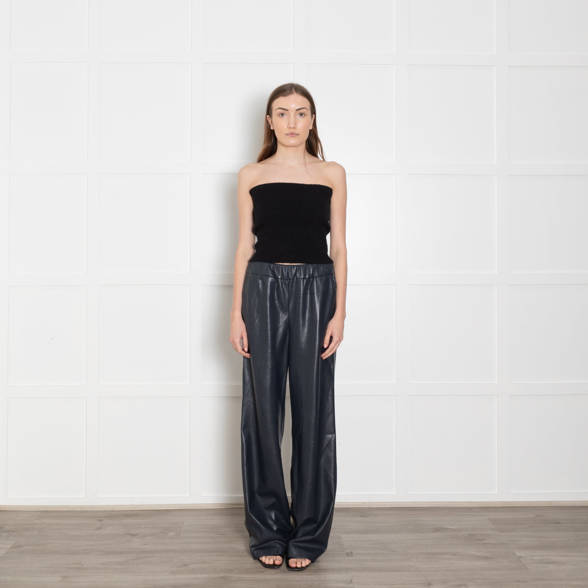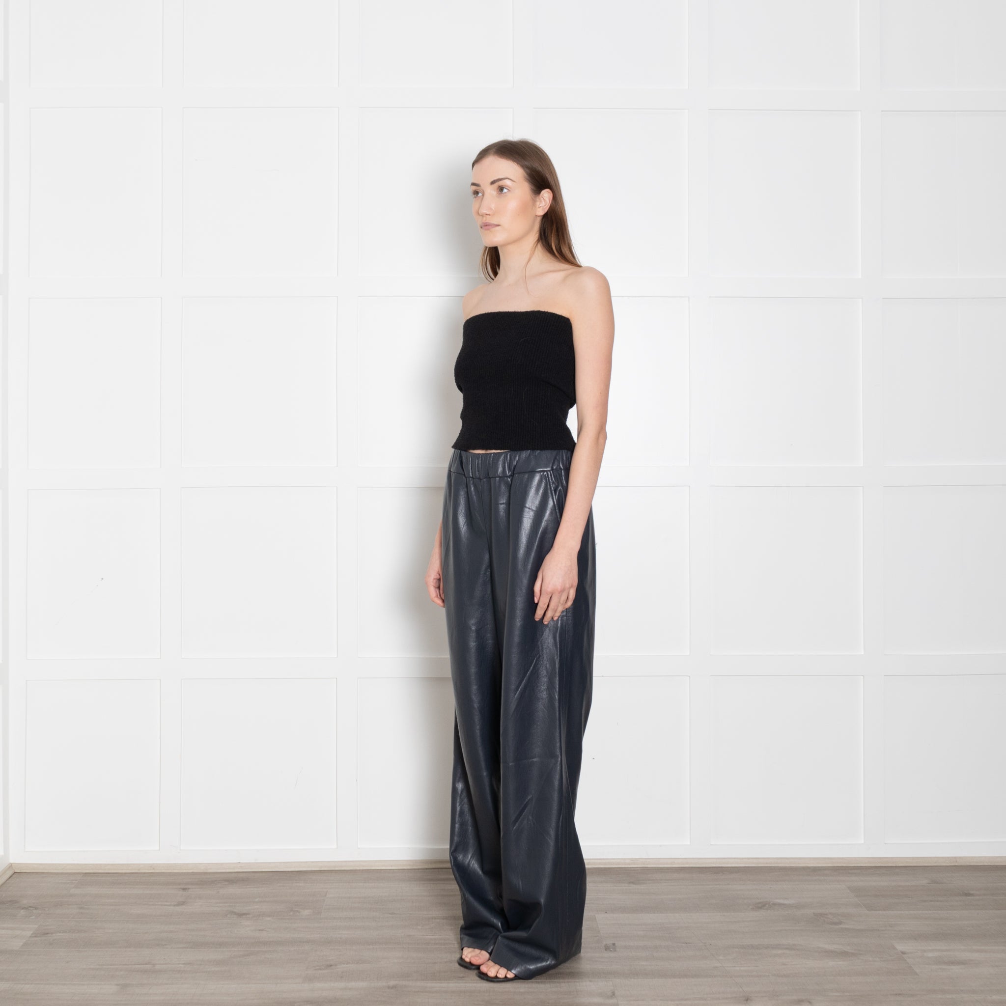Anine Bing dark blue faux leather wide-leg trousers with an elasticated ruched waistband and two side slip pockets.