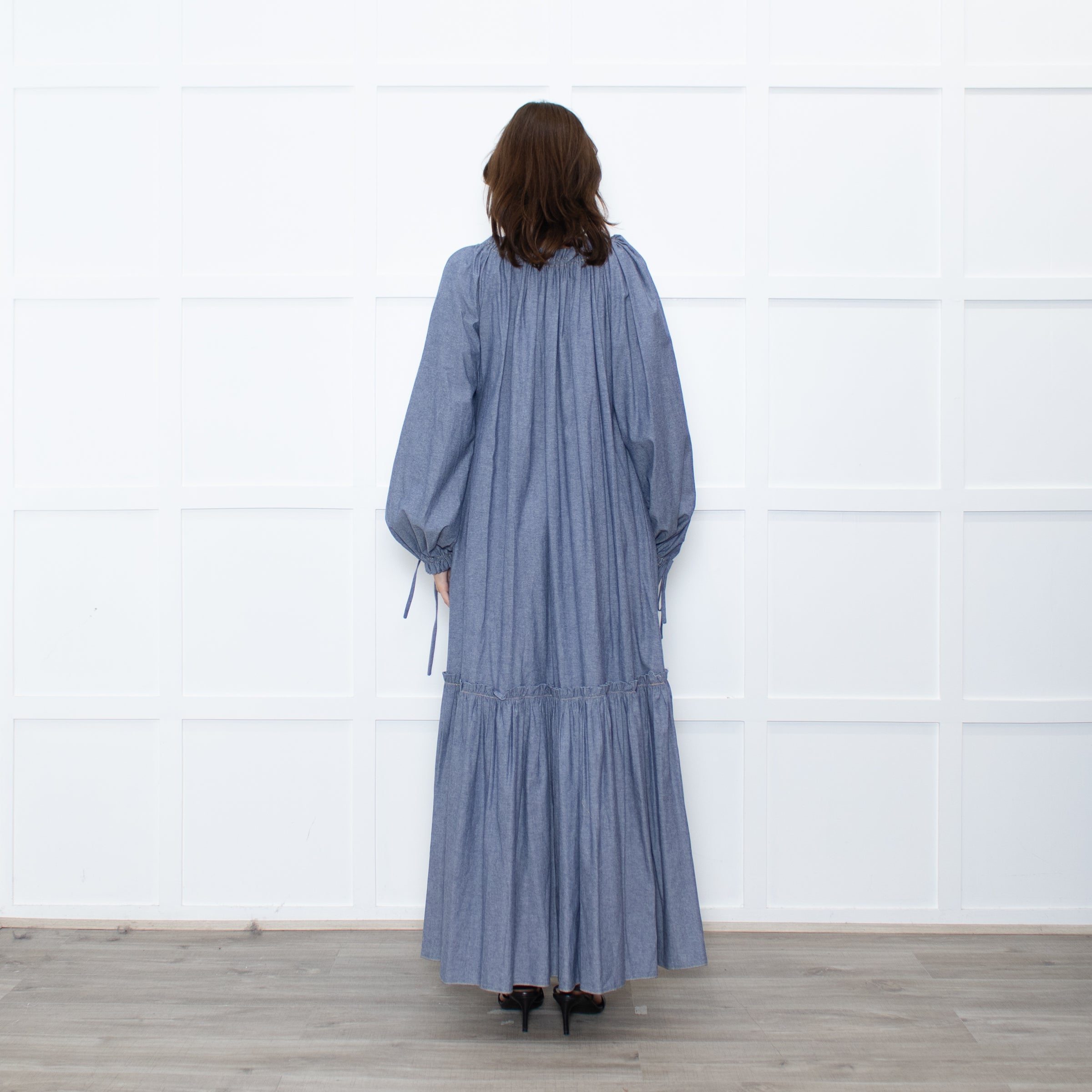 Anna Mason light dusky blue chanbray cotton maxi dress with long sleeves, a frill around the hem of the skirt, a drawstring-tied neckline, and a tied cuffs.