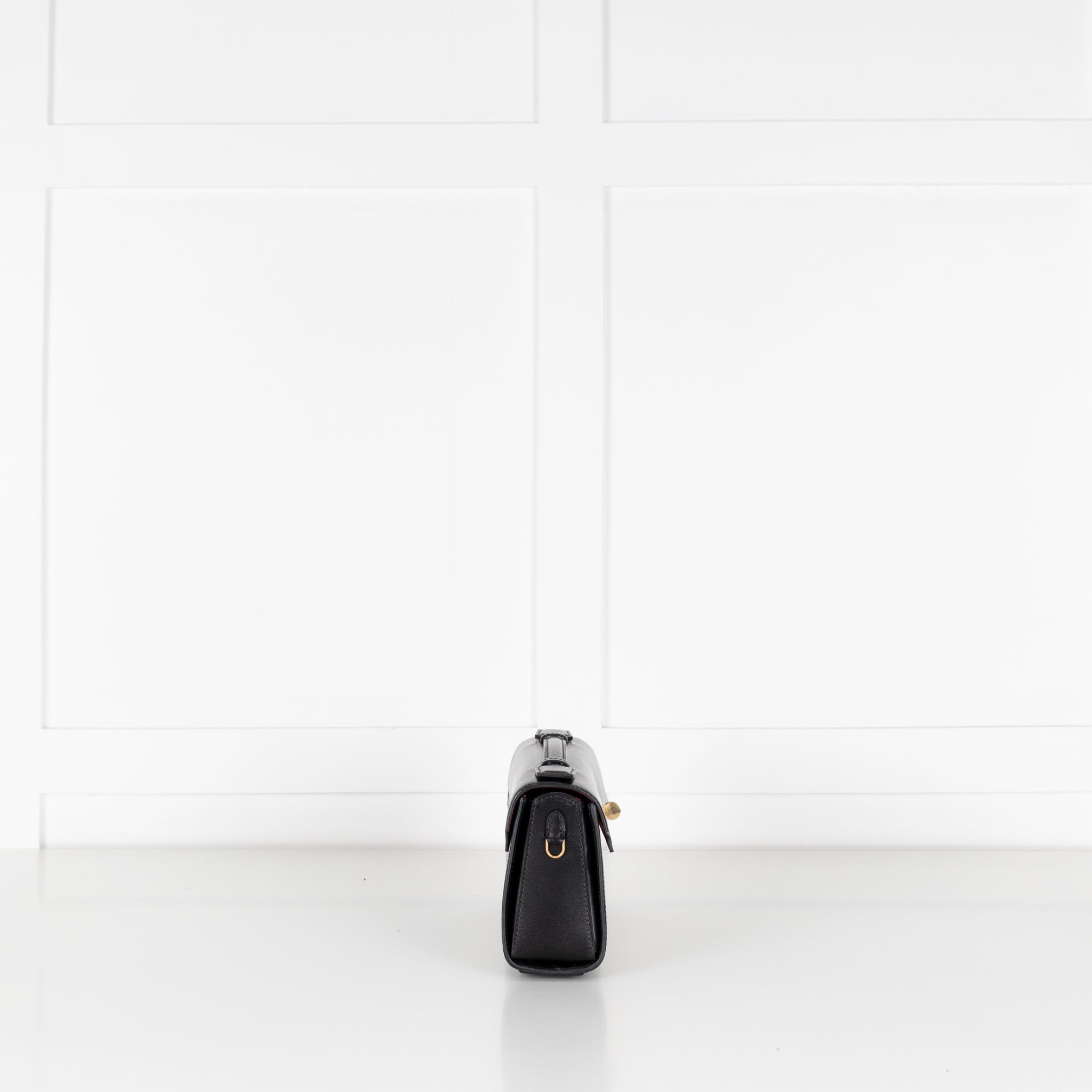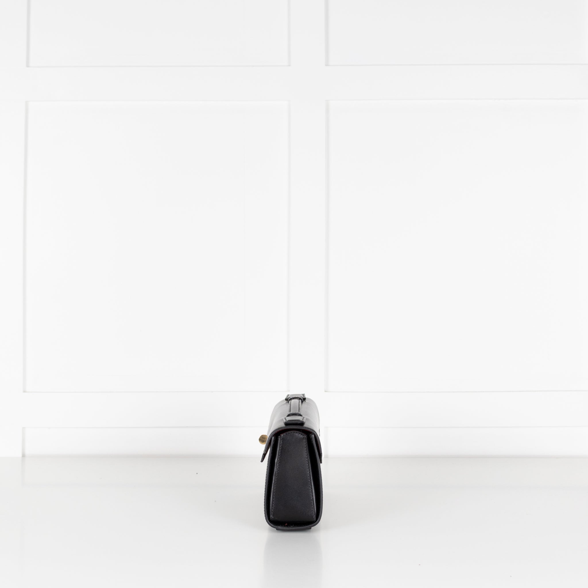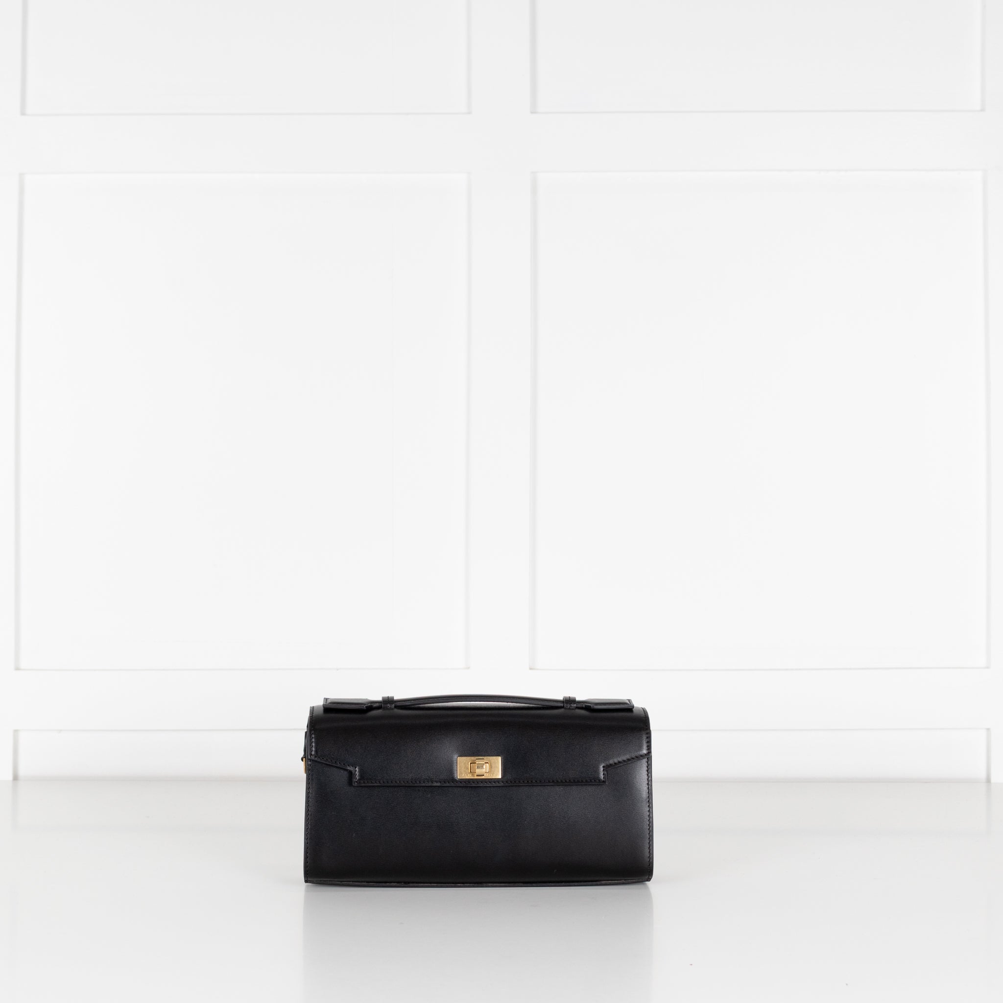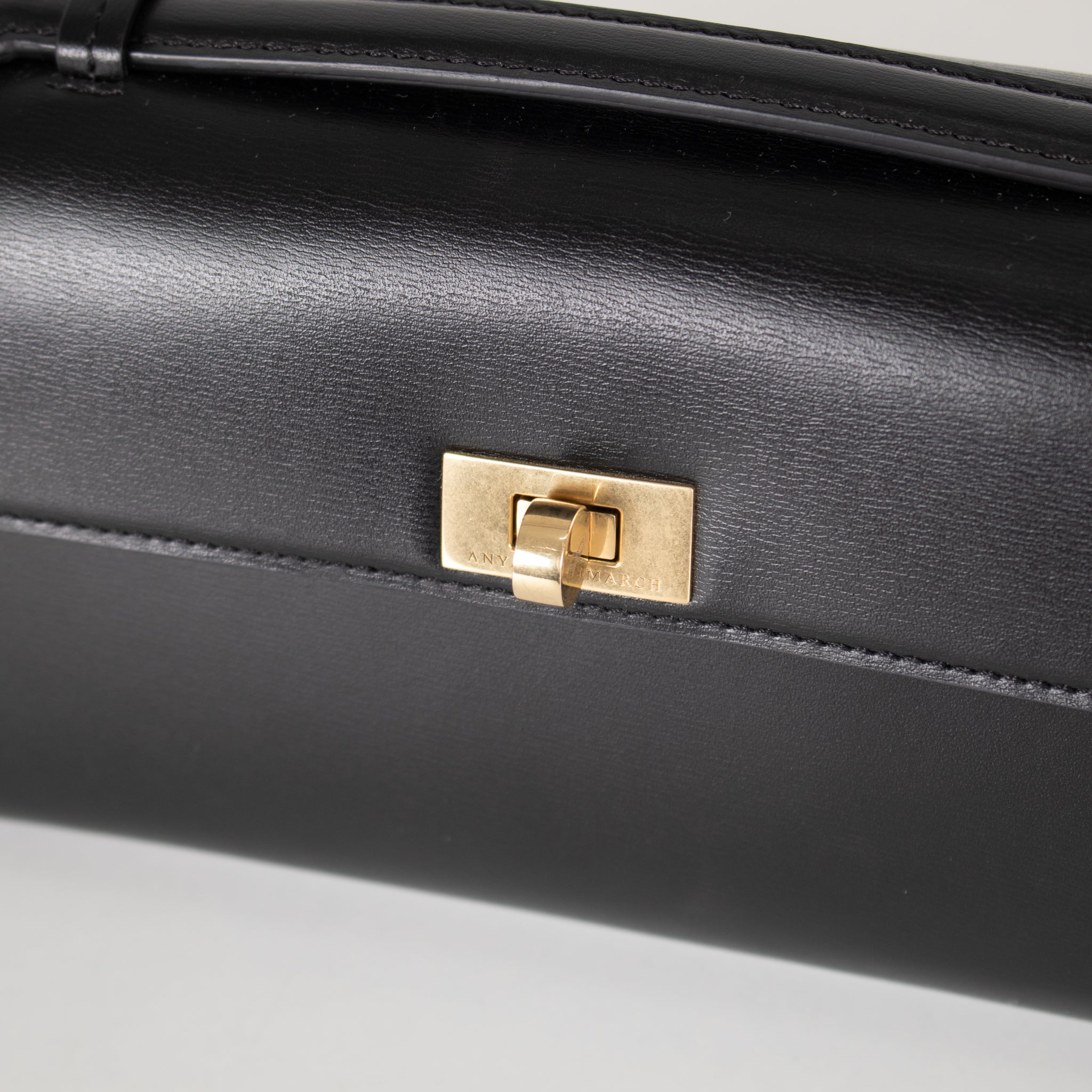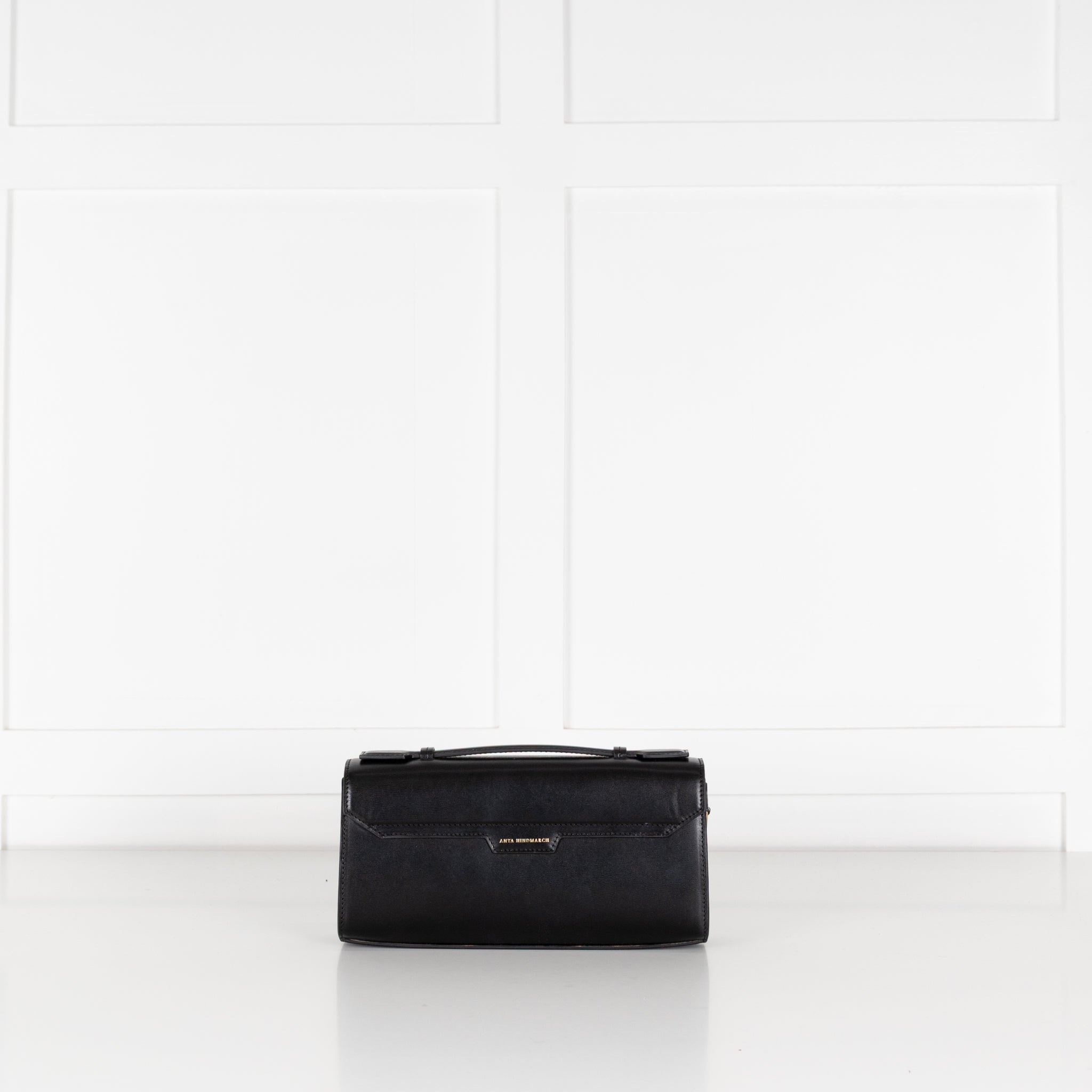 Anya Hindmarch black Mortimer leather clutch. Made in Florence from glossy, black, box-calf leather that has a gold rating from the Leather Working Group – the highest certification a tannery can receive for environmental and social practices. The interior is lined in vampire-red satin leather and fitted with smaller compartments. Carry it as a clutch or by the top handle. Accompanied by dust bag. RRP £1150