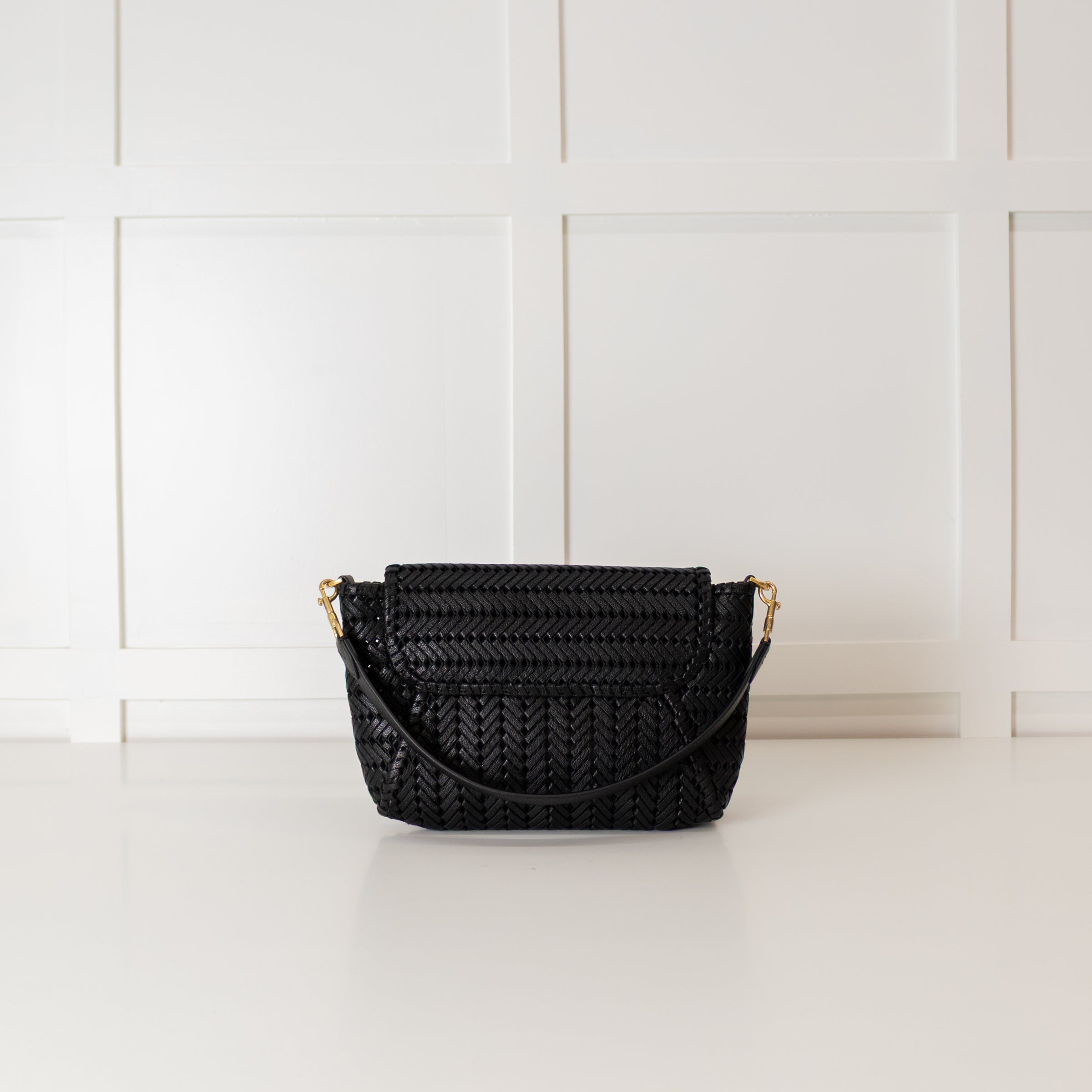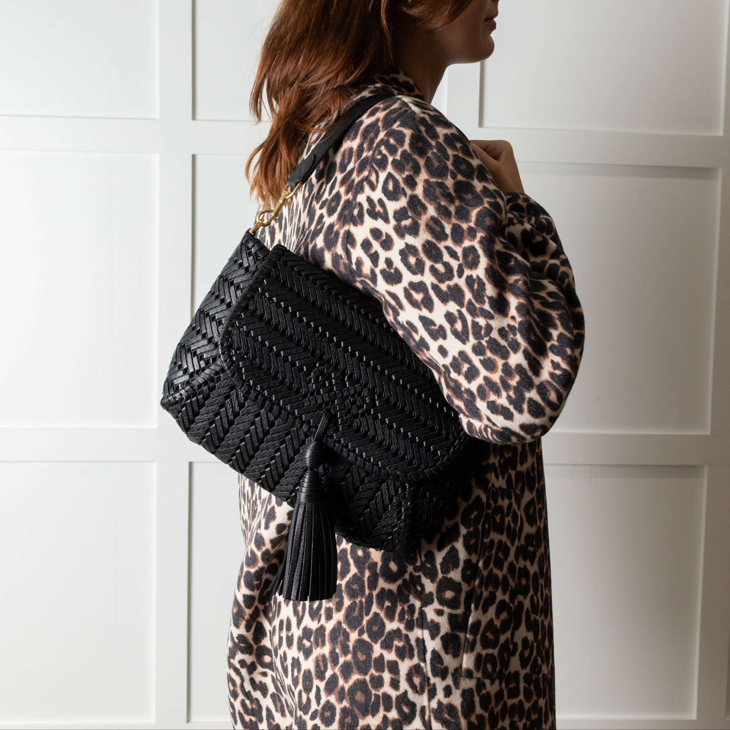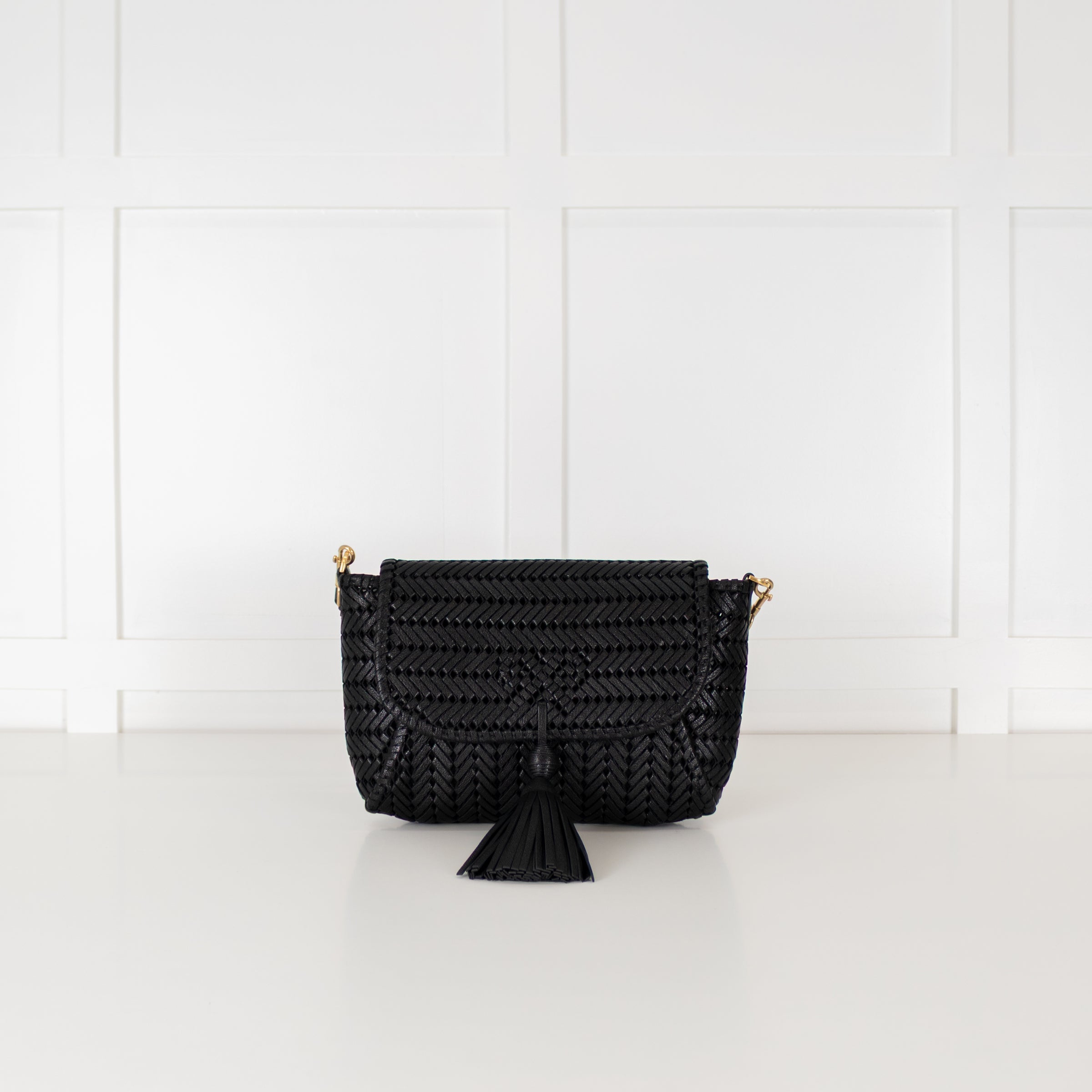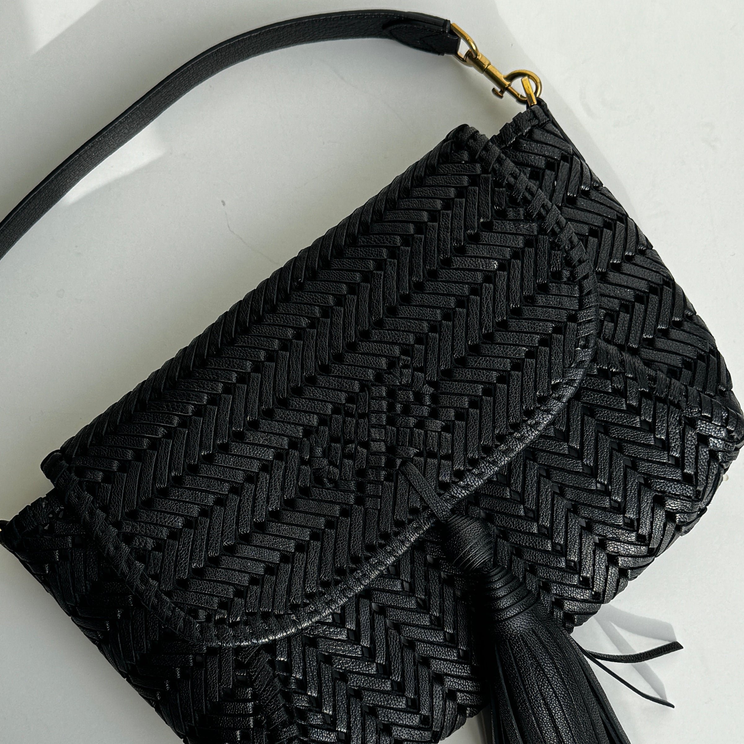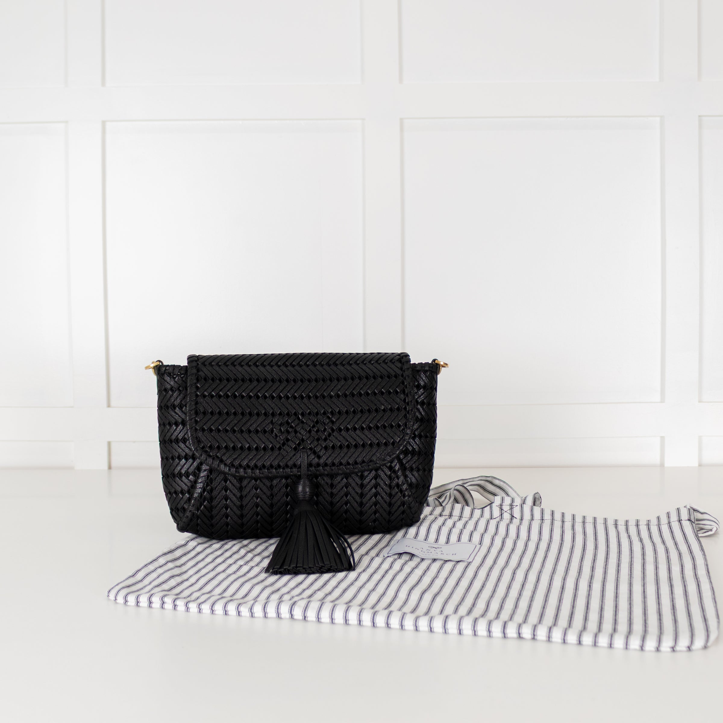 Anya Hindmarch black bag, featuring a front neeson tassel, a detachable top handle and a single button closure. A stunning woven design, with a large, spacious inside and a wallet-style feature inside.