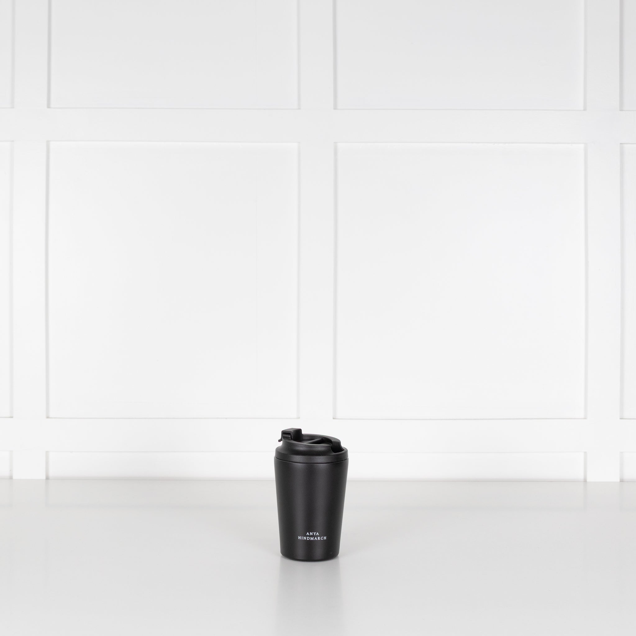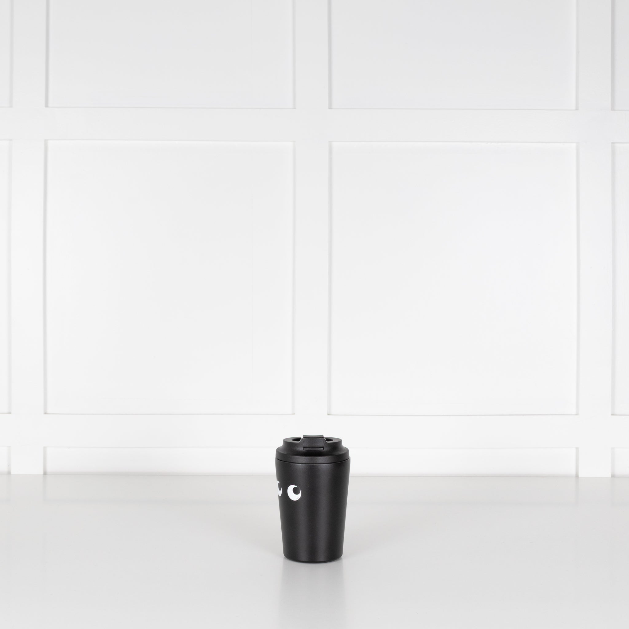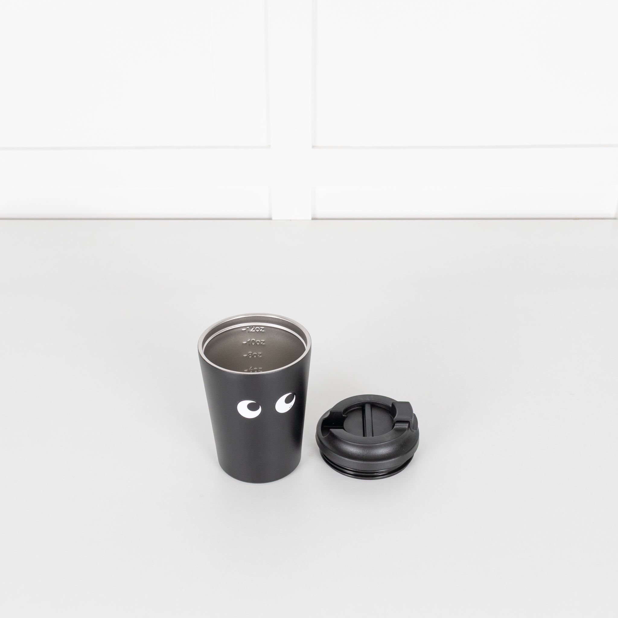 Anya Hindmarch stainless steel Pont Street black coffee cup, featuring a stunning iconic white eye design motif on the centre. The capacity of this coffee cup is 350ml, and it is accompanied by the original box.