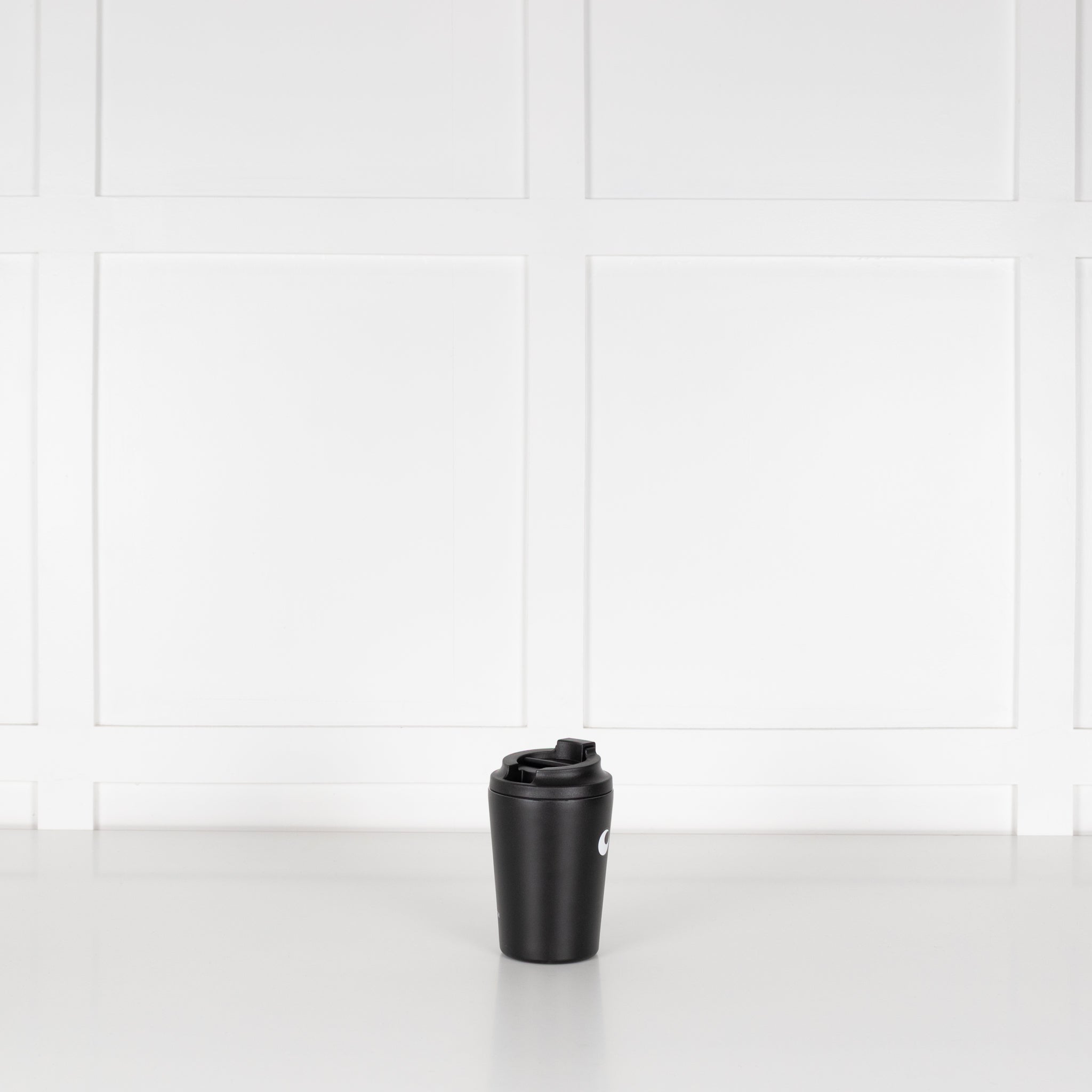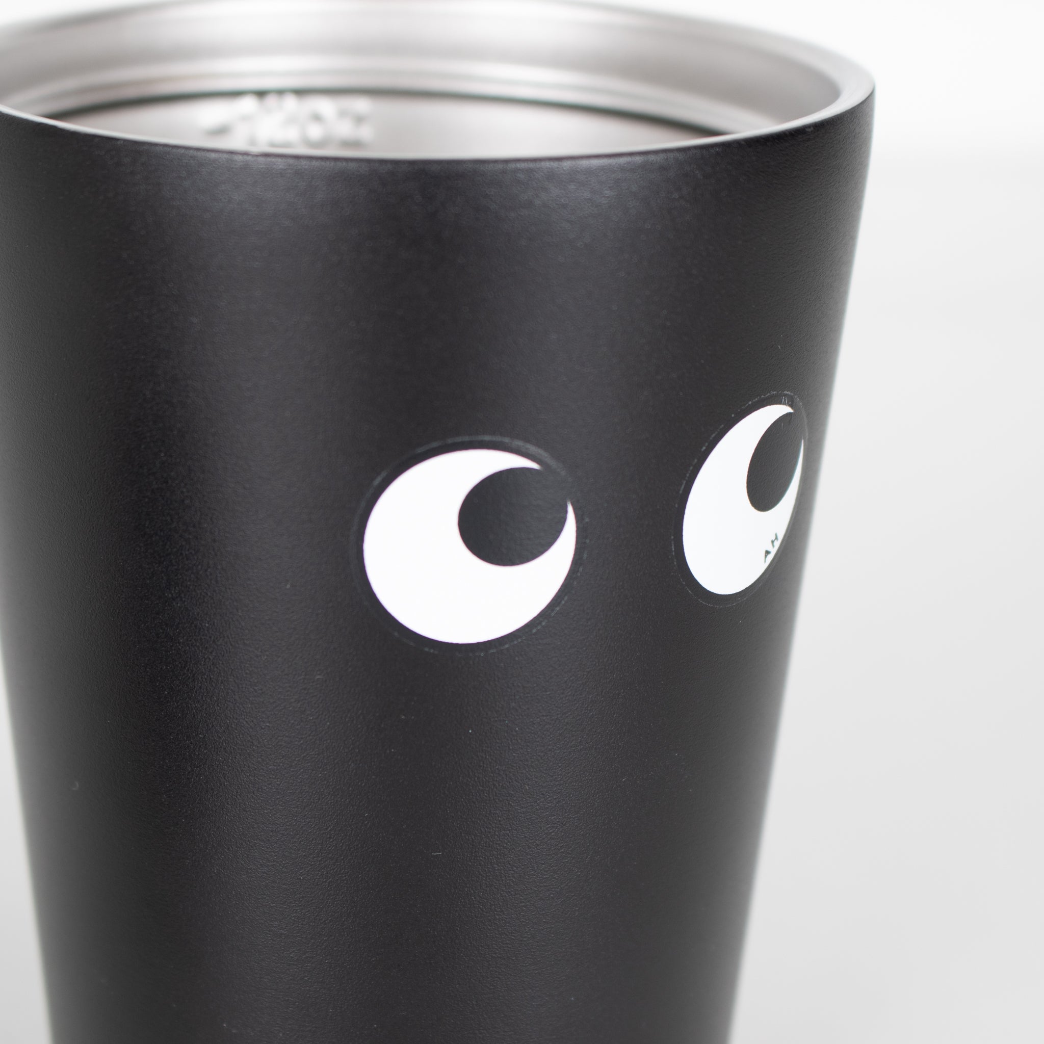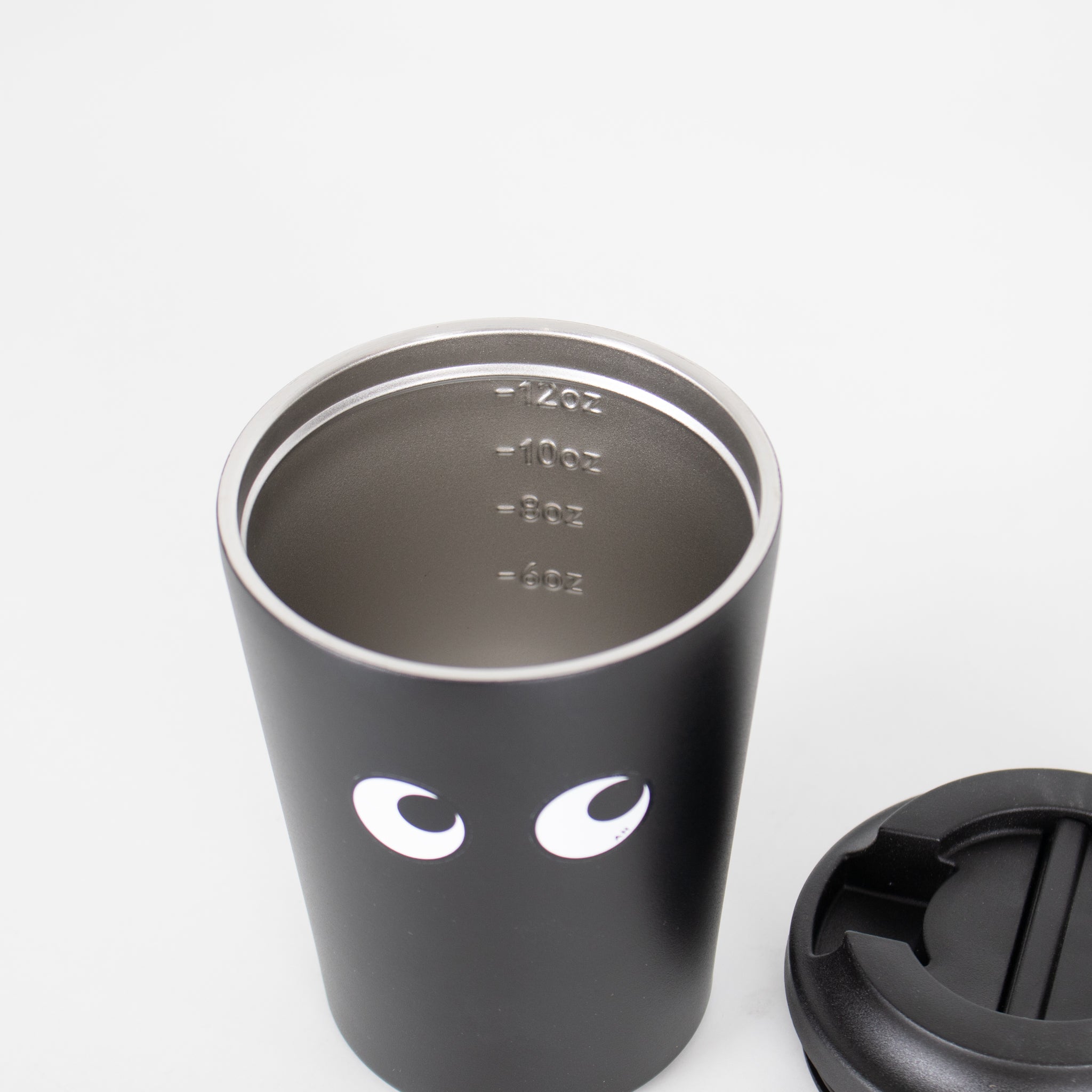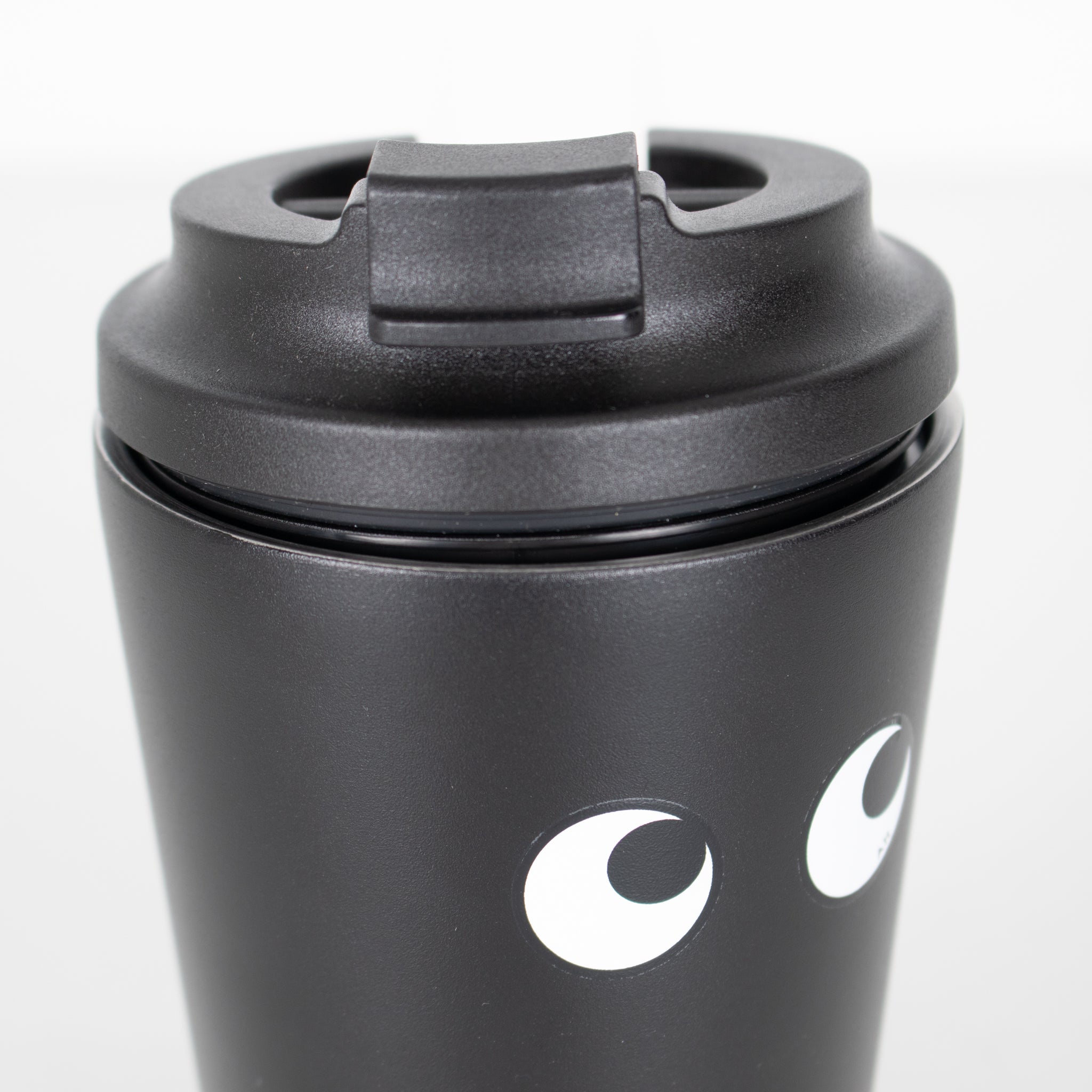 Anya Hindmarch stainless steel Pont Street black coffee cup, featuring a stunning iconic white eye design motif on the centre. The capacity of this coffee cup is 350ml, and it is accompanied by the original box.