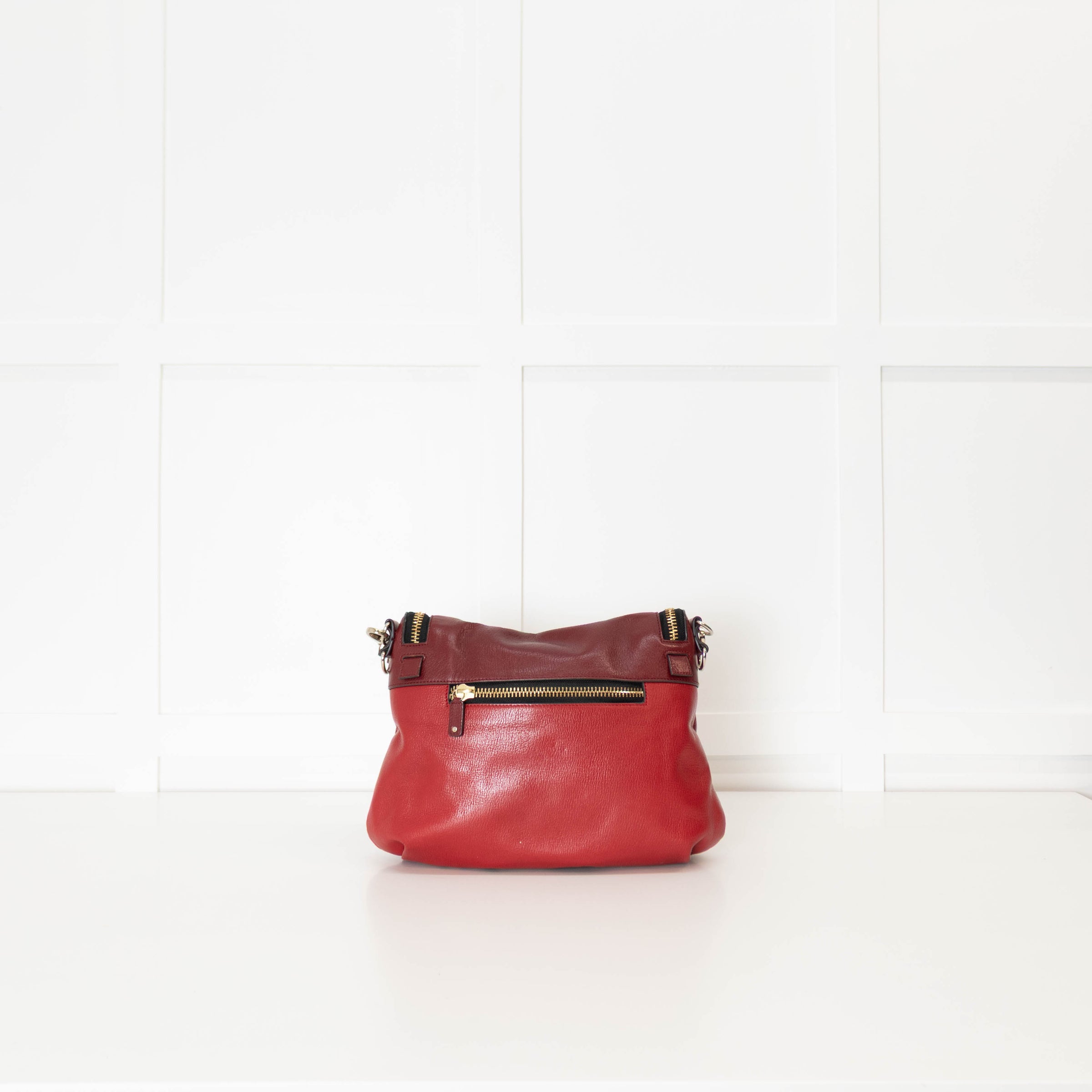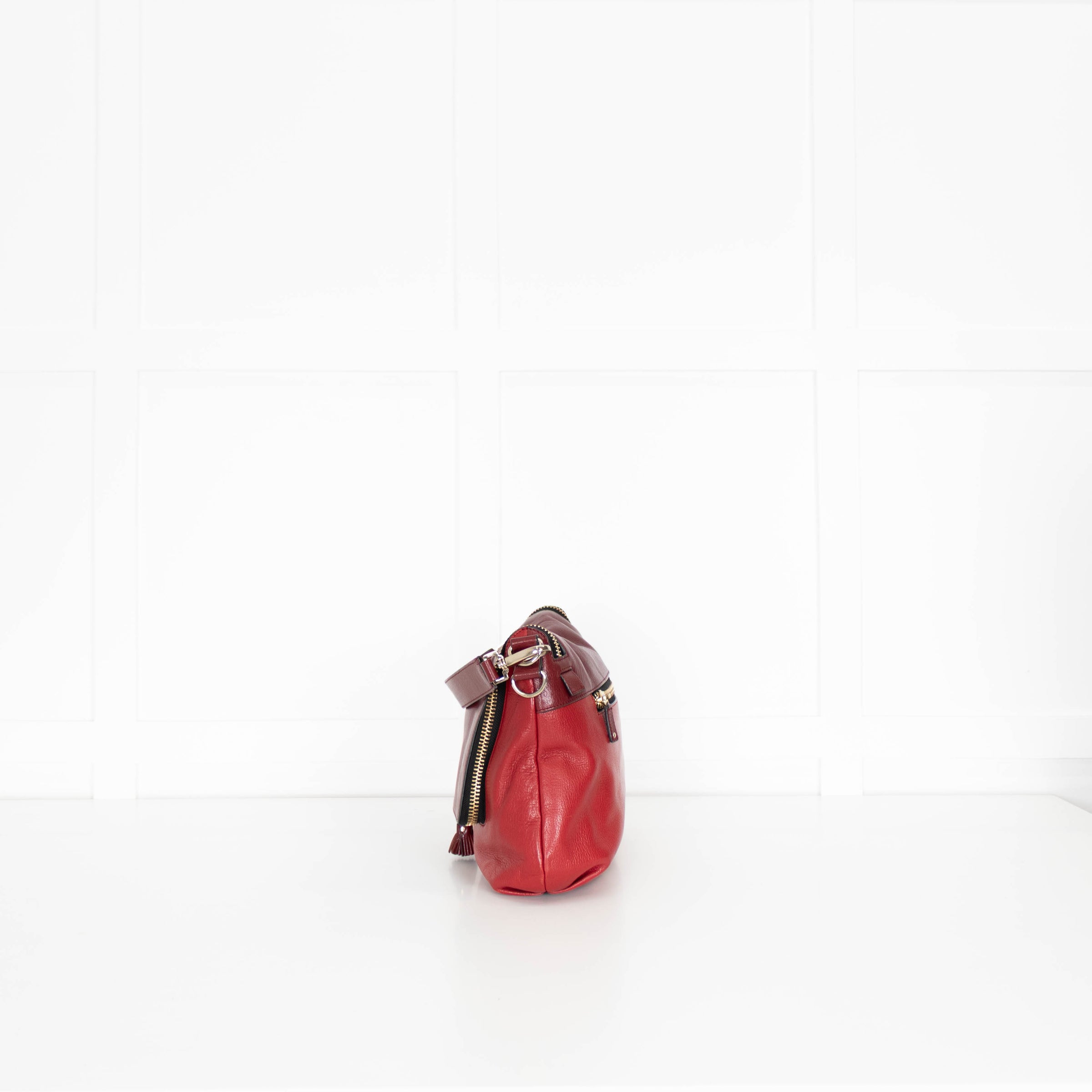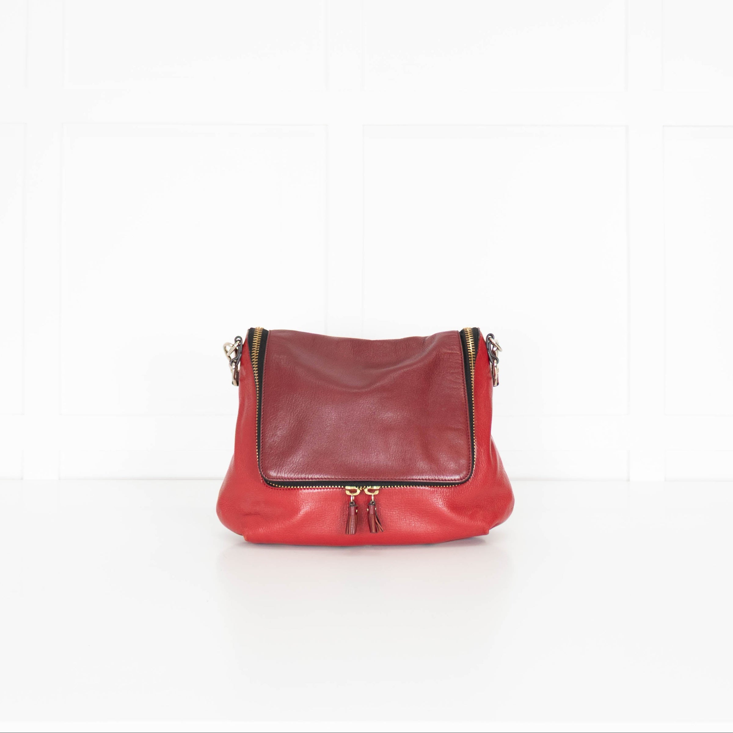 Anya Hindmarch red/ burgundy leather 'Vere' shoulder bag satchel with multiple straps. Featuring gold hardware, a short zip detail shoulder strap, an adjustable canvas/ leather trim strap, a magnetic front flap that can also be zipped shut for extra security, tasselled zip pulls, and a rear zipped slip pocket. Opening onto a leather insert with dedicated card and phone pockets.
