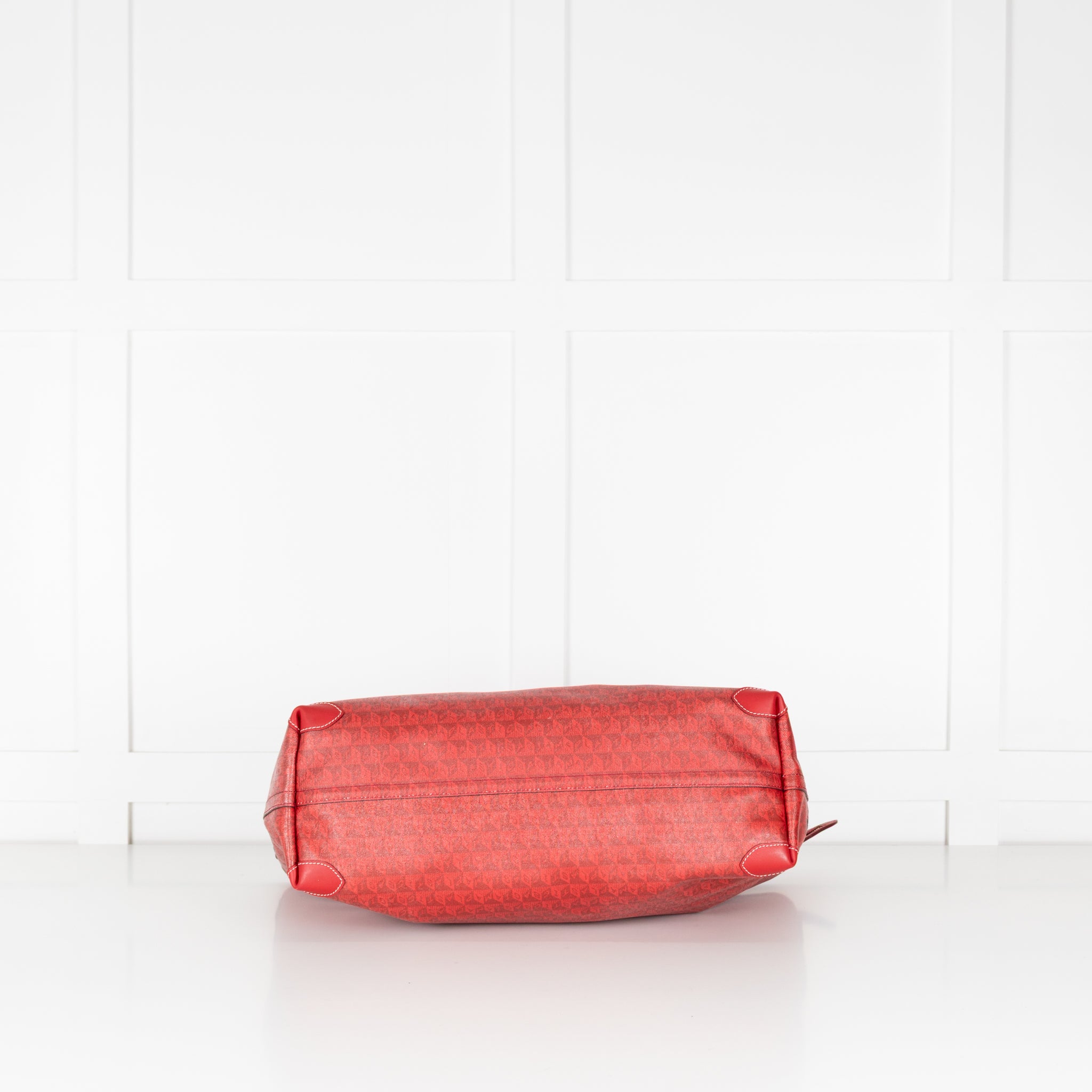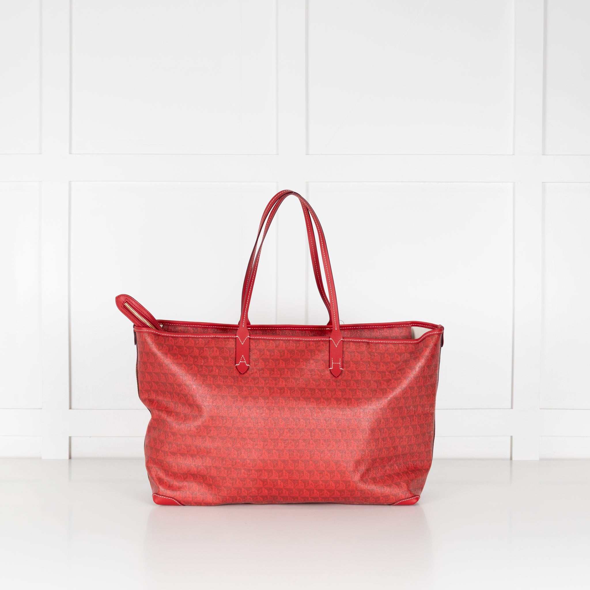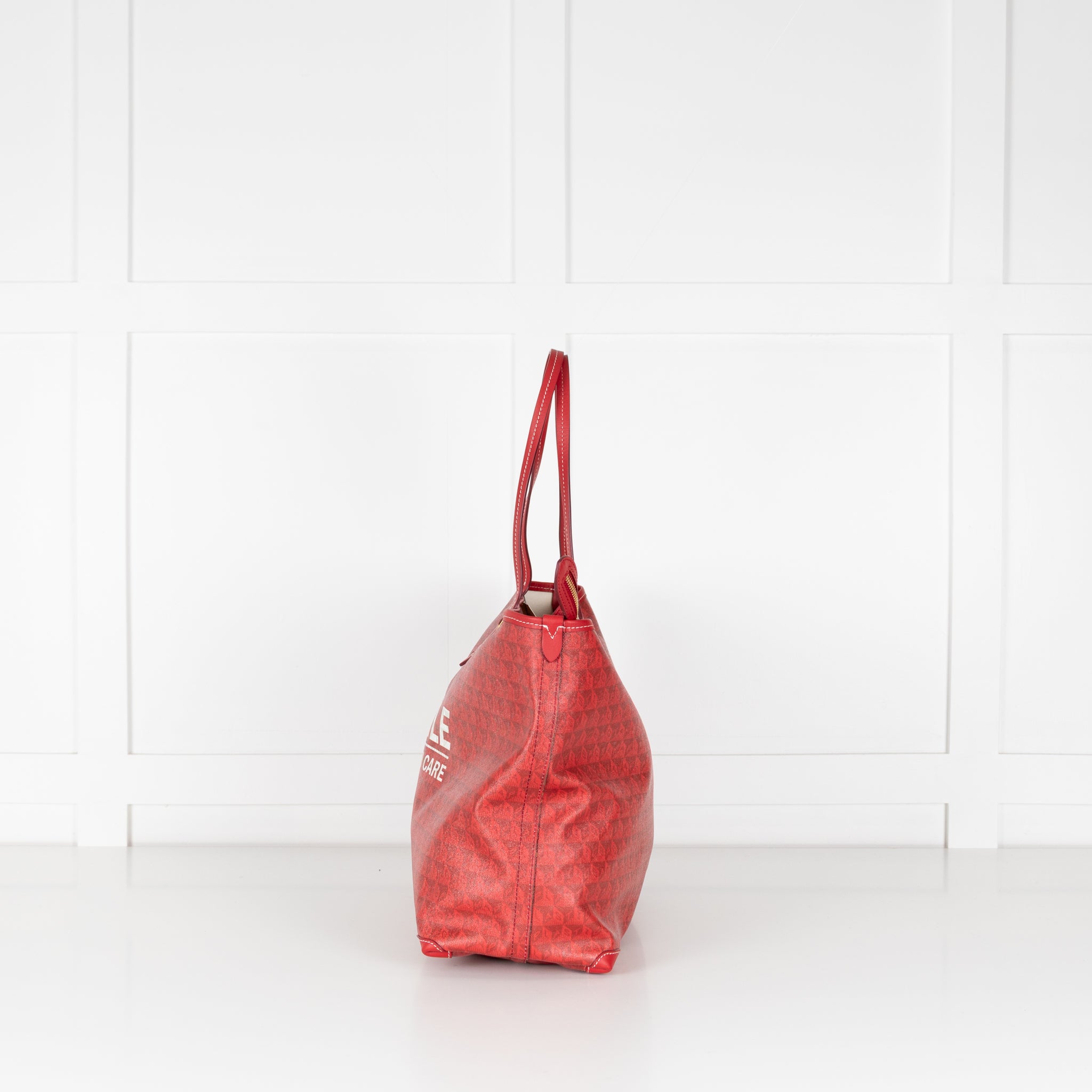 Anya Hindmarch red recycled canvas tote bag. Part of the I Am A Plastic Bag collection, this tote is made from 32 half-litre recycled plastic bottles, coated in a durable, weather-resistant material made from car windshields and finished with leather from a Gold Standard Working Group Tannery to ensure full traceability of byproduct skins with no deforestation. It’s generously sized to fit daily essentials, with a labelled leather card holder and a zip to keep everything safely stowed. Featuring a 'Fragile Handle With Care' logo.
