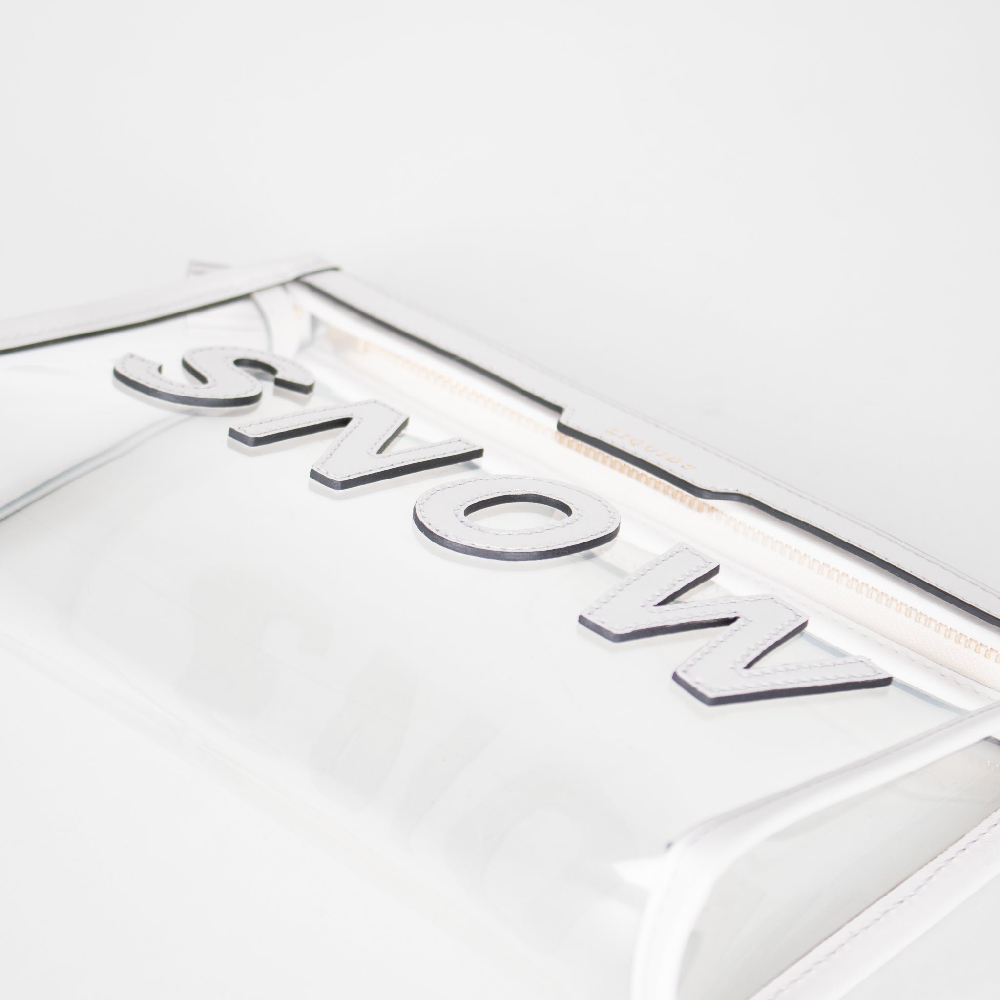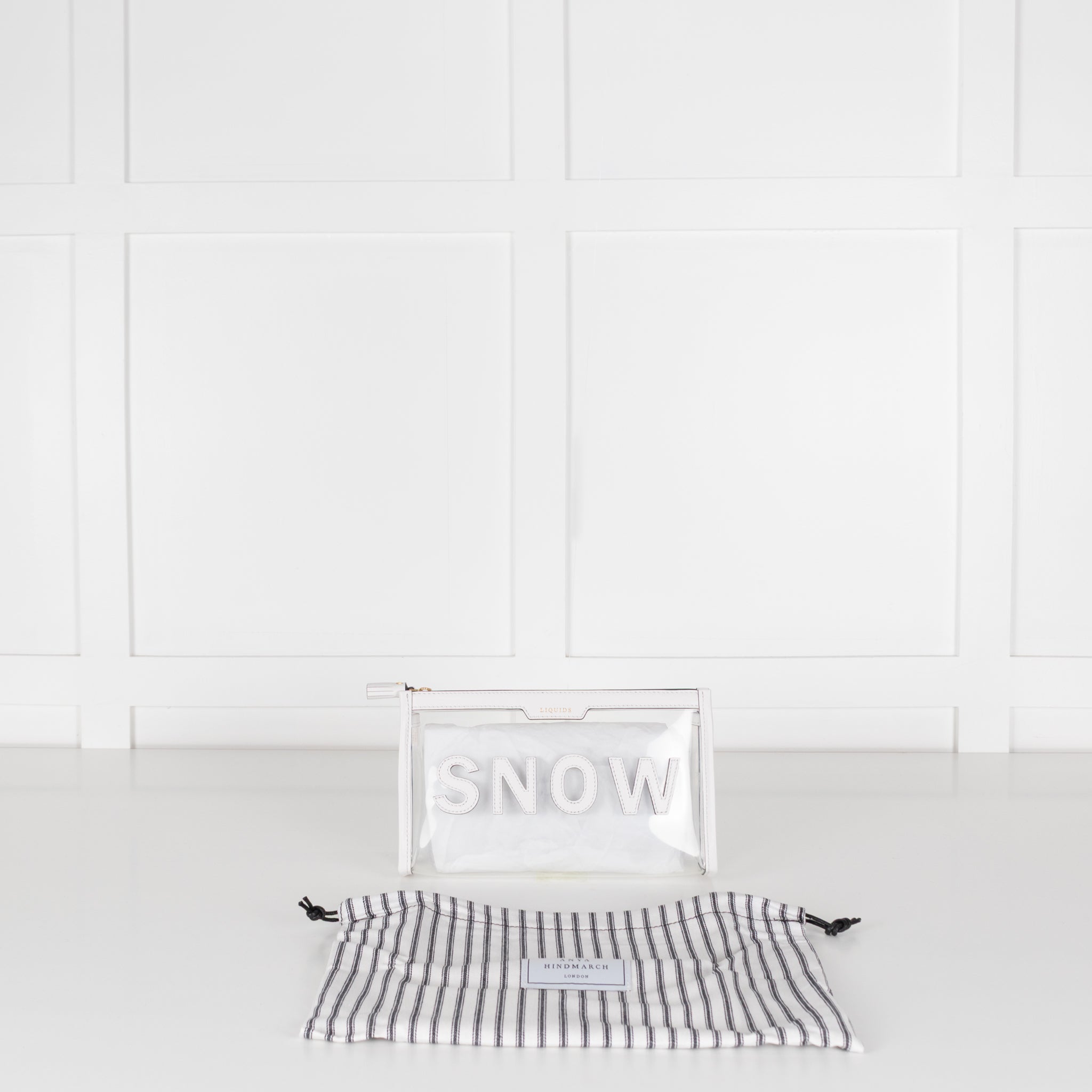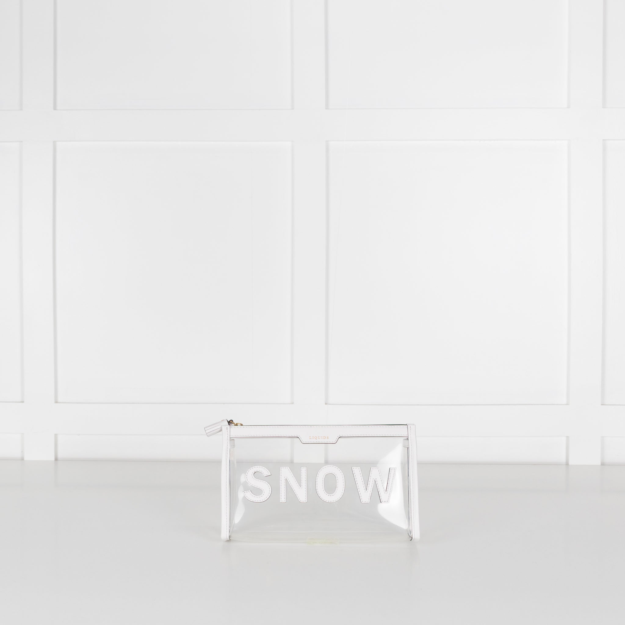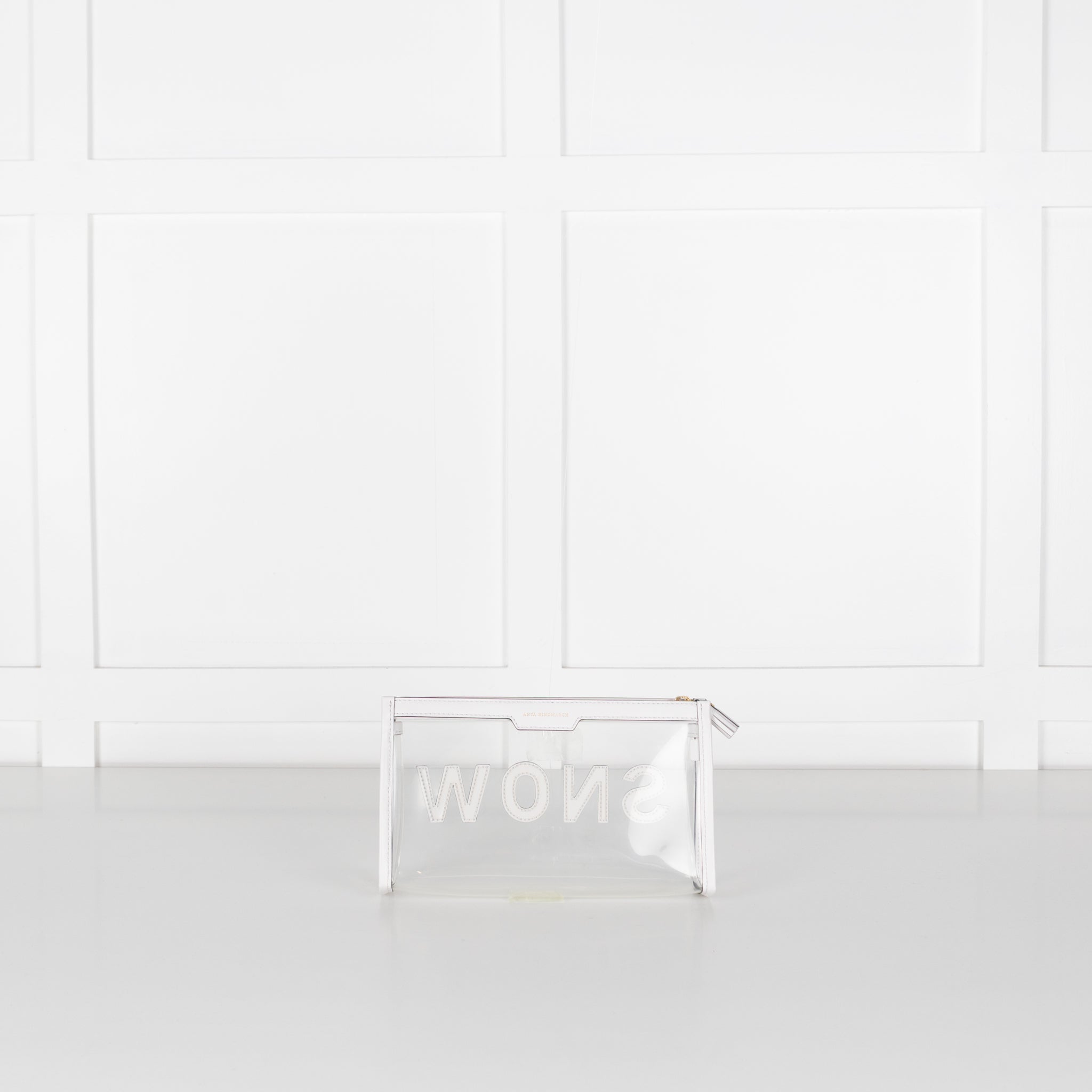 Anya Hindmarch wash bag, featuring a large transparent body with white leather trims, a stunning large 'SNOW'  word motif in the centre, with leather fabric. The dust bag is included.