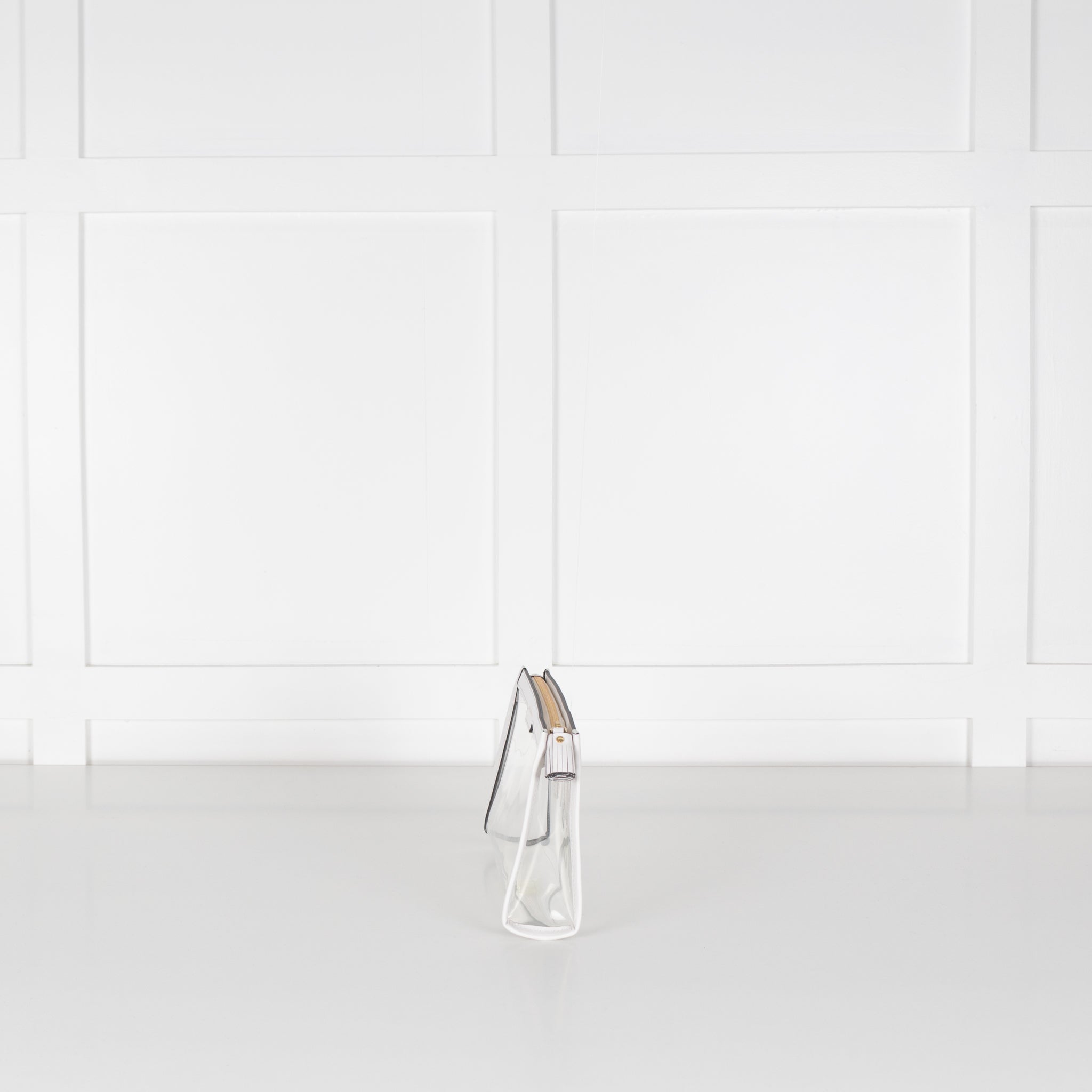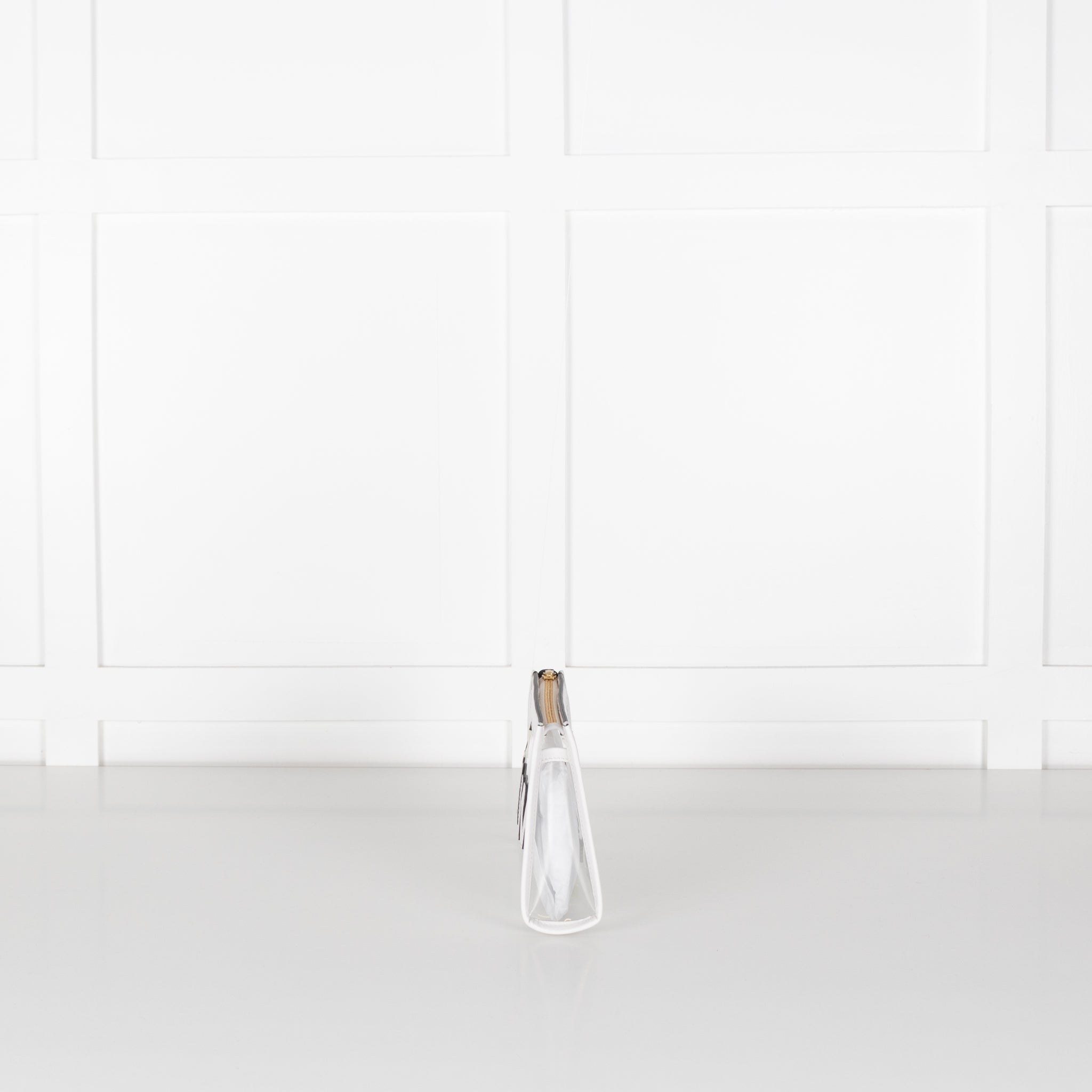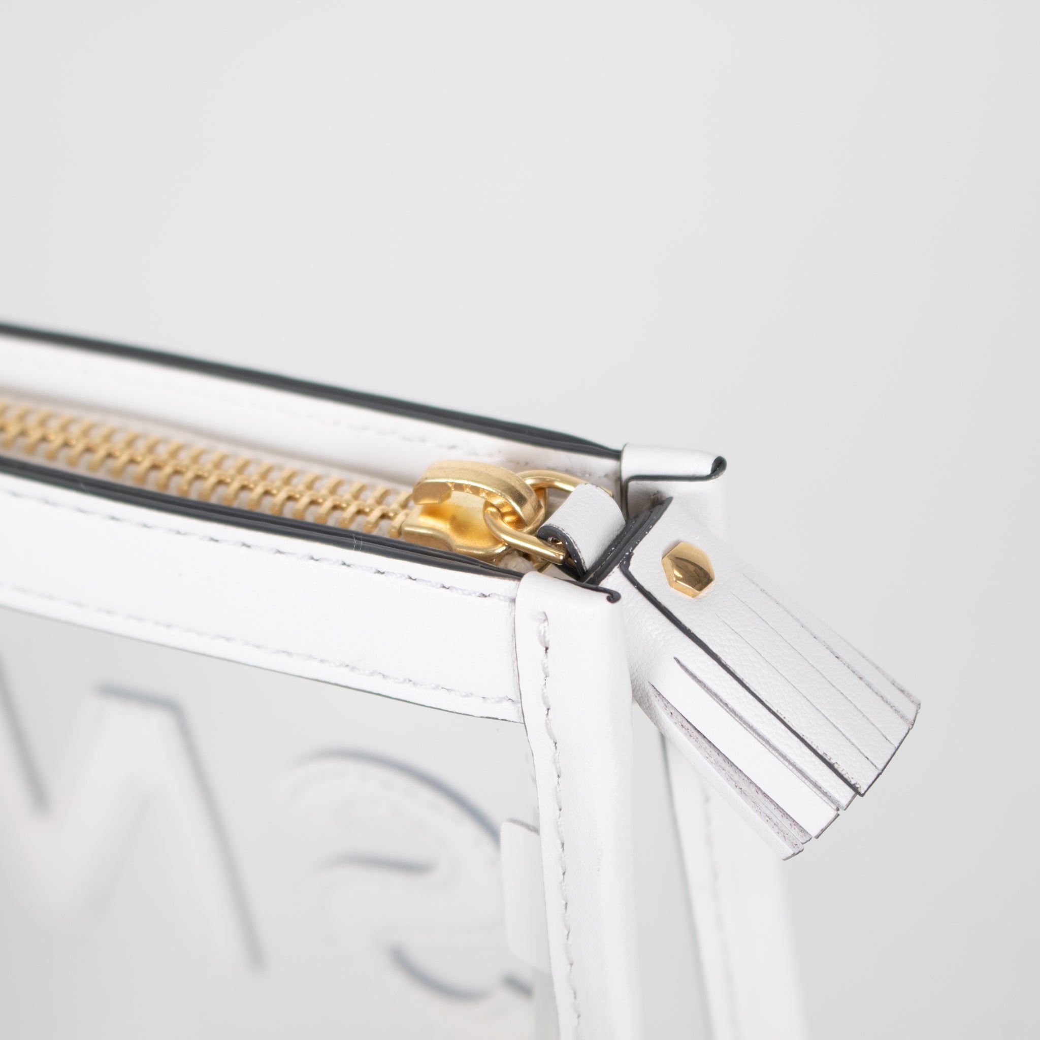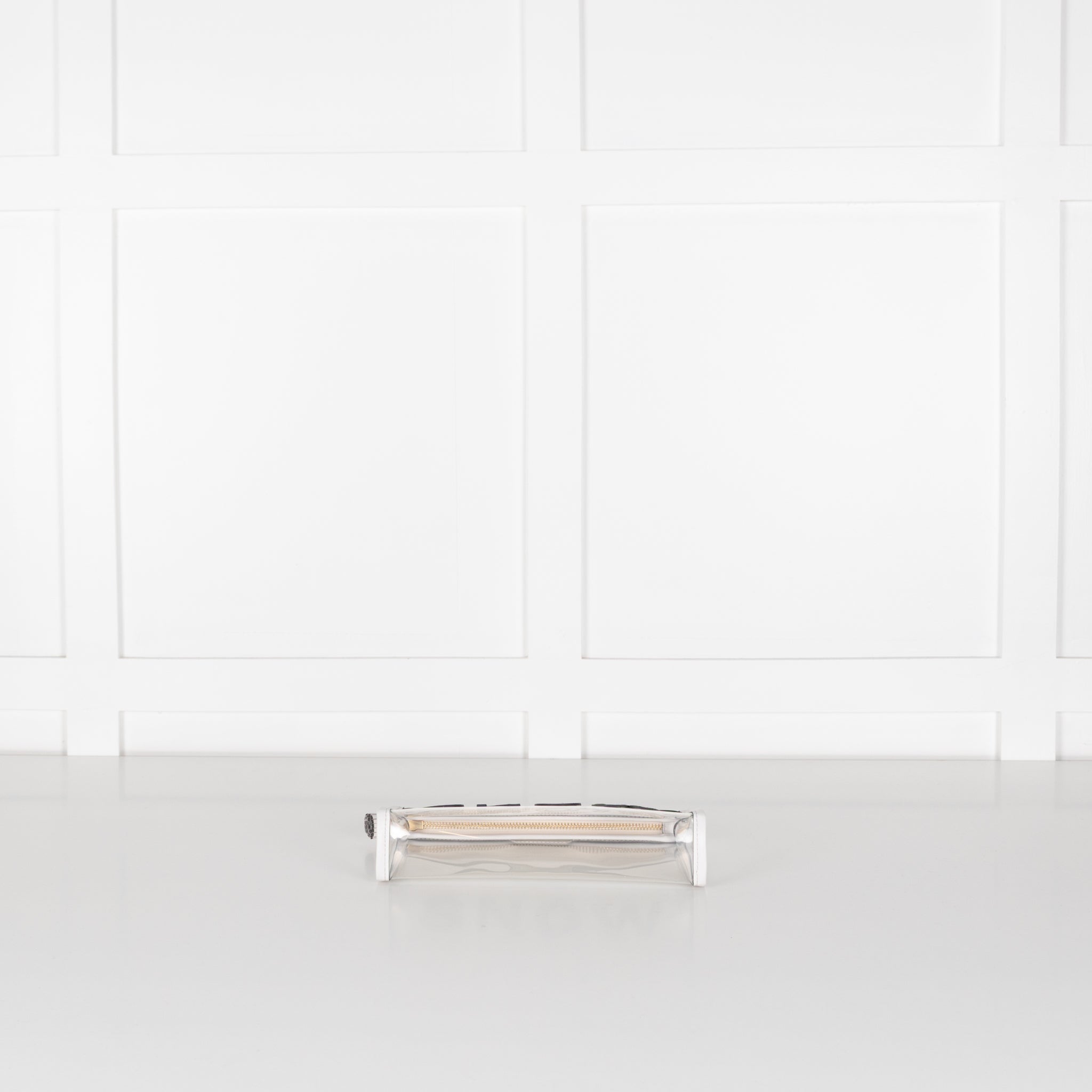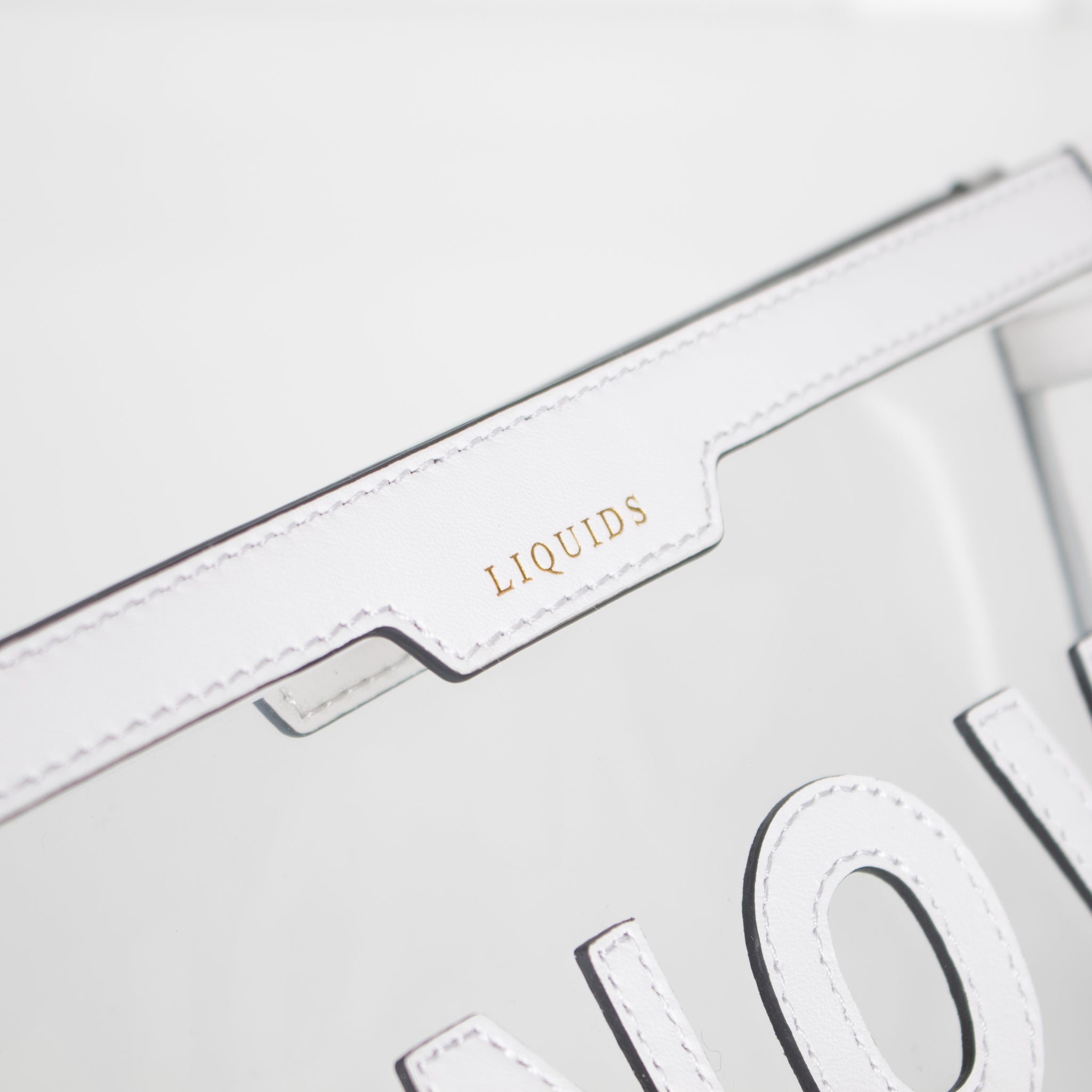 Anya Hindmarch wash bag, featuring a large transparent body with white leather trims, a stunning large 'SNOW'  word motif in the centre, with leather fabric. The dust bag is included.