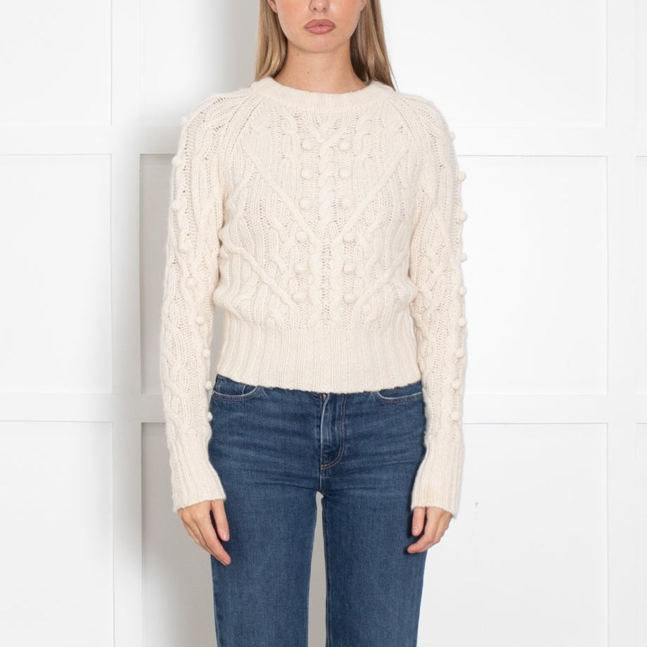 Autumn Cashmere comfy long-sleeve cream jumper, crafted with a soft cashmere fabric, featuring a cable knit short design, with cashmere pom-pom embroidery, and a thick-lined round neckline.
