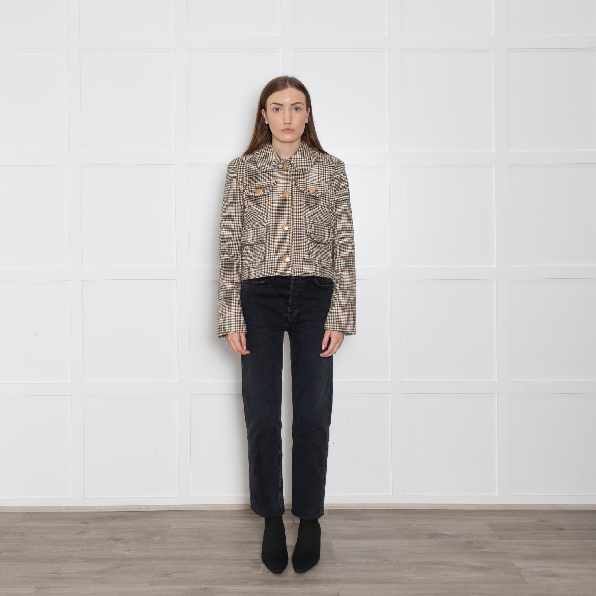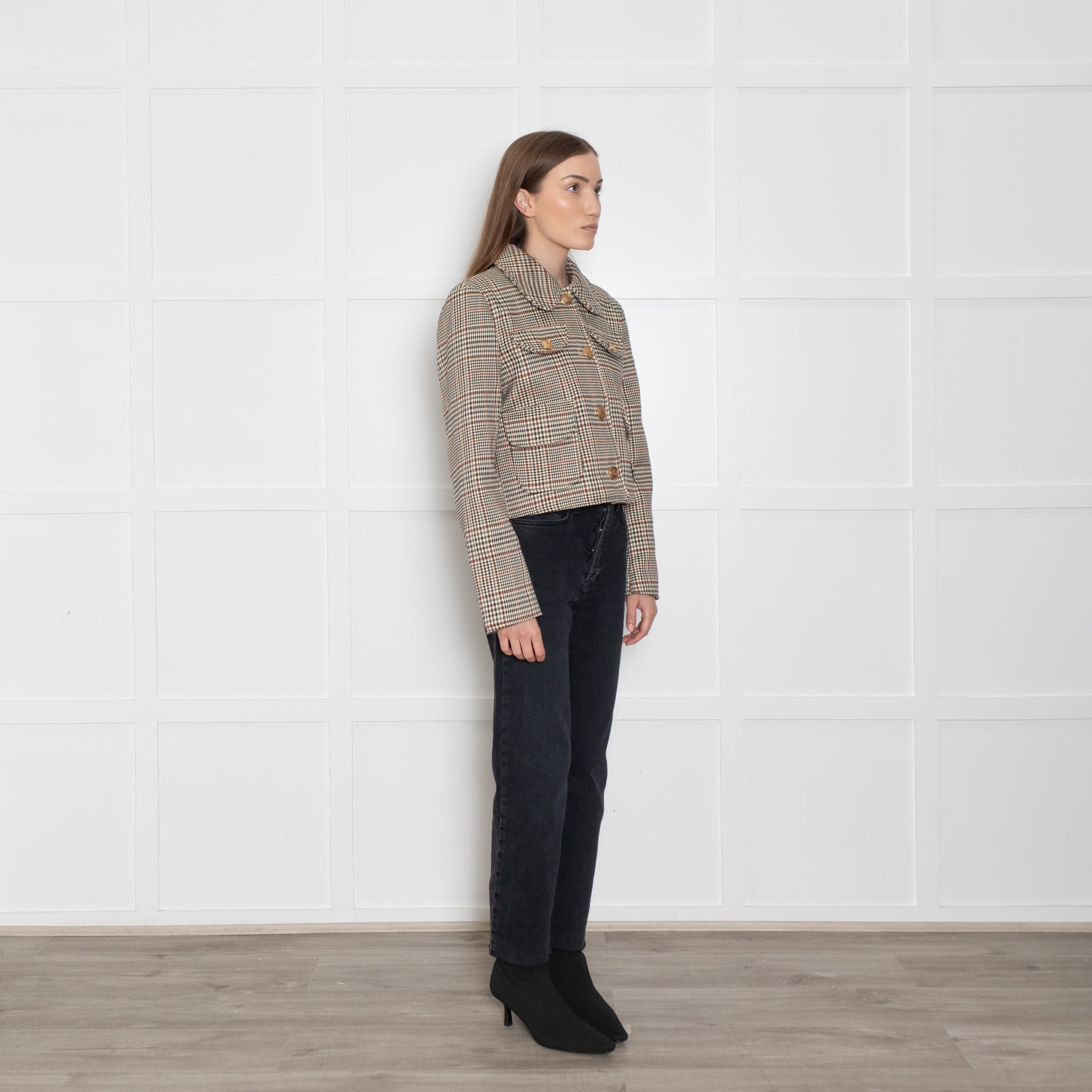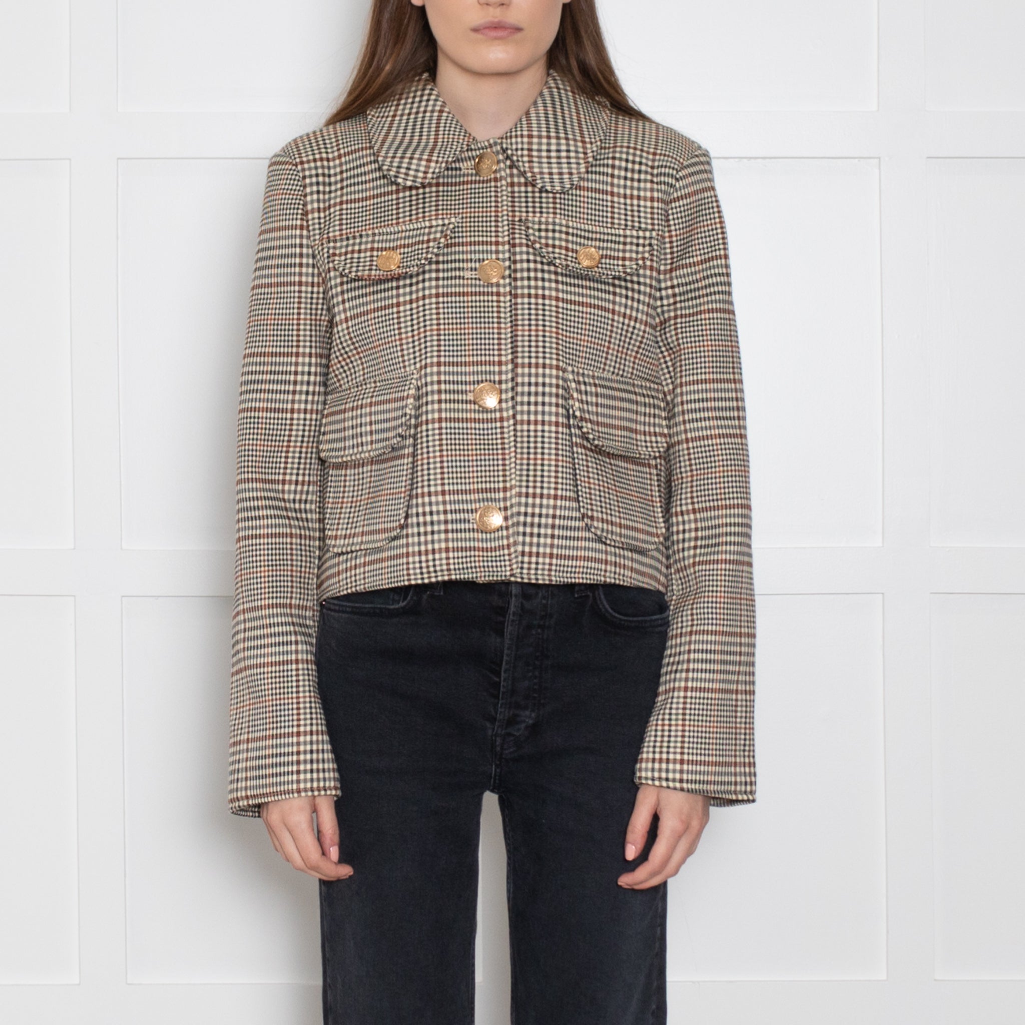 Avec Les Filles brown, black, and cream checked short jacket featuring gold button detailing, four symmetrical front pockets, and a classic lapel collar.