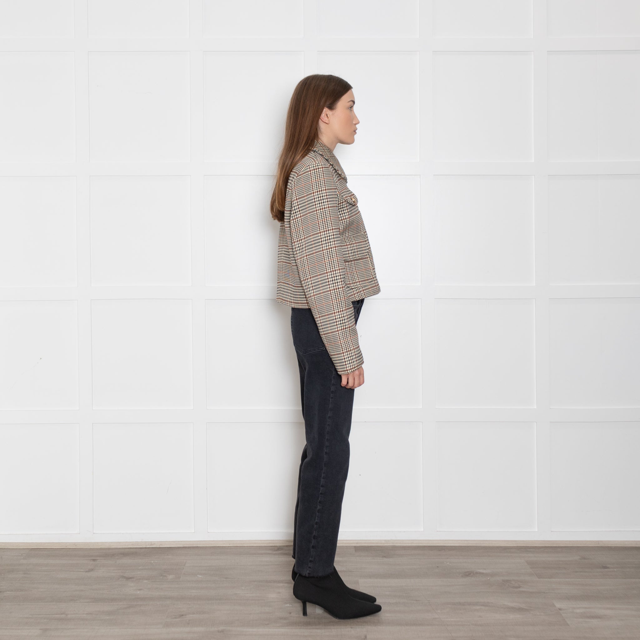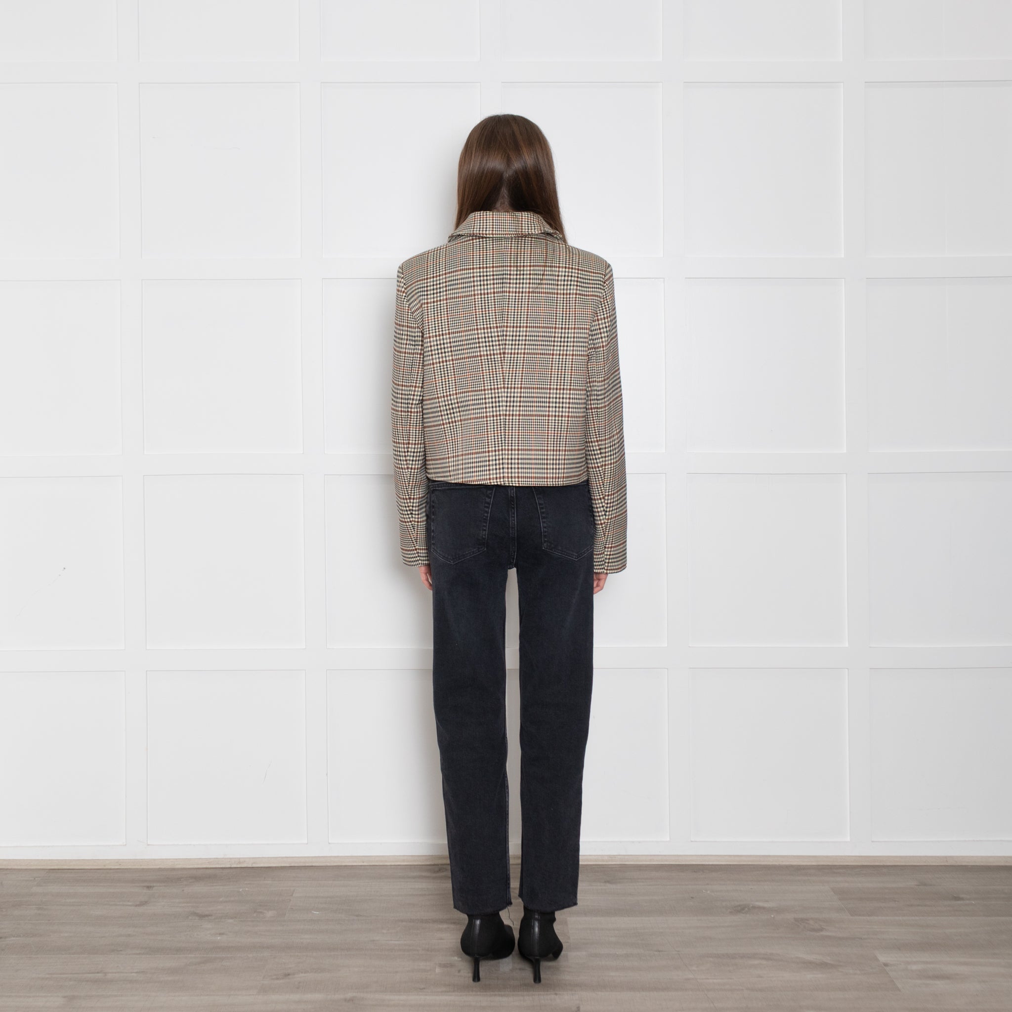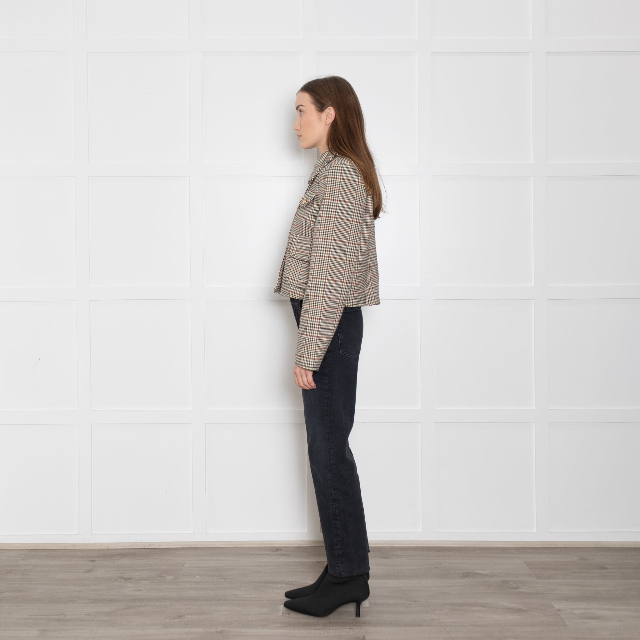 Avec Les Filles brown, black, and cream checked short jacket featuring gold button detailing, four symmetrical front pockets, and a classic lapel collar.